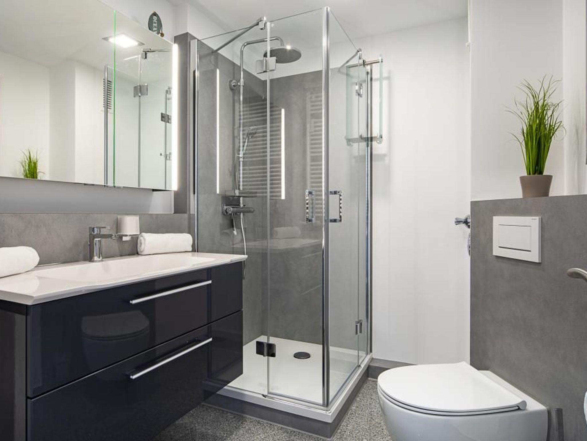 Die separate Küche, mit Essplatz für 3 Personen ist komplett ausgestattet und lässt keine Wünsche offen. Im Wohnbereich finden Sie alles, was man zur Entspannung benötigt, ein ansprechendes großes Sofa, welches in wenigen Handgriffen zu einem bequemen Schlafsofa umgestaltet werden kann, sowie einen bequemen Sessel samt Fußhocker. Vom Wohnzimmer, mit Smart-TV, Digital-Radio mit Bluetooth-Funktion und kostenfreiem WLAN, gelangt man auf den schönen Balkon mit seitlichem Meerblick. Im Schlafzimmer stehen Ihnen ein bequemes Boxspringbett, ein Sessel, der zu einem Einzelbett umgestaltet werden kann, ein geräumiger Schrank sowie ein Wand-Flach-TV zur Verfügung. Sie können das Schlafzimmer durch die Außenrollläden komplett verdunkeln. Das Badezimmer verfügt über eine Dusche mit niedrigem Einstieg und einen zusätzlichen Handtuchtrockner.