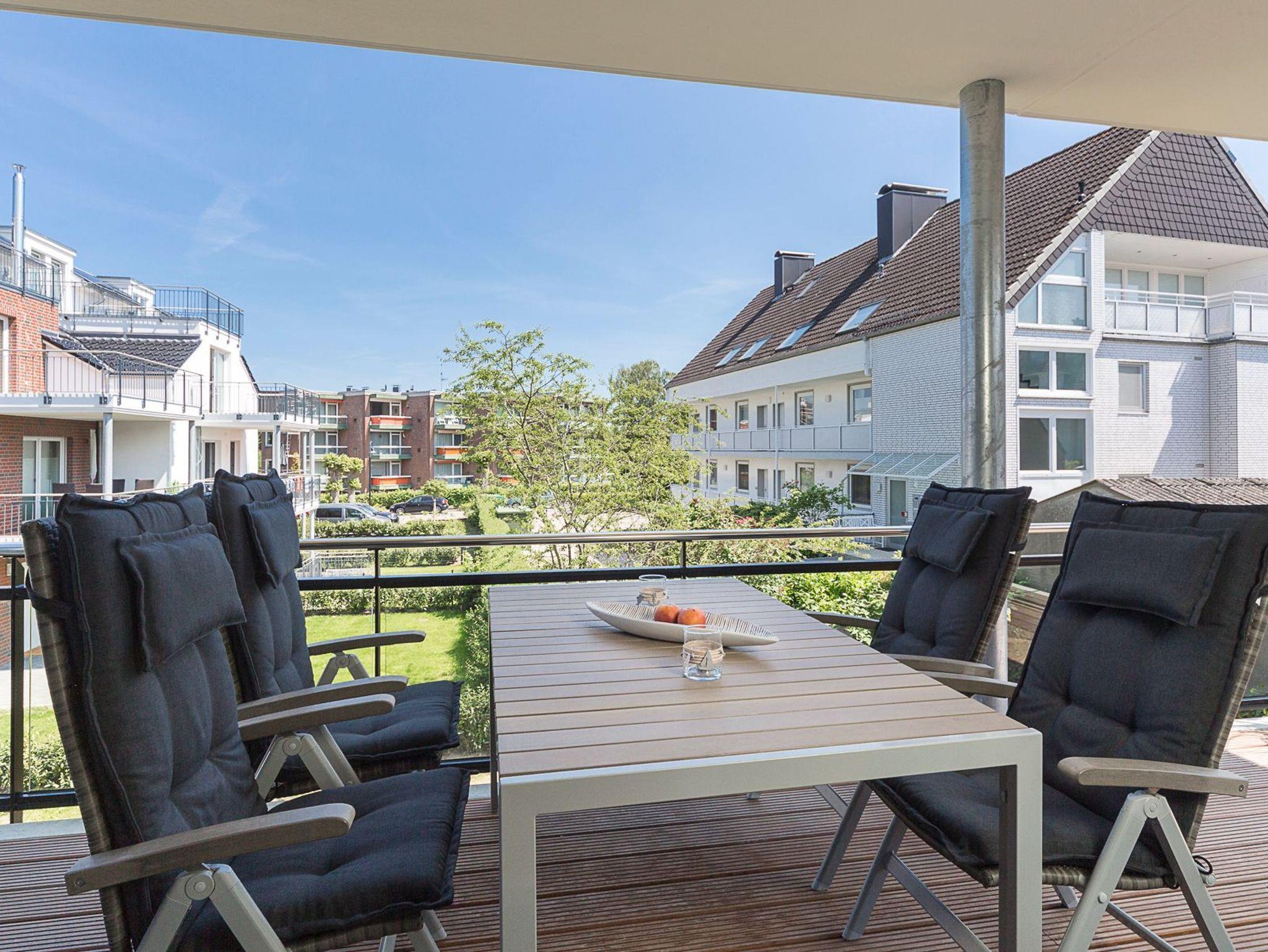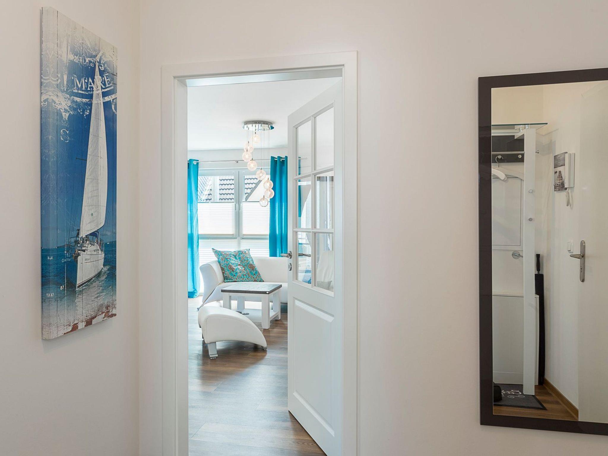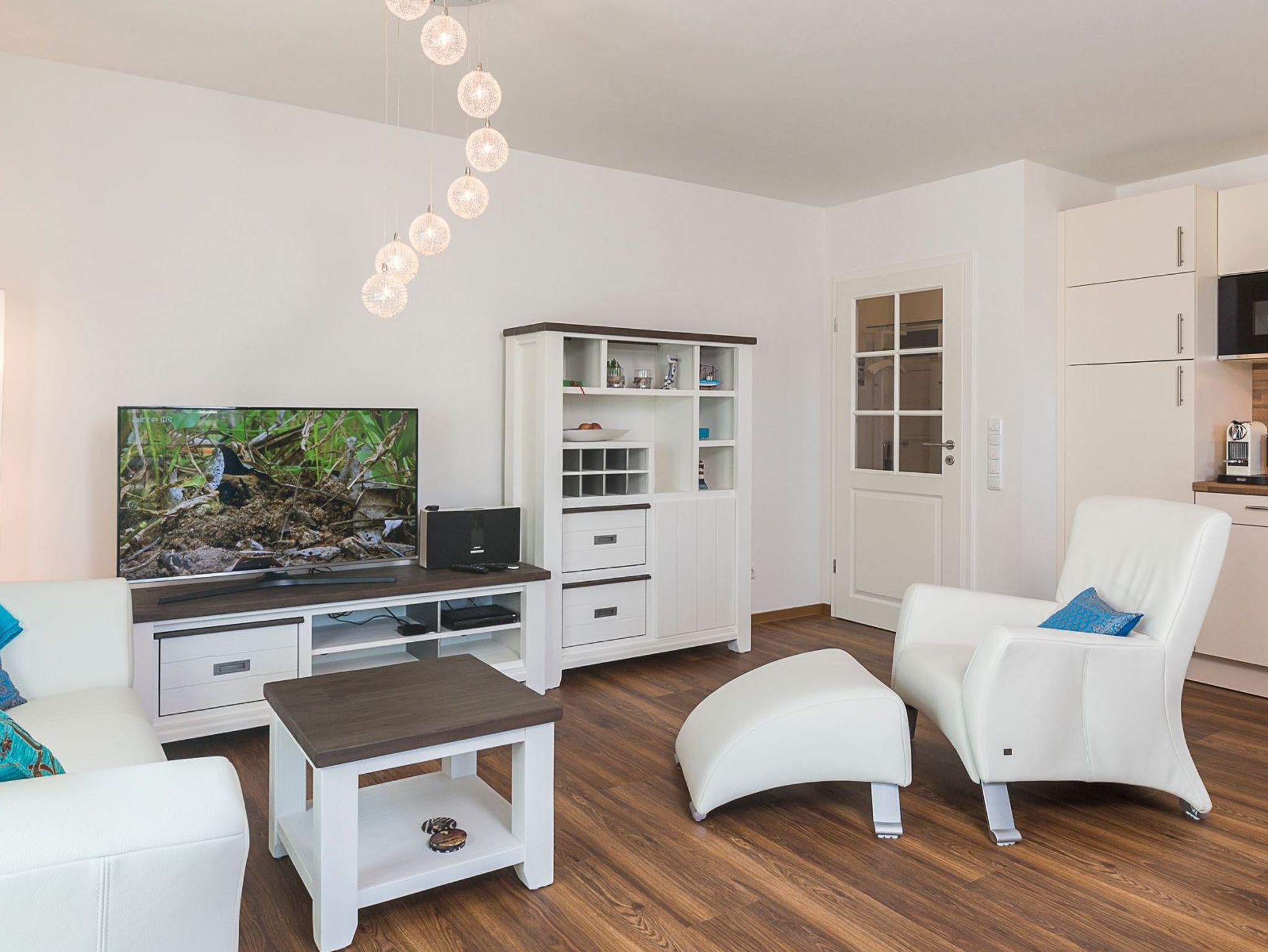Die Ferienwohnung bietet Ihnen einen gemütlichen Wohn-Essbereich mit einer Rolf-Benz-Sitzgarnitur und einem schönen Esstisch. Neben dem Flachbildfernseher (mit angeschlossenem Apple-TV) stehen ihnen eine Bose Sound Touch 30 Musikanlage, ein Blu-ray-Player und Sky-Fernsehen (inkl. Bundesliga und Champions League) zur Verfügung. Kostenloses WLAN ist selbstverständlich. In der modernen Küche, die keine Wünsche offen lässt, finden Sie außerdem eine DeLonghi-Nespresso-Maschine mit Milchaufschäumer. Das helle Tageslichtbad ist mit einer bodentiefen Regendusche ausgestattet. Neben der Fußbodenheizung ist hier ein zusätzlicher Handtuchheizkörper angebracht. Der große überdachte Balkon in Südostausrichtung verfügt über einen Tisch mit Stühlen sowie einen Strandkorb. Das Schlafzimmer im maritimen Stil verwöhnt Sie mit Betten mit bequemen Kaltschaummatratzen (1,80 x 2,00m) in unterschiedlichen Härtegraden und einem Flachbildfernseher. Für einen erholsamen Schlaf sind Verdunkelungsplissees angebracht.