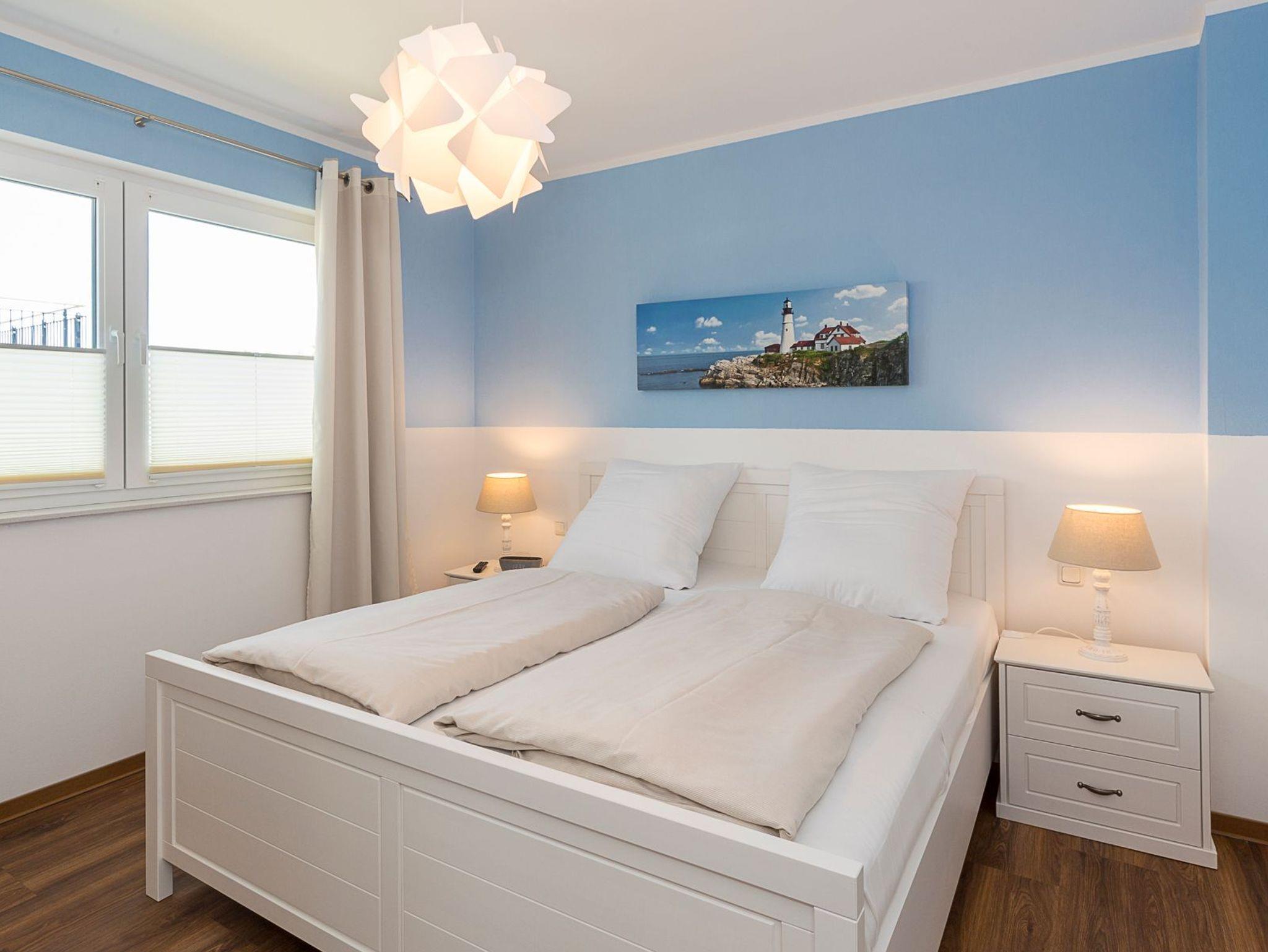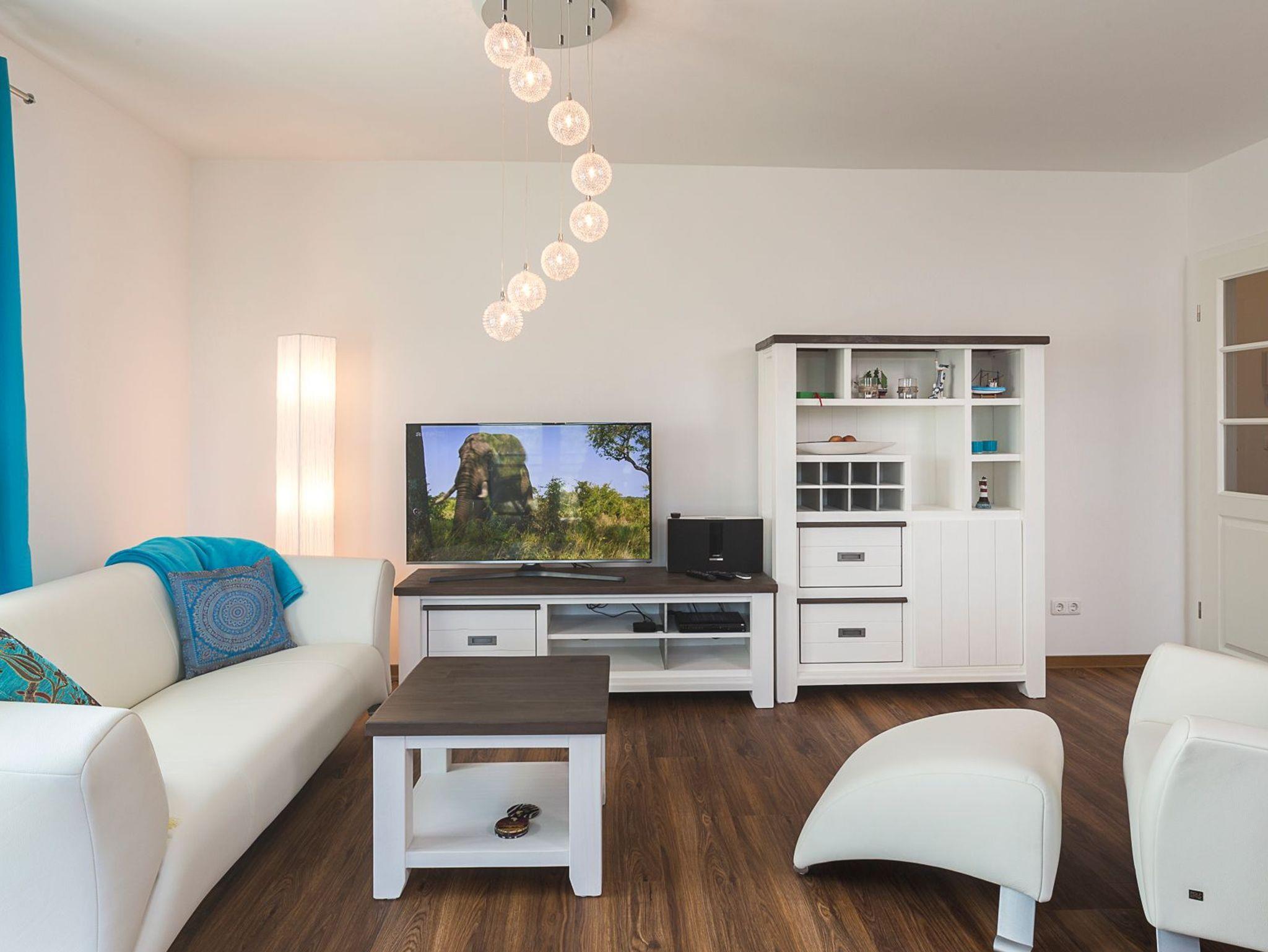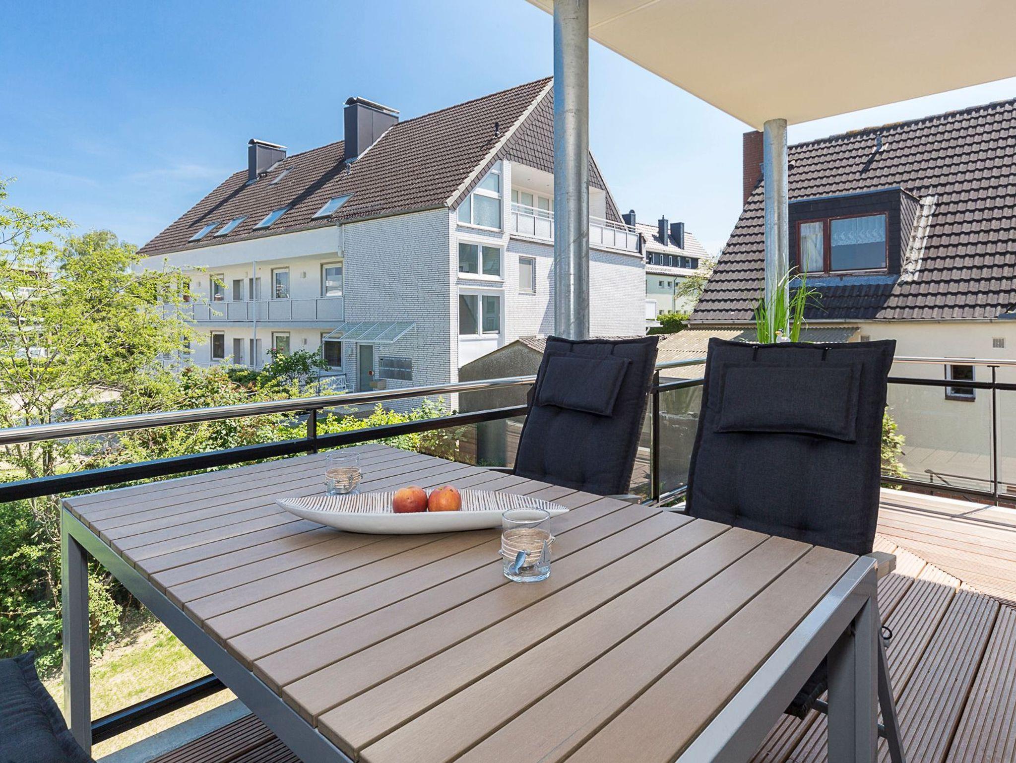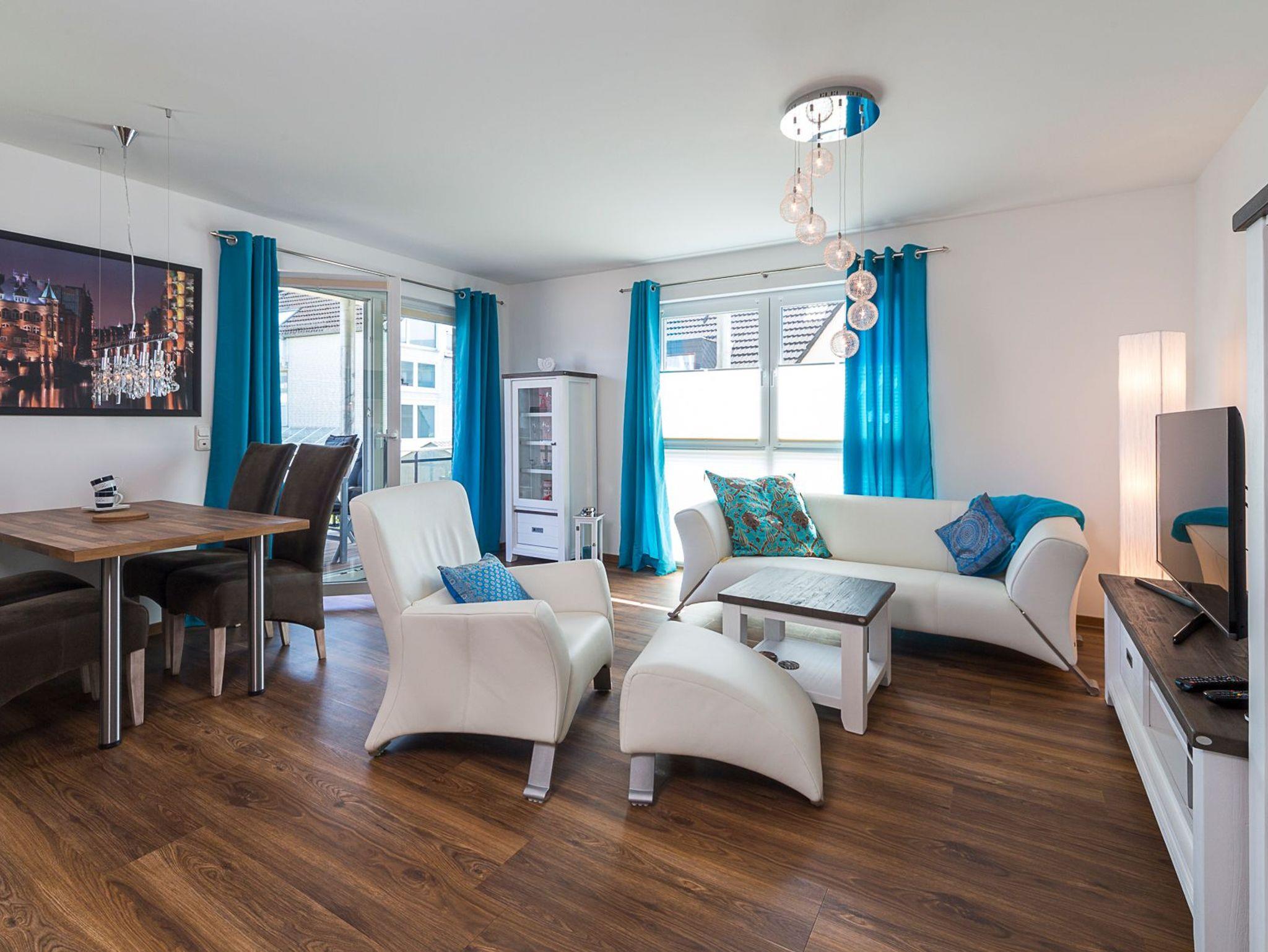 Die Ferienwohnung bietet Ihnen einen gemütlichen Wohn-Essbereich mit einer Rolf-Benz-Sitzgarnitur und einem schönen Esstisch. Neben dem Flachbildfernseher (mit angeschlossenem Apple-TV) stehen ihnen eine Bose Sound Touch 30 Musikanlage, ein Blu-ray-Player und Sky-Fernsehen (inkl. Bundesliga und Champions League) zur Verfügung. Kostenloses WLAN ist selbstverständlich. In der modernen Küche, die keine Wünsche offen lässt, finden Sie außerdem eine DeLonghi-Nespresso-Maschine mit Milchaufschäumer. Das helle Tageslichtbad ist mit einer bodentiefen Regendusche ausgestattet. Neben der Fußbodenheizung ist hier ein zusätzlicher Handtuchheizkörper angebracht. Der große überdachte Balkon in Südostausrichtung verfügt über einen Tisch mit Stühlen sowie einen Strandkorb. Das Schlafzimmer im maritimen Stil verwöhnt Sie mit Betten mit bequemen Kaltschaummatratzen (1,80 x 2,00m) in unterschiedlichen Härtegraden und einem Flachbildfernseher. Für einen erholsamen Schlaf sind Verdunkelungsplissees angebracht.