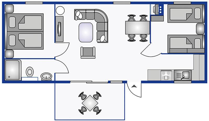 Unser Strand Ferienhaus verfügt über 40qm Wohnfläche, aufgeteilt in 3 Zimmer mit Platz für insgesamt 4 Personen. Hier findet ihr: einen Wohnraum mit Sofa-Sitzecke, einen Esstisch, eine Küchenzeile (mit Backofen/ Mikrowelle, Spülmaschine), ein Doppelzimmer, sowie ein 2-Bettzimmer. Im Badzimmer sind eine Dusche, ein Waschbecken, ein WC und ein Haartrockner vorhanden. Die überdachte Veranda lädt mit Sitzmöbeln und einem Grill ein. Ein Strandkorb steht am Ferienhaus.