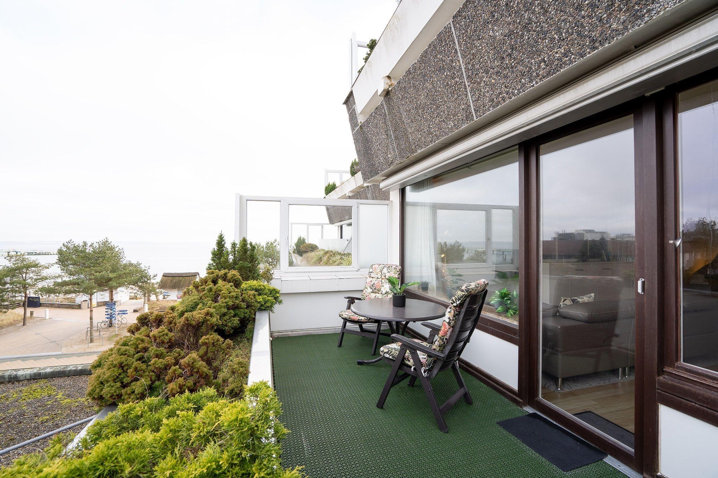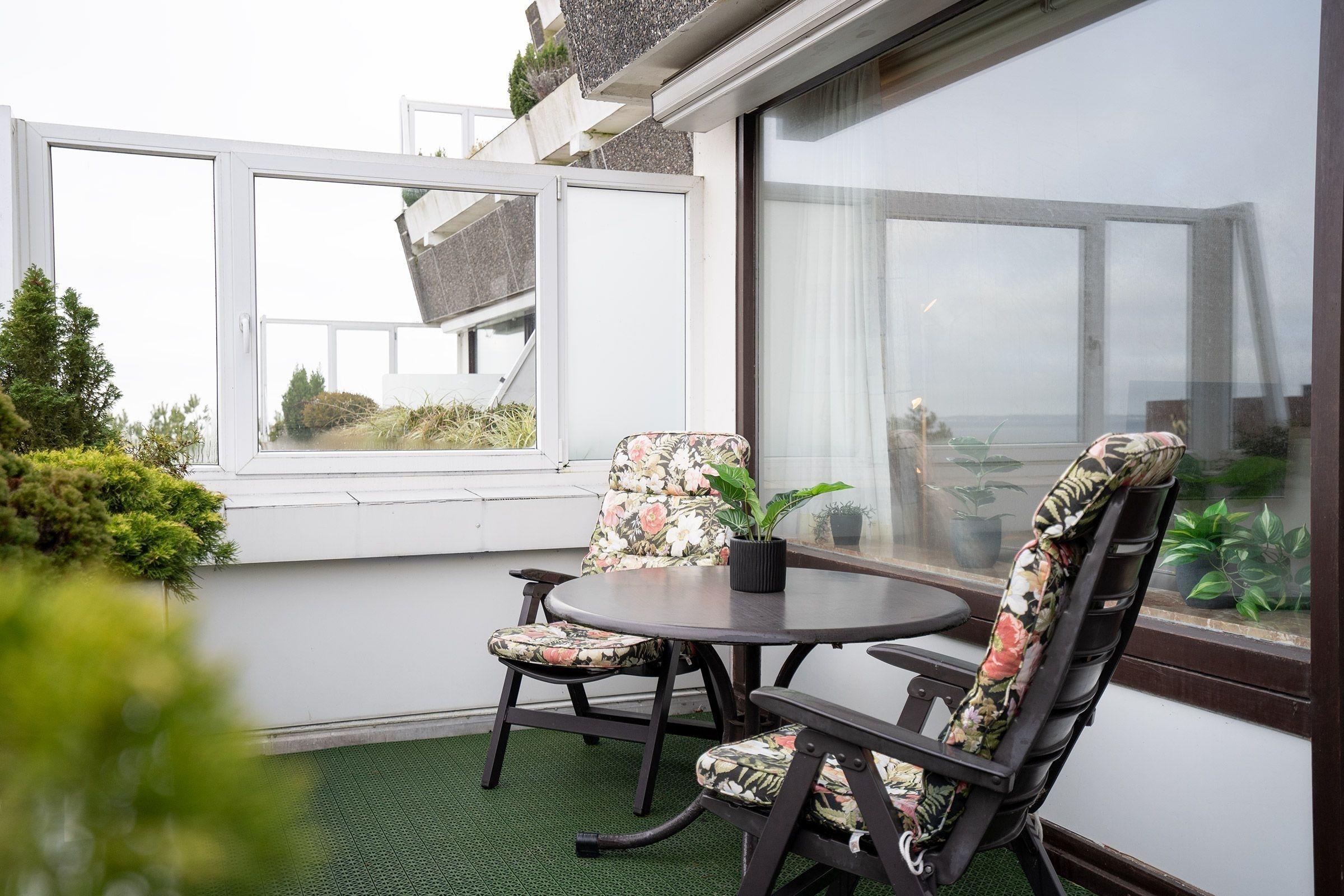 Die große Sonnenterrasse bietet einen schönen Blick auf das Meer und ist mit einer Markise und Balkonmöbeln ausgestattet.