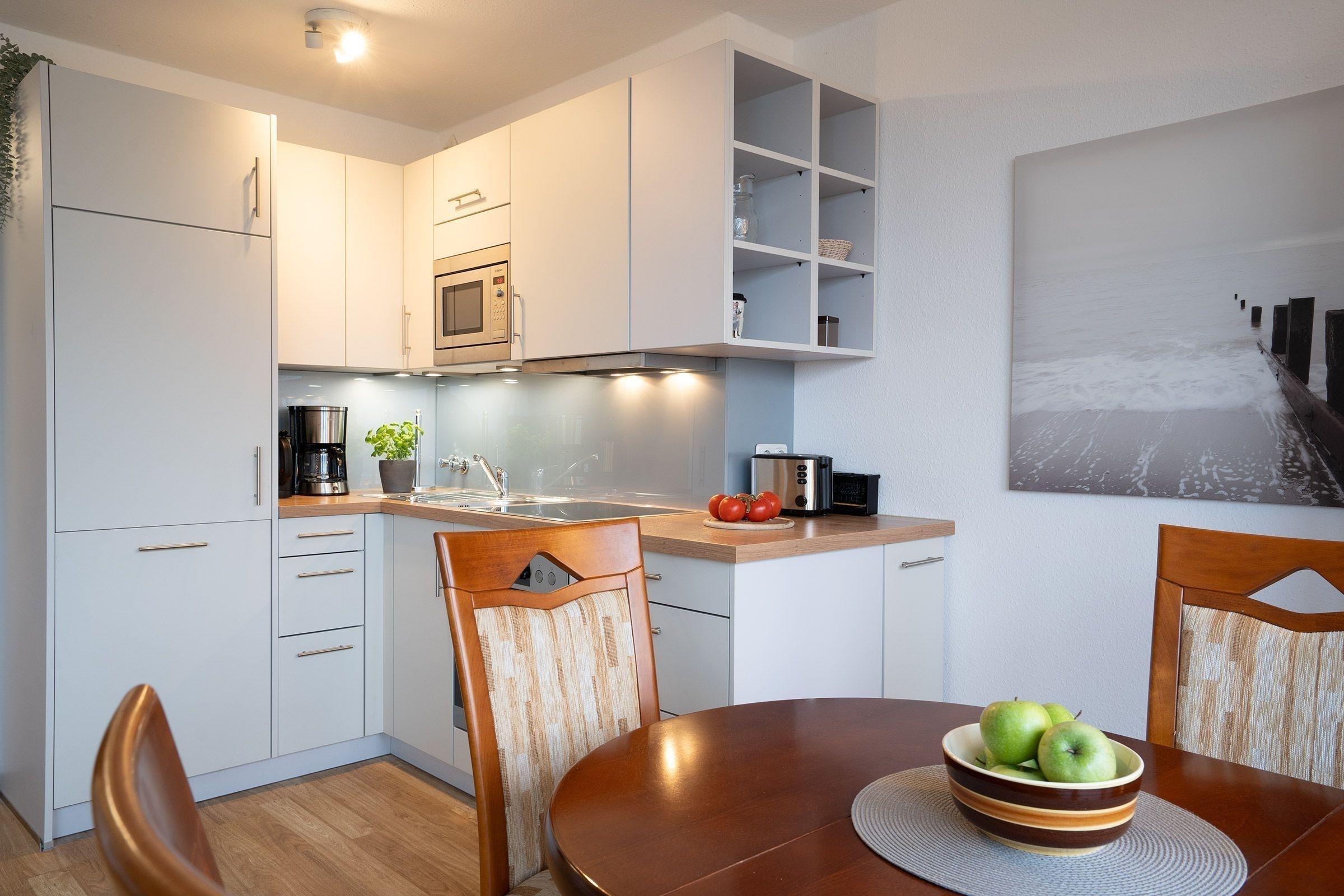 Der Wohnraum ist mit einem Designbodenbelag in Holzoptik ausgelegt. Es gibt eine Ledergarnitur mit einem Sessel, Couchtisch, Flachbild-TV sowie ein Schrankbett. Die WLAN-Nutzung ist inkl. (bei Störung kein Ersatzanspruch). In der Einbauküche finden sich ein Geschirrspüler, Mikrowelle nebst Ofen. Am Essplatz ist Platz für 3 Personen.