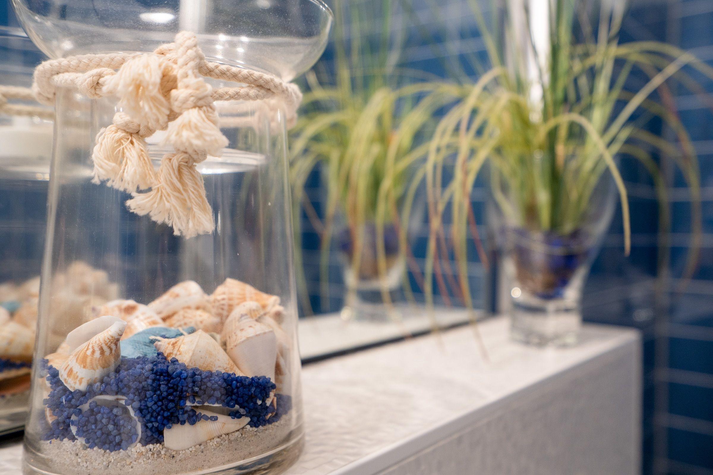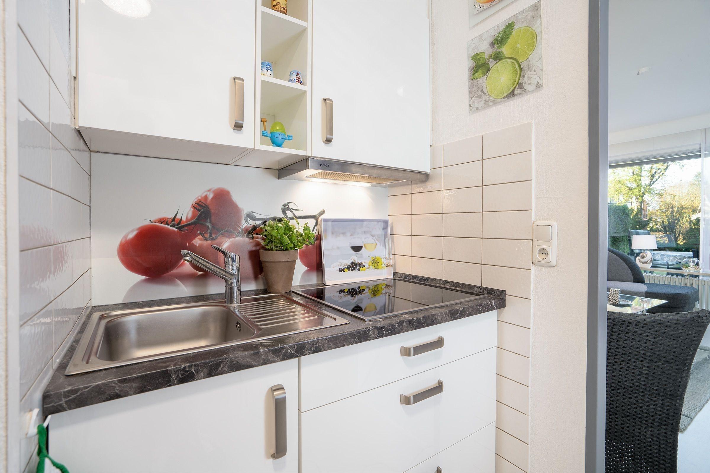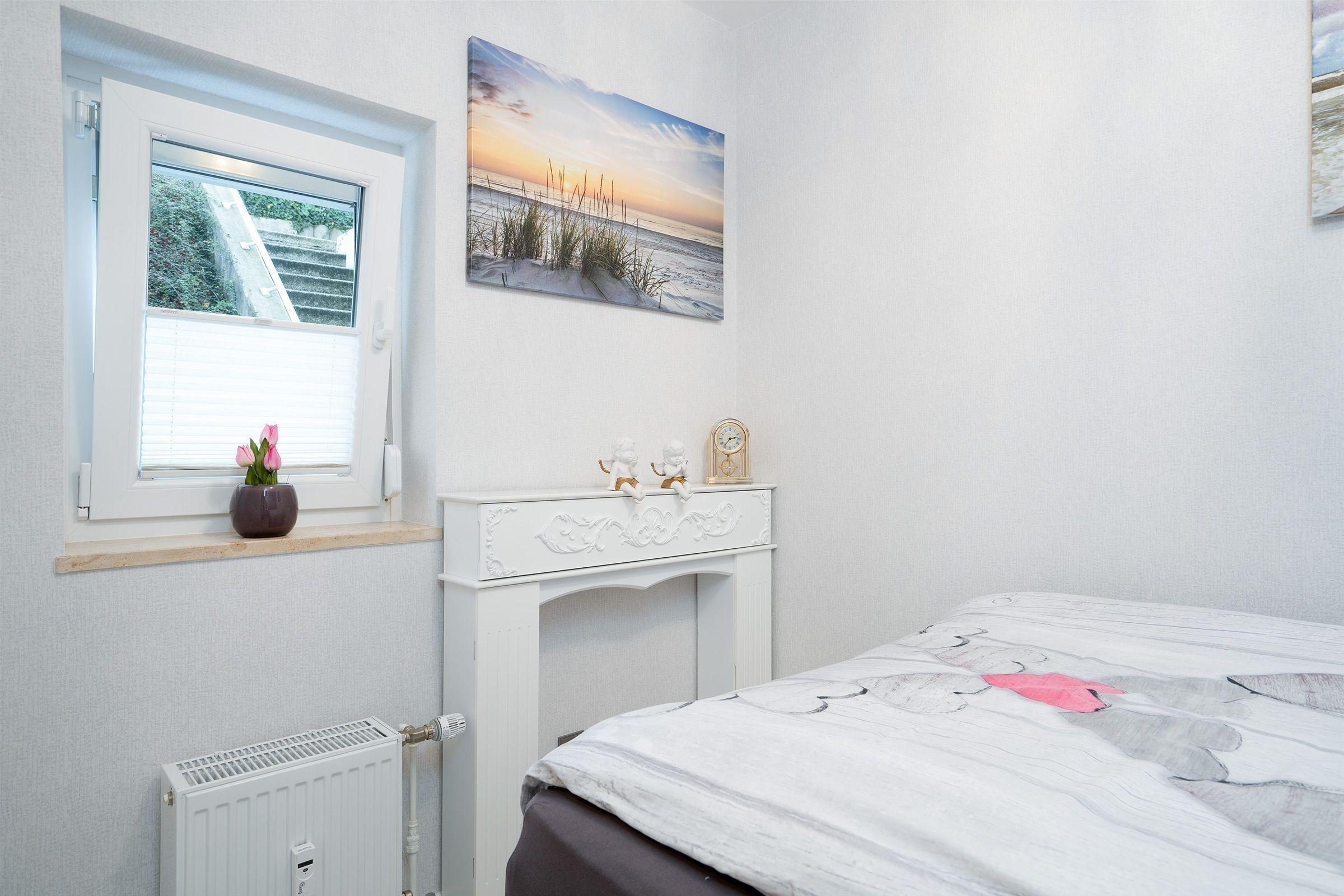 Die komplett ausgestattete Pantryküche mit klassischer Kaffeemaschine erfüllt alle Wünsche. Das Schlafzimmer ist mit einem komfortablen Boxspringbett (1,40 m x 2,00 m) ausgestattet, Rollläden sorgen für zusätzliche Verdunkelung. Das maritime Badezimmer bietet eine großzügige Dusche sowie einen Waschtisch mit WC.