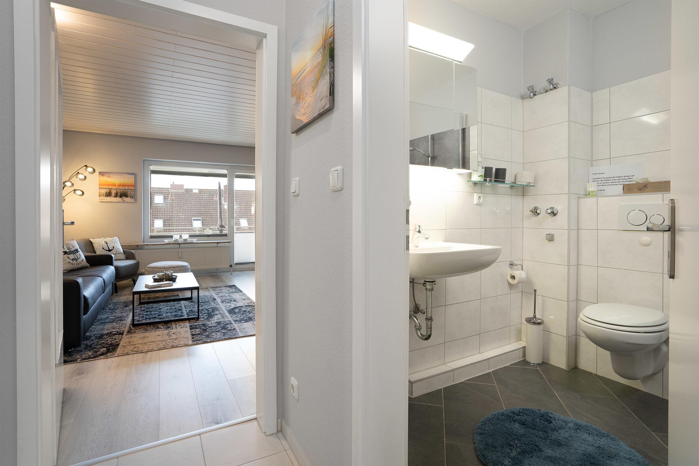 - Badezimmer: Bad mit Dusche, WC und Waschbecken, ein Fön ist ebenfalls vorhanden.