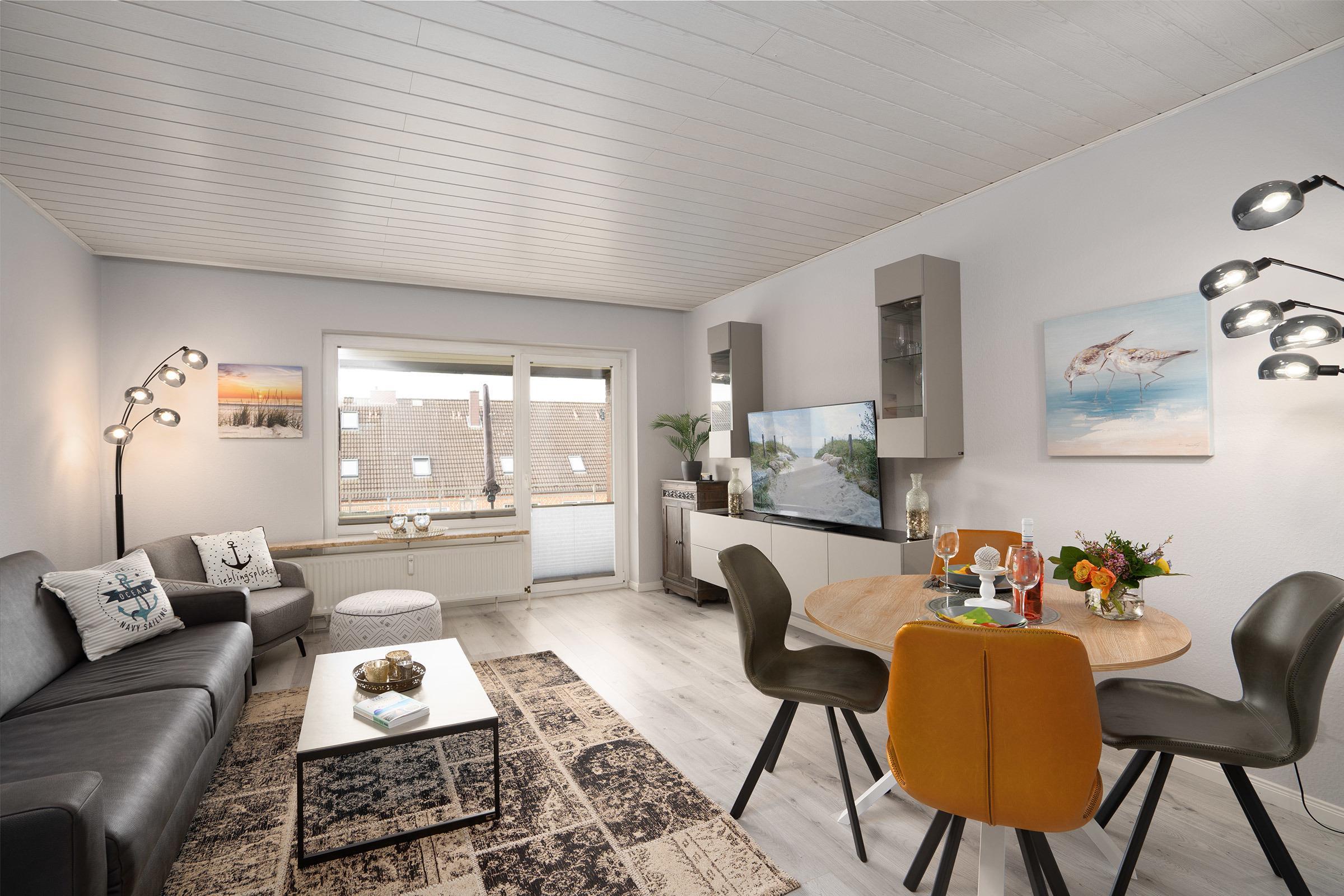 - Wohnbereich: Ein behagliches Wohnzimmer mit einem Ledersofa, Fernseher und Zugang zu einem kleinen Balkon.