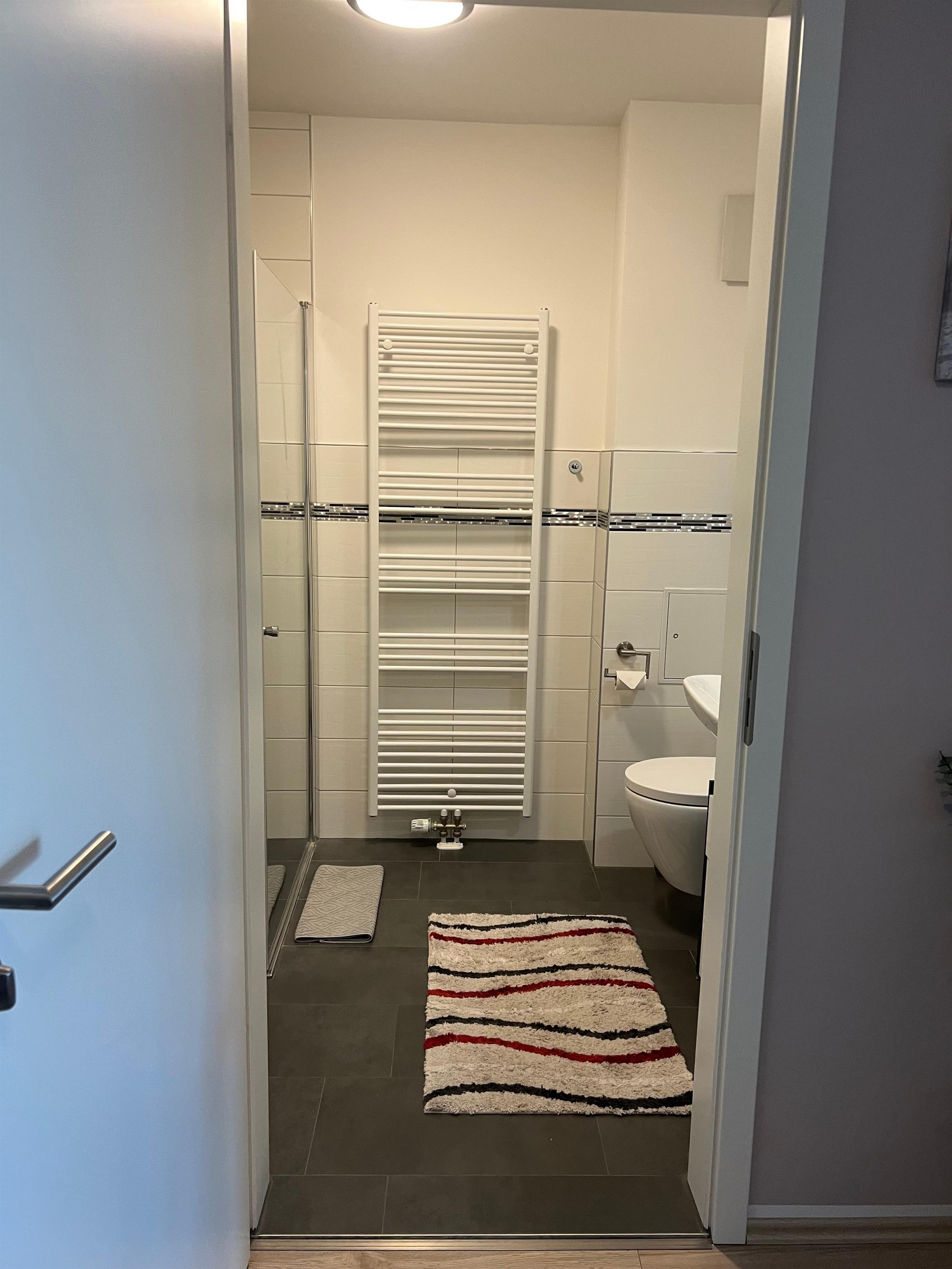 Das Badezimmer verfügt über eine Waschmaschine, einer Ebenerdigen Dusche, sowie einem Haartrockner.