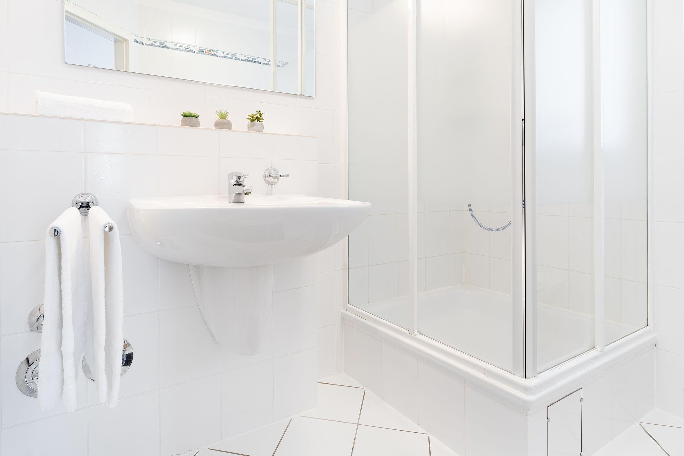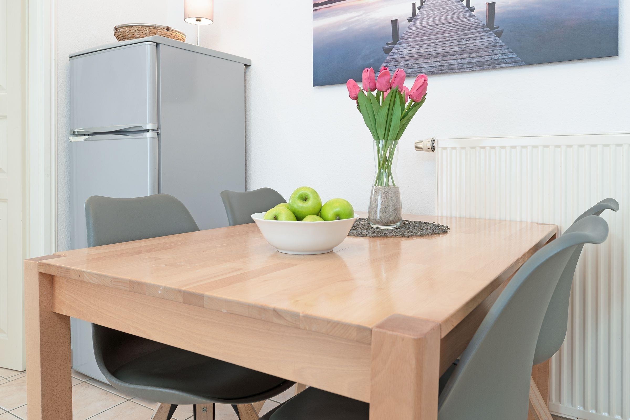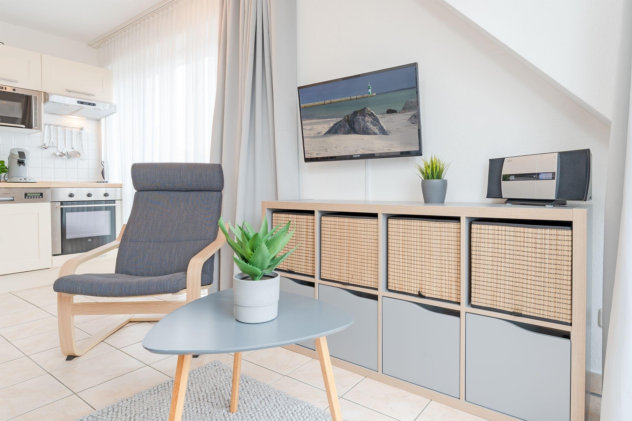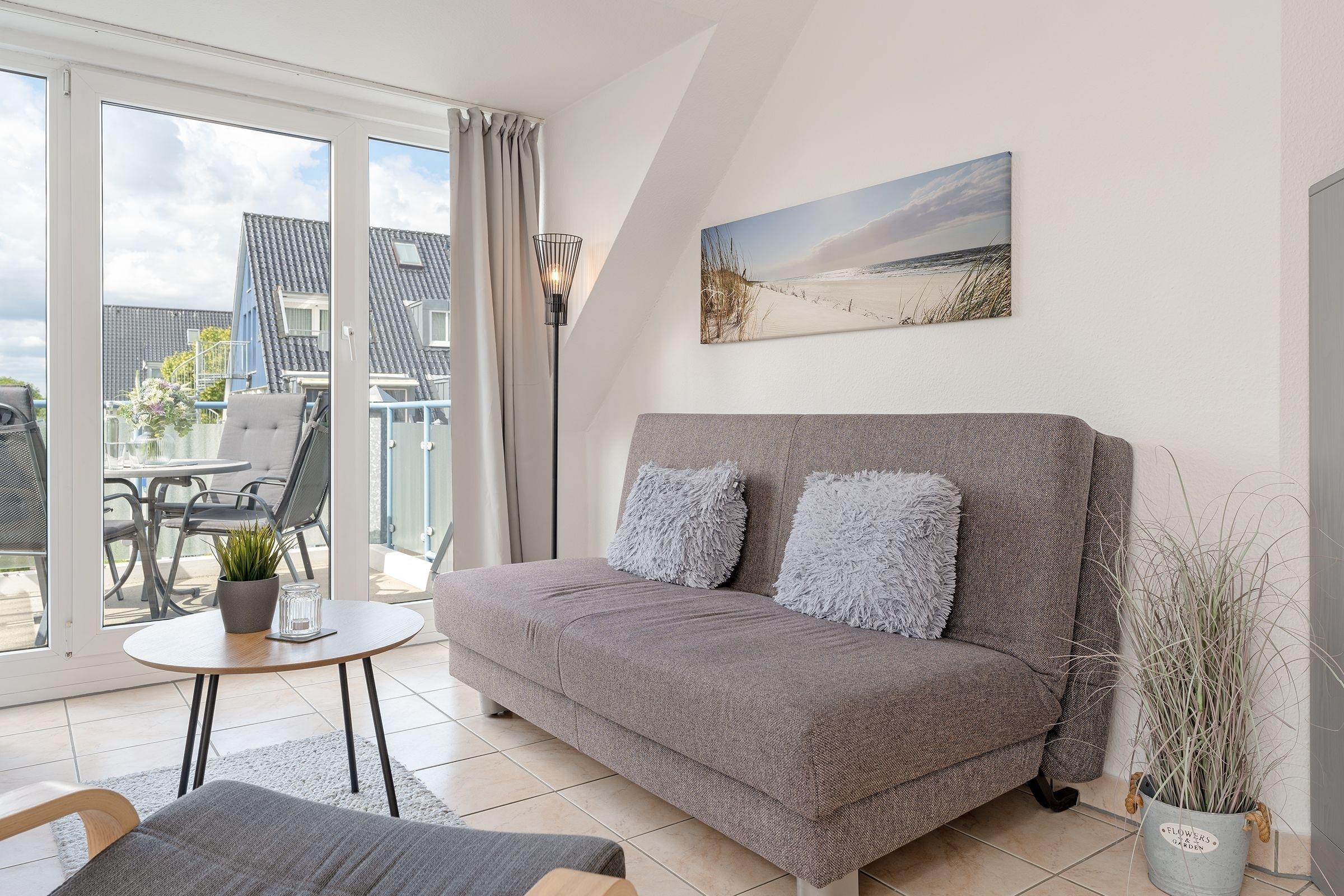 Sie erreichen Ihre Ferienwohnanlage ganz bequem mit dem Fahrstuhl. Im Wohnzimmer finden Sie eine gemütliche Sitzecke mit einer bequemen Ausziehcouch für 2 Personen sowie den Essbereich und die Küchenzeile, ein kleines Schlafzimmer mit Doppelbett (2x 90x200 cm) und ein Duschbad - es ist alles für einen entspannten Urlaub vorhanden. Erholen Sie sich auf dem möblierten Balkon mit Nord-Ausrichtung.