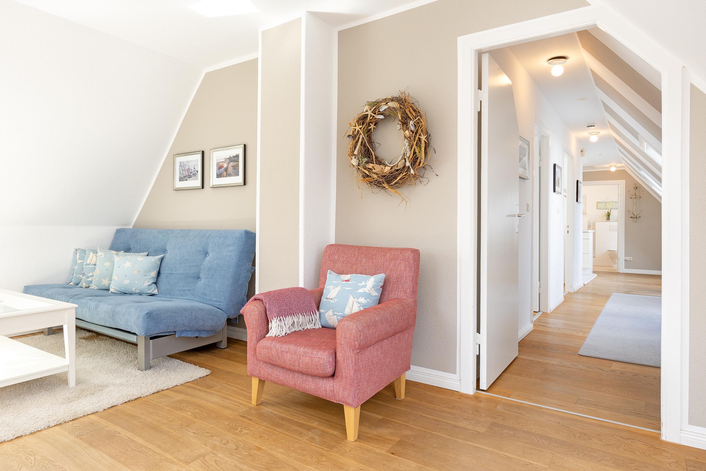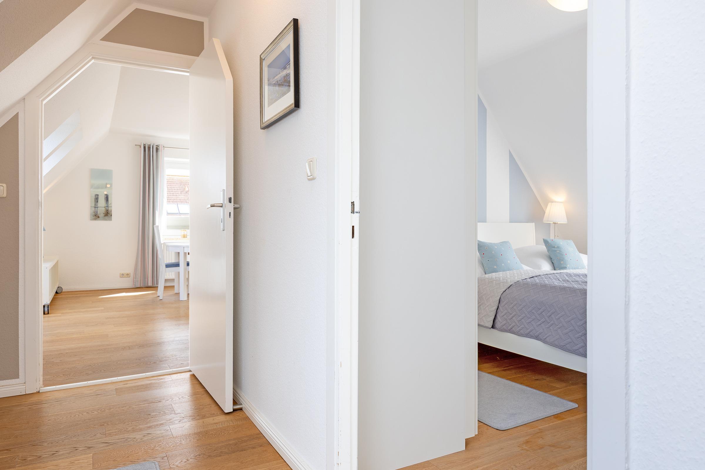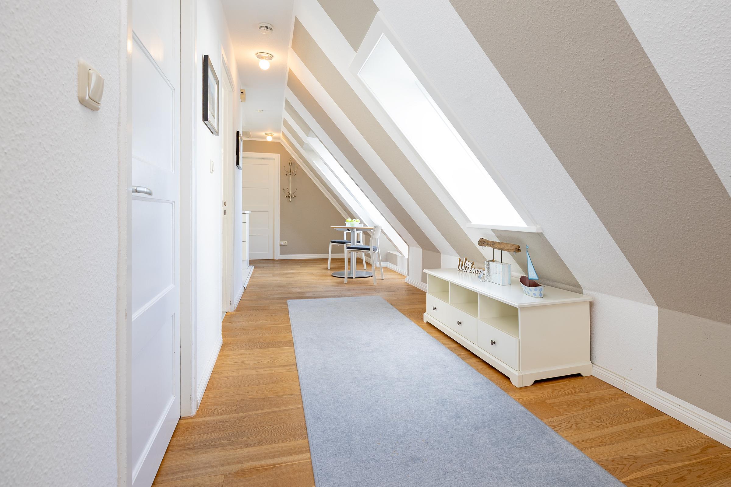 Ein langer heller Flur mit charmanten Dachschrägen und Dachfenstern verbindet die 3 Zimmer dieser Ferienwohnung.