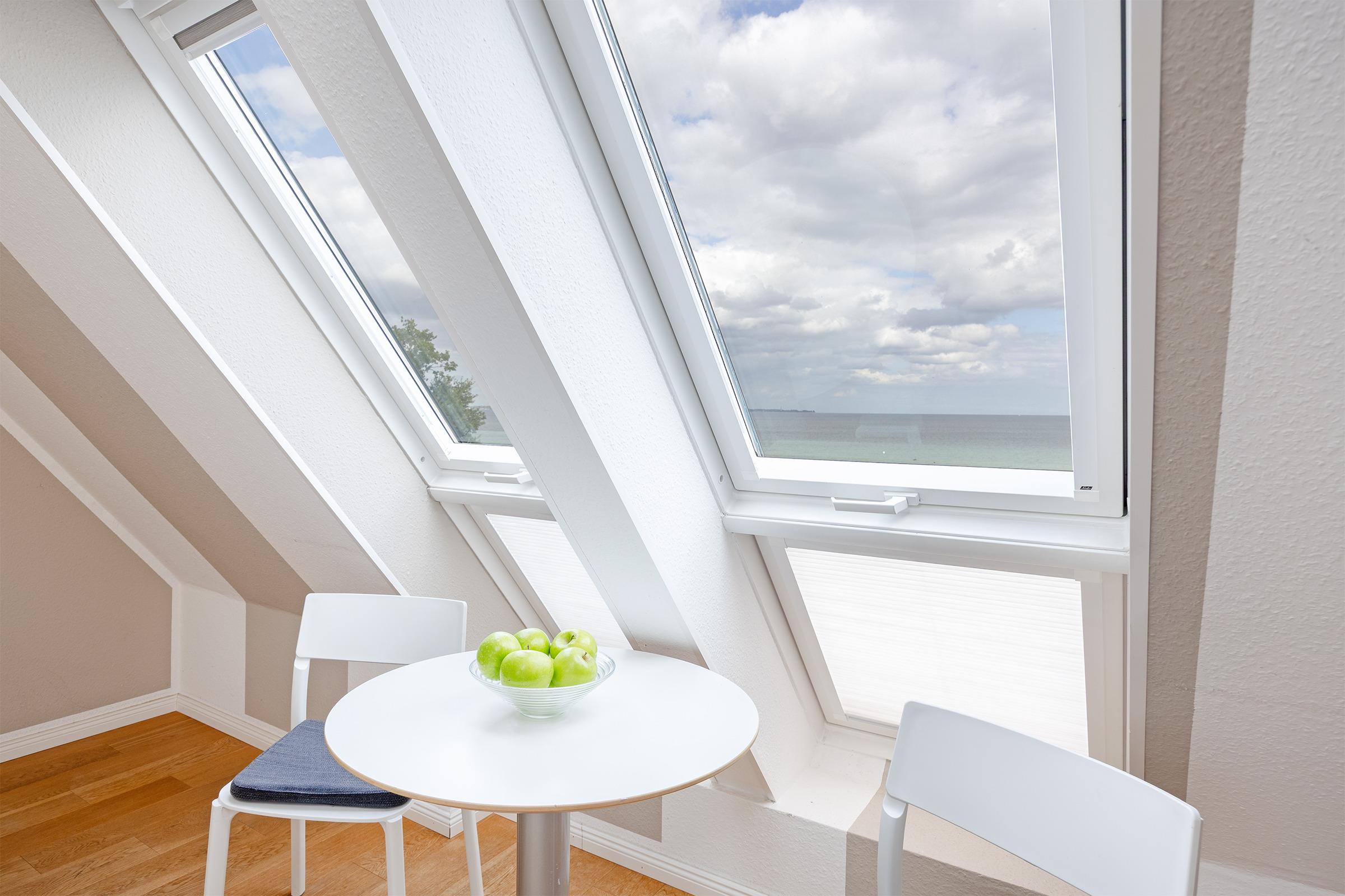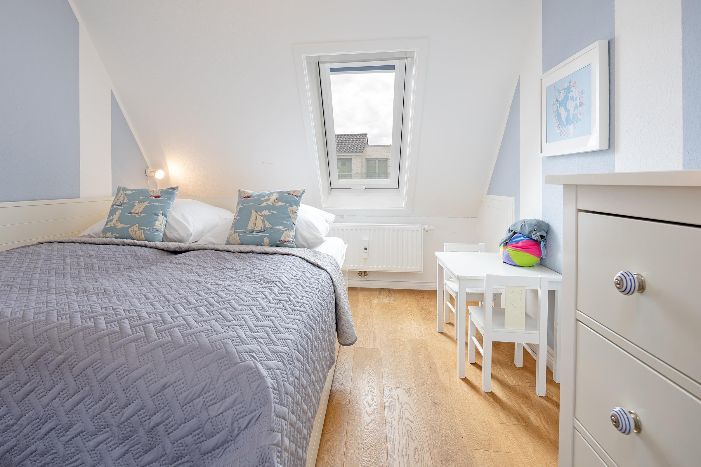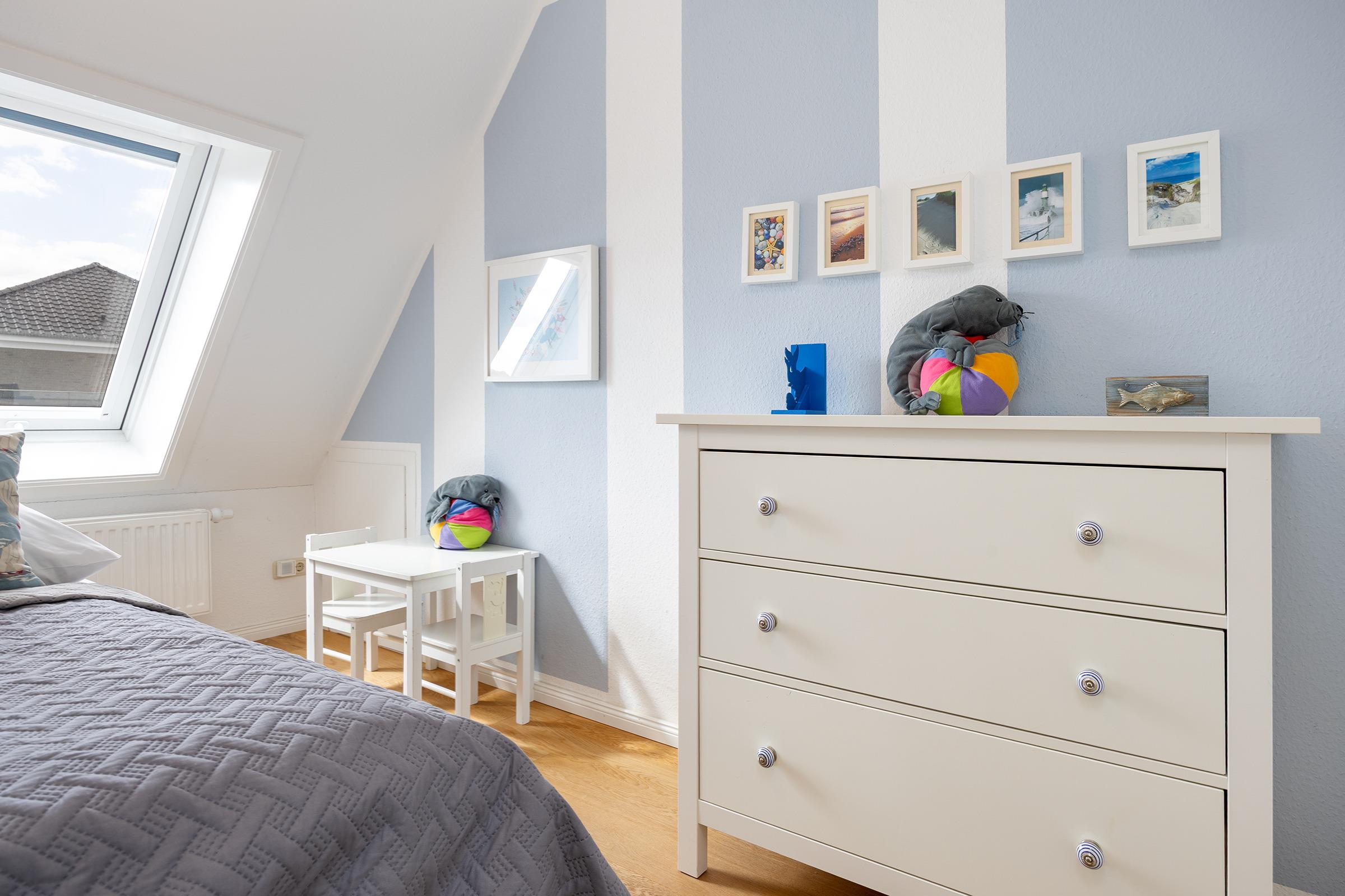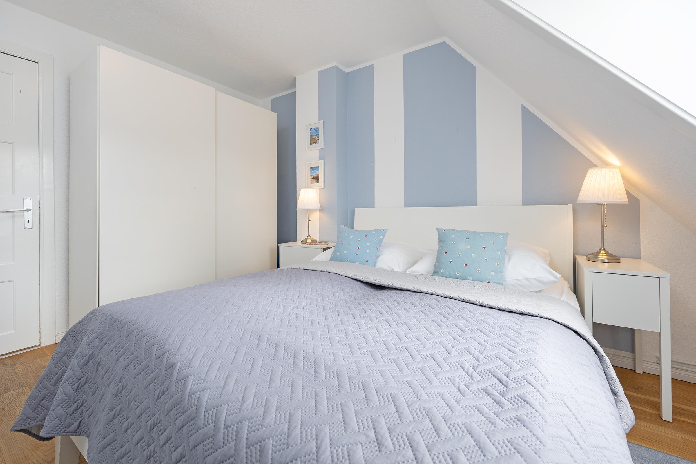 Ein langer heller Flur mit charmanten Dachschrägen und Dachfenstern verbindet die 3 Zimmer dieser Ferienwohnung.