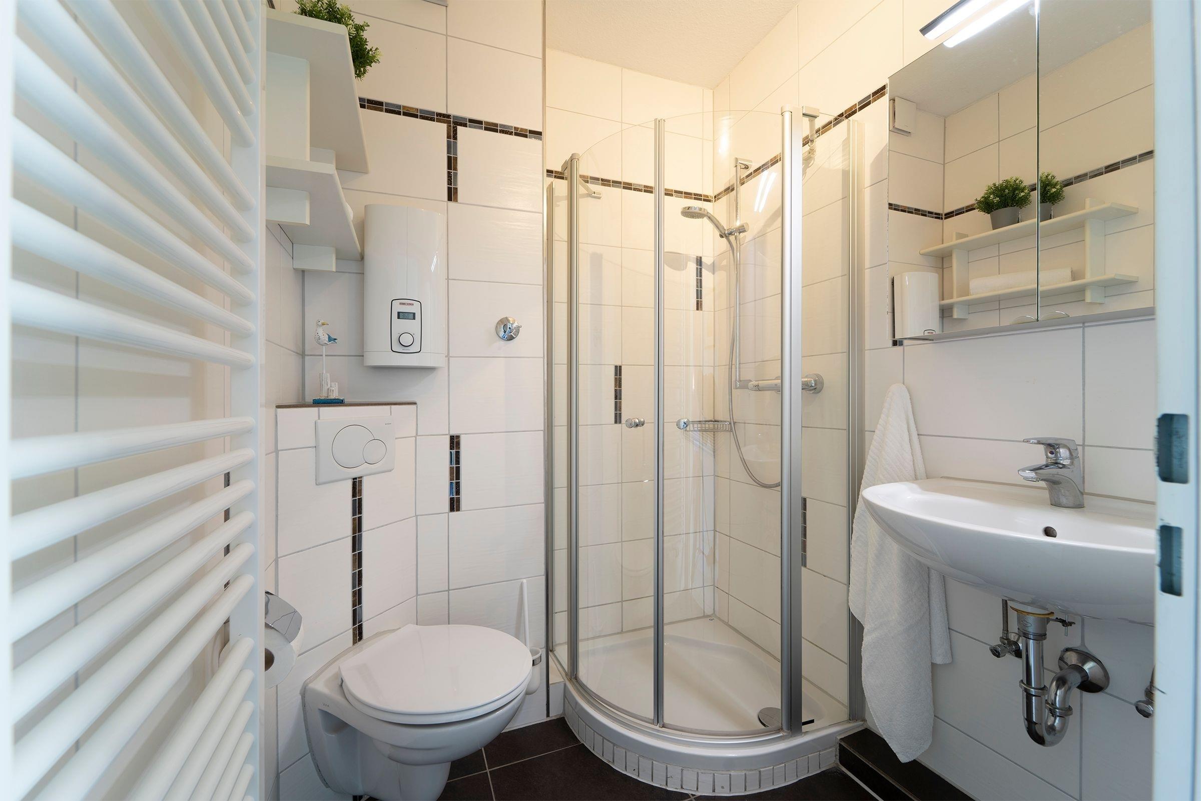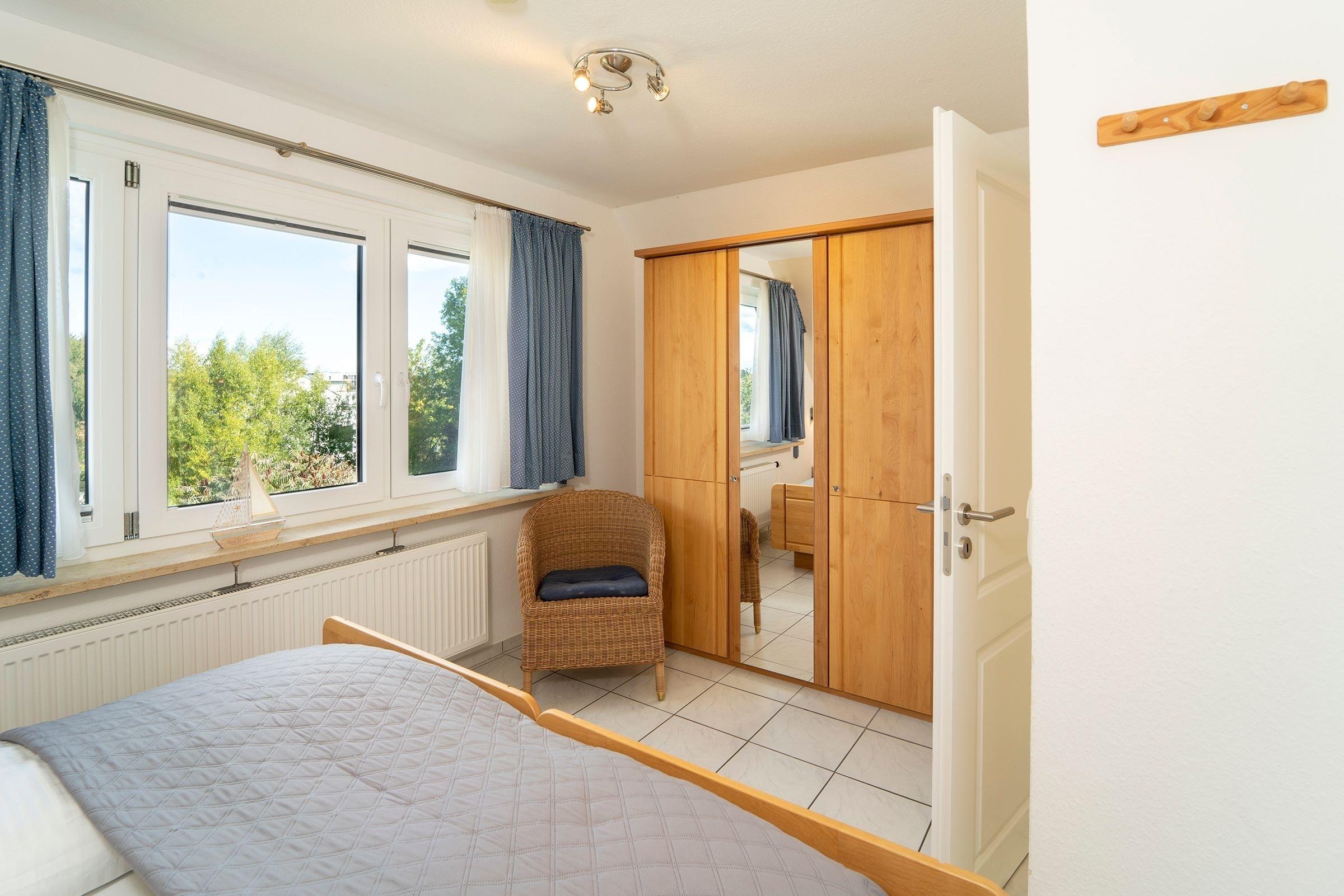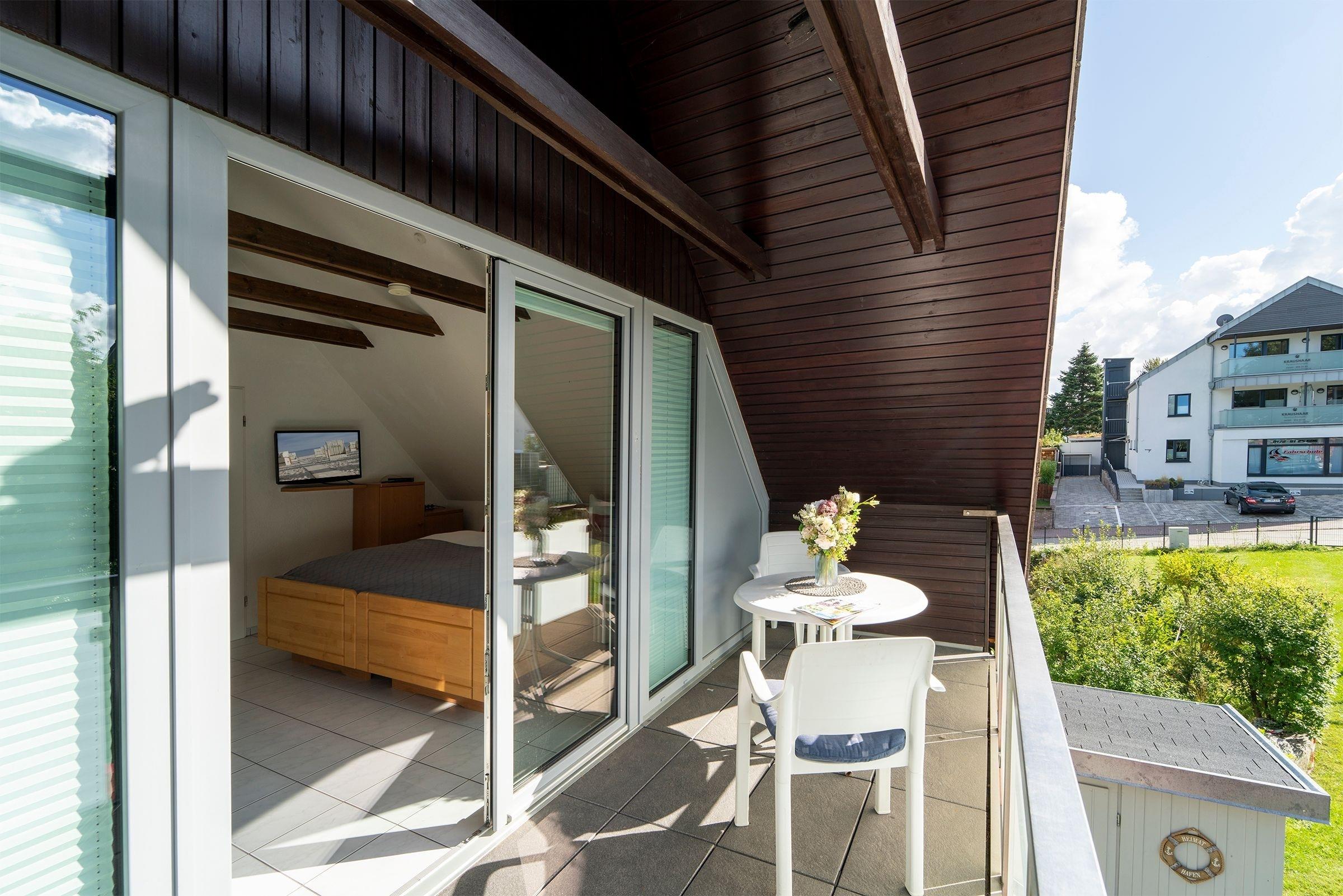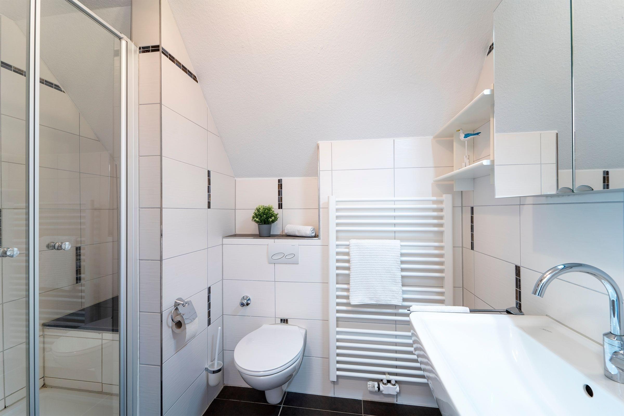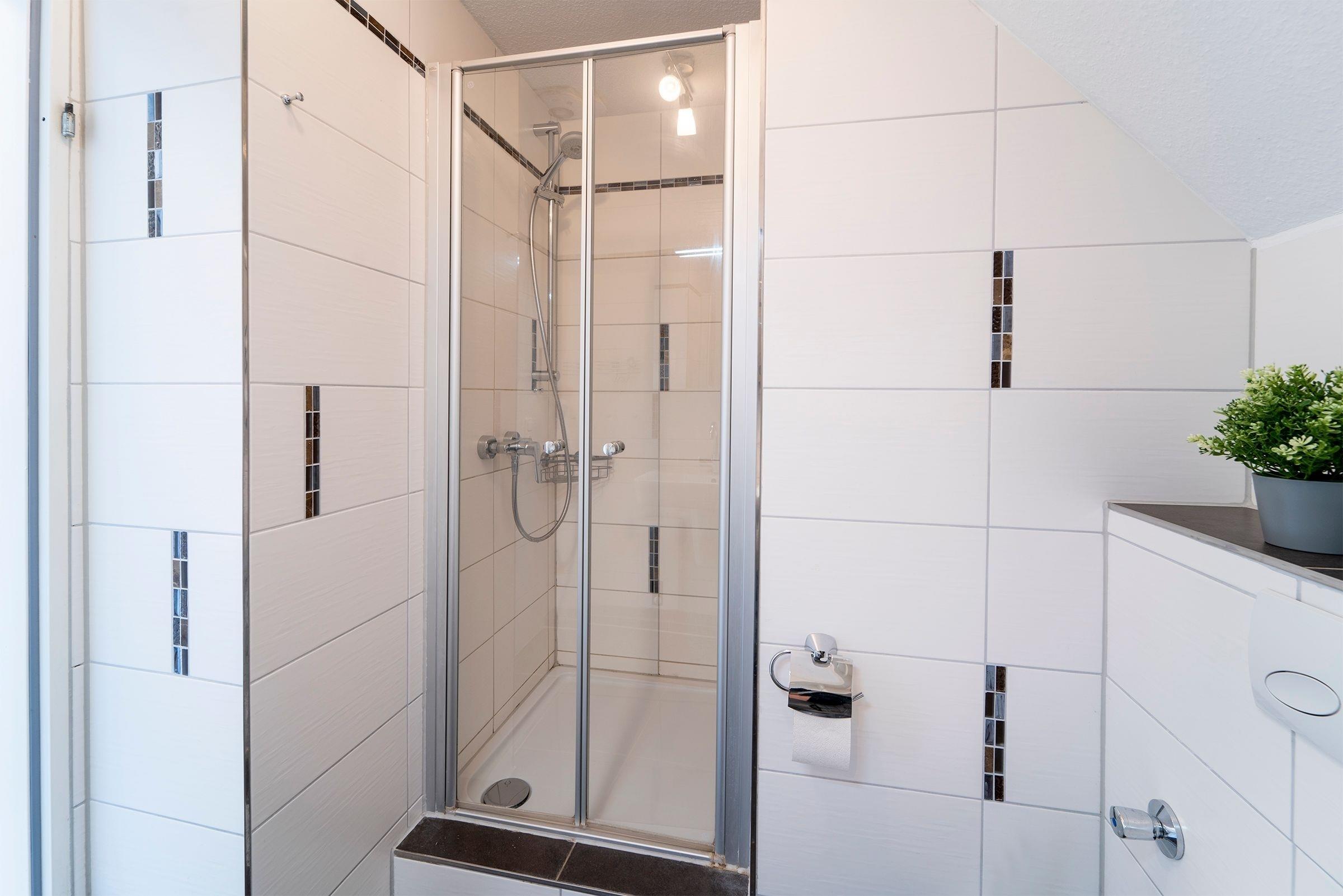 Eine Treppe hoch gelangen Sie in die anderen beiden Schlafräume der Ferienwohnung. Vom Flur aus rechts ist ein Schlafzimmer mit einem Doppelbett (2x90x200cm), Nachtschränkchen und Kleiderschrank. Hier ist auch genügend Platz ein Kinderreisebett aufzustellen. Das Schlafzimmer links vom Flur aus, ist auch ein kleiner charmanter Rückzugsort. Direkt unter dem Dach mit charmanten Dachschrägen, offenen Holzbalken wirkt der Raum sehr gemütlich. Außerdem haben Sie hier noch einen überdachten Balkon. Eingerichtet ist das Schlafzimmer mit einem Doppelbett (2x 90x200cm), Kleiderschrank und Sitzgruppe. Vom Bett aus können Sie Ihre Lieblingsfernsehsendung zu Ende sehen. In der Mitte des Flures ist das moderne Duschbad mit Handtuchwärmer und Föhn.