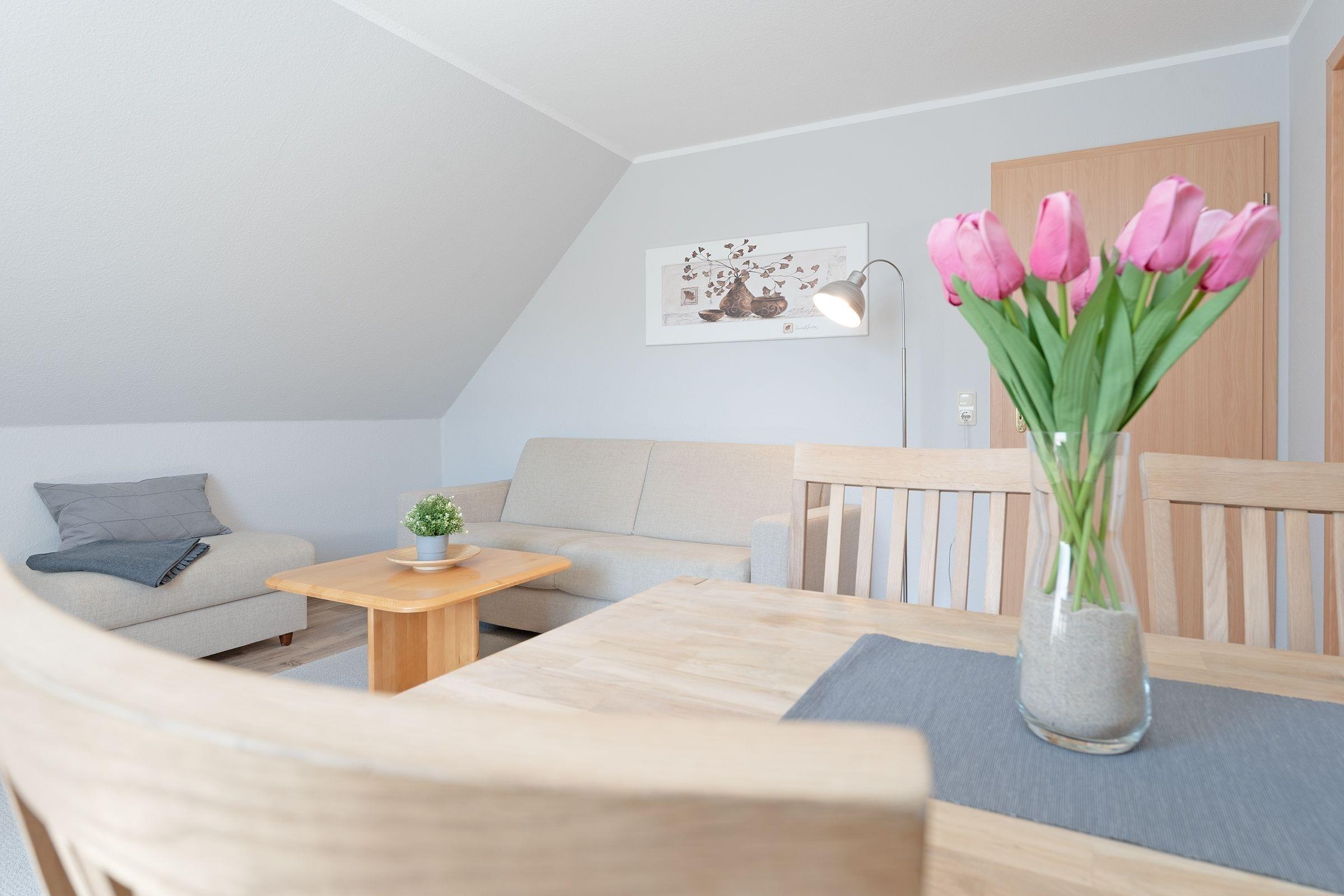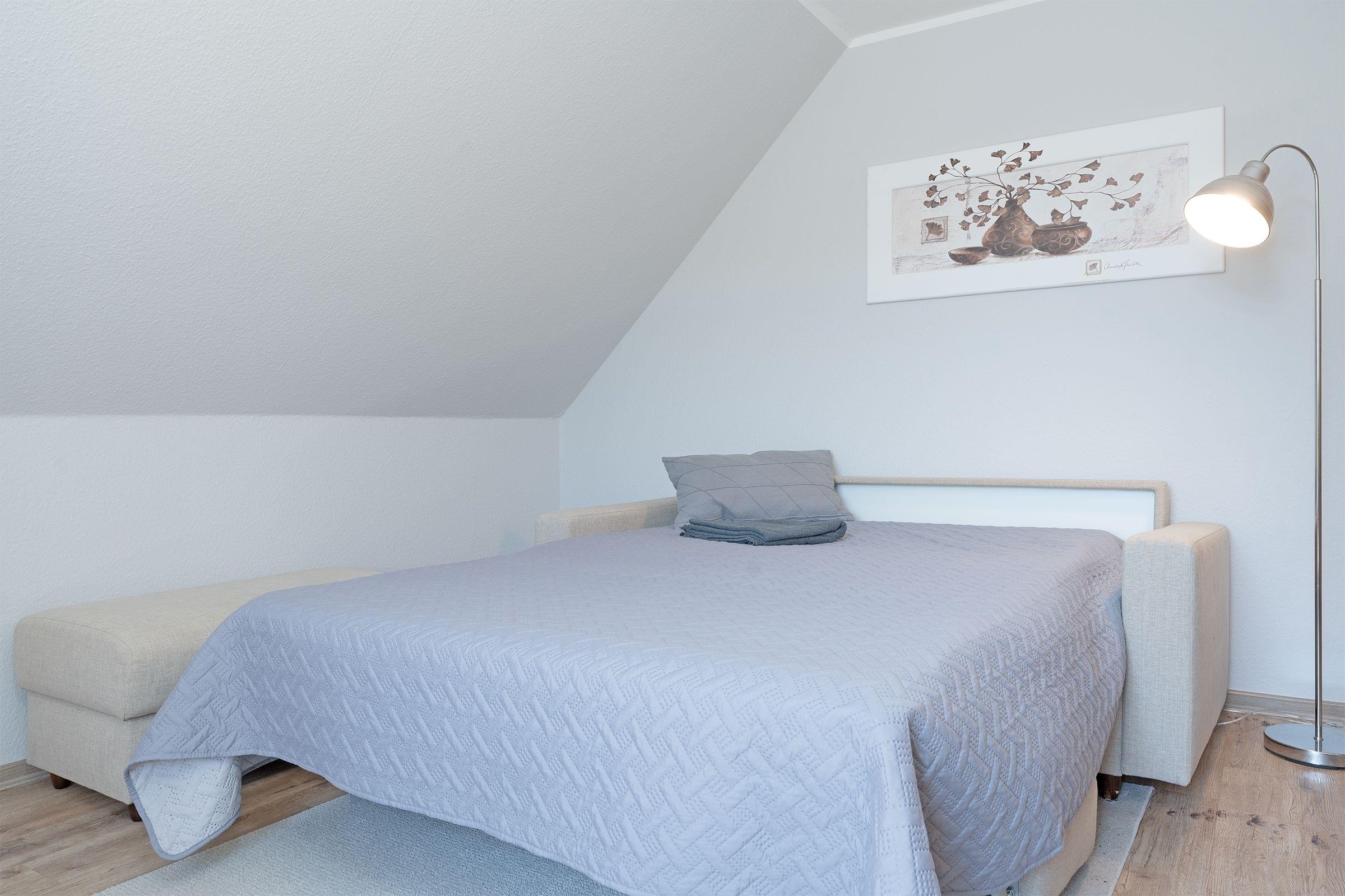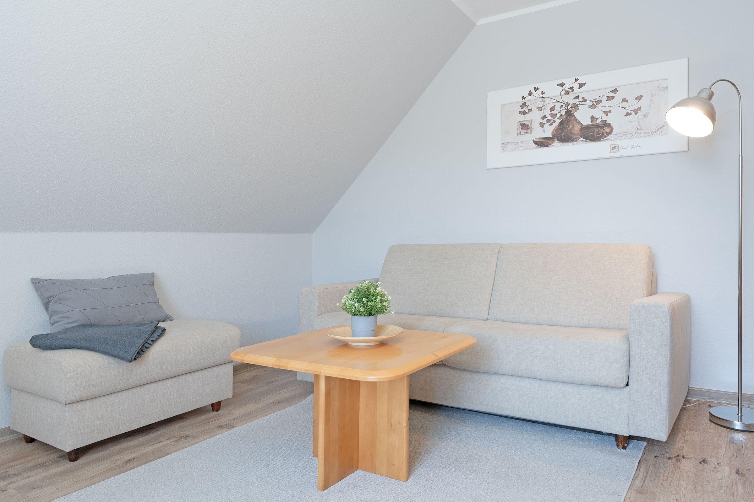Machen Sie es sich nach einem schönen Ostseeurlaubstag in Ihrem gemütlichen, hell eingerichteten Wohnzimmer bequem. Die klassisch-moderne Schlafcouch (140x200 cm) können Sie mit wenigen Handgriffen in eine Schlafstätte für bis zu 2 Personen verwandeln.