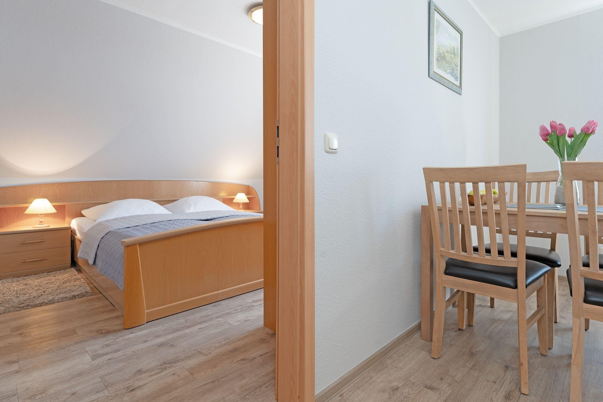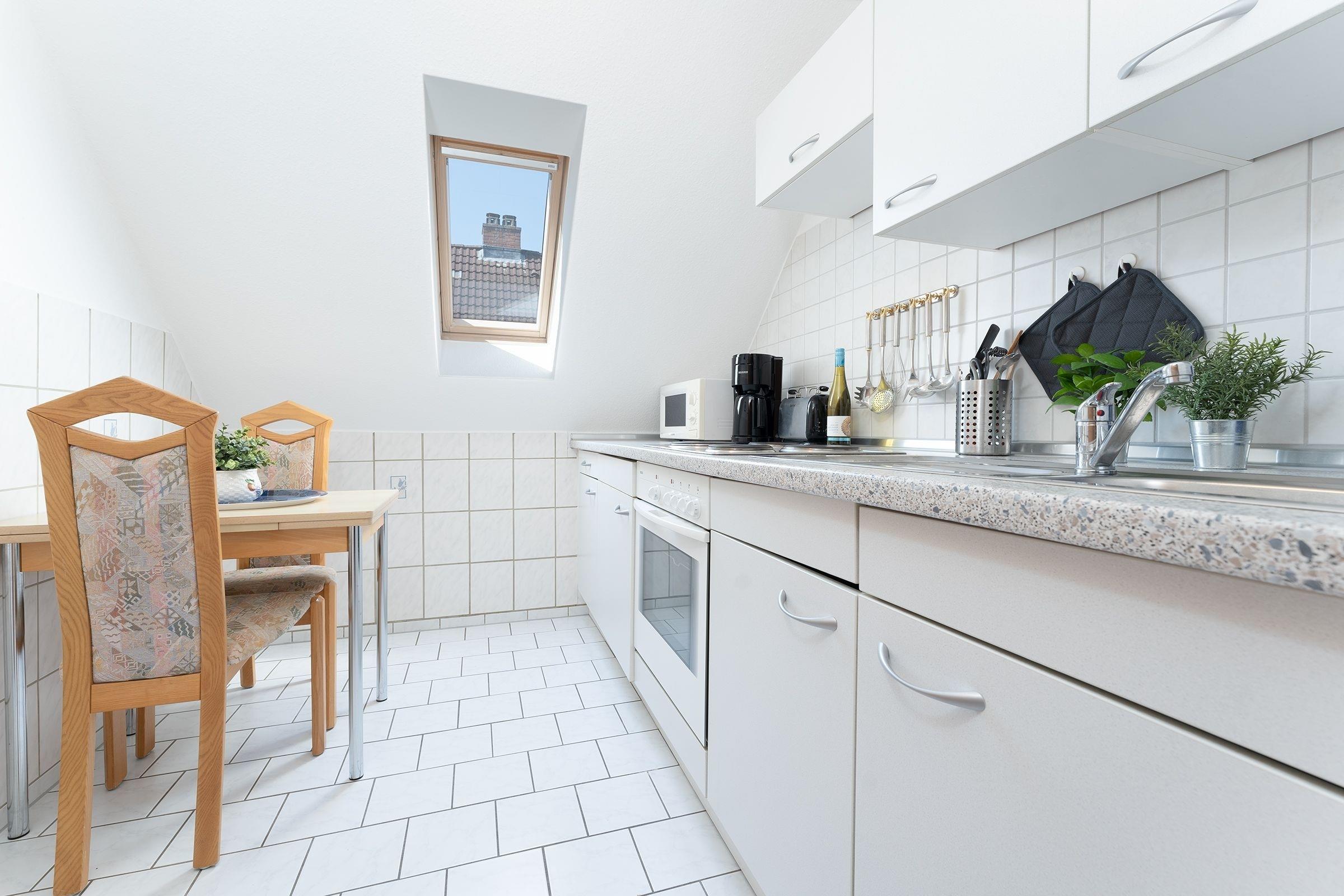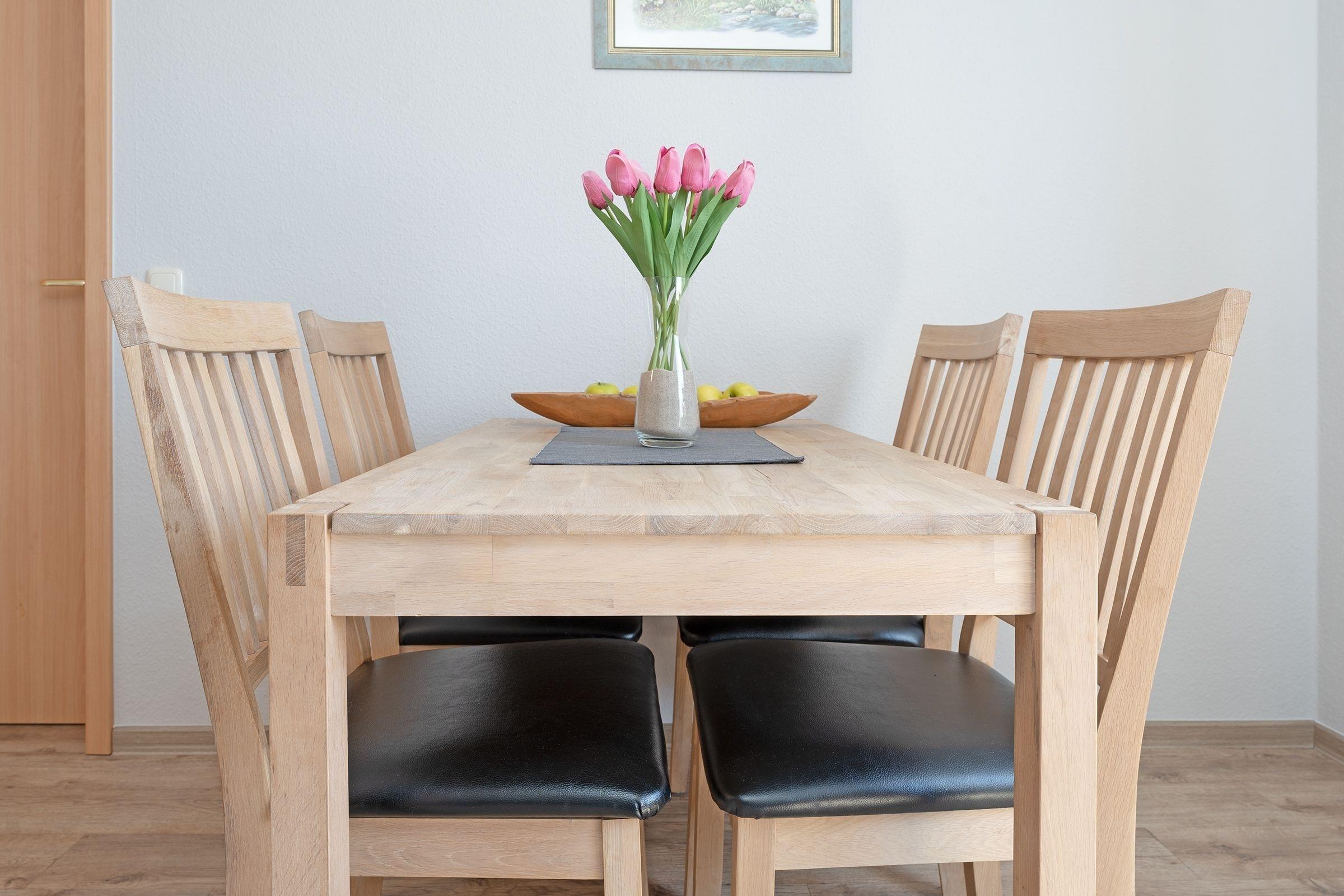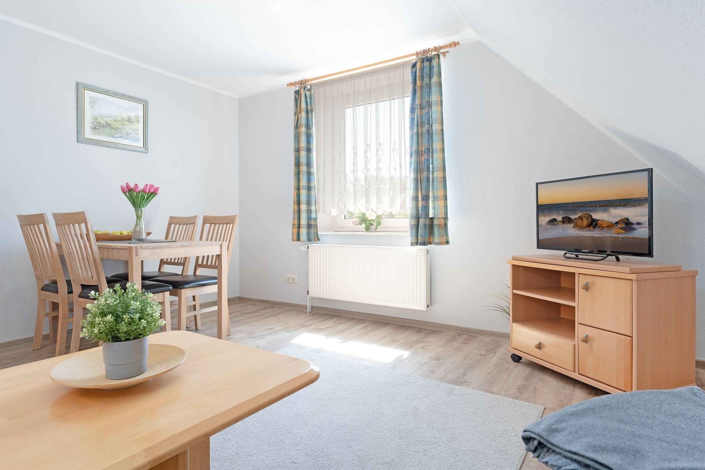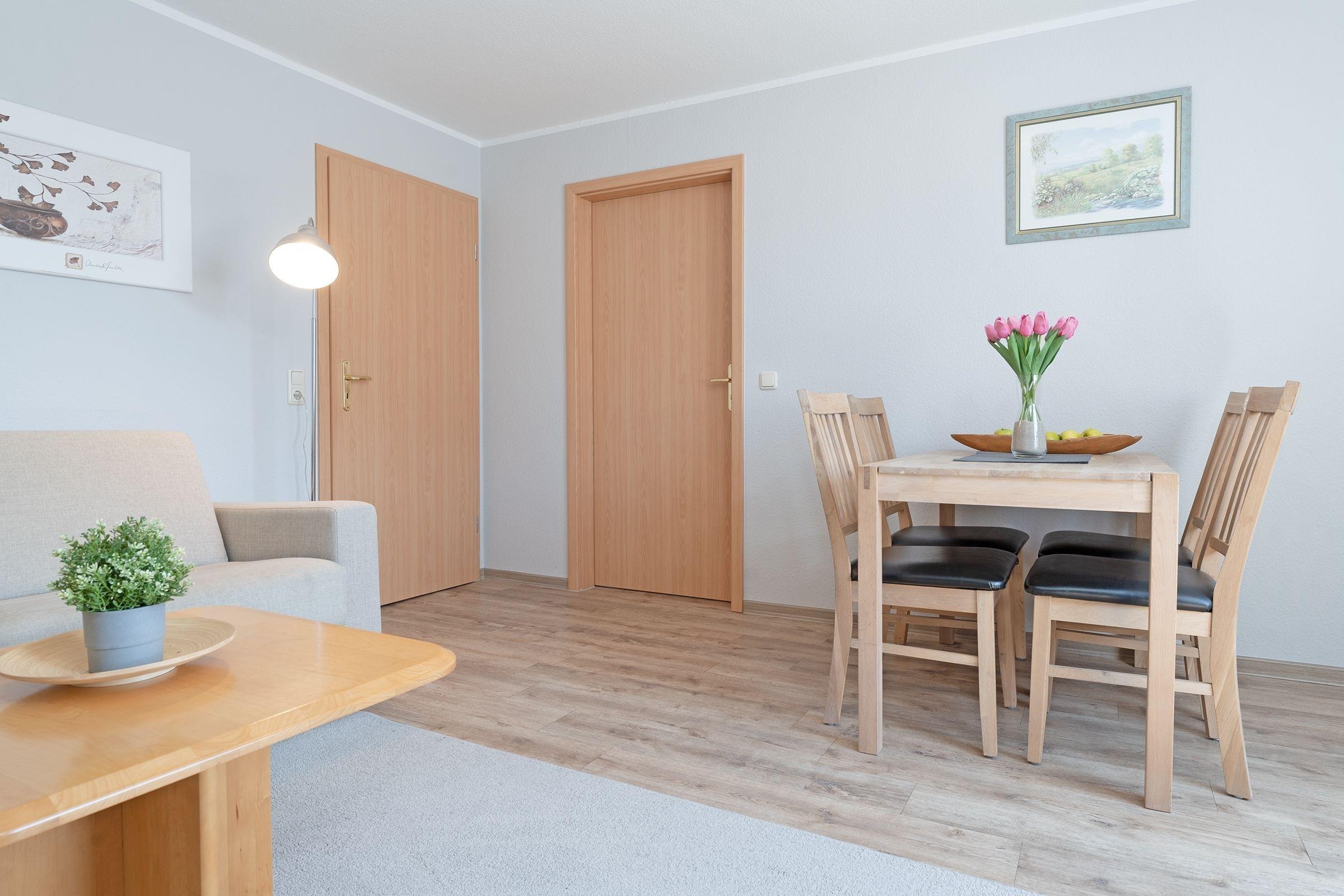 Für Unterhaltung im offenen Wohnraum sorgt ein Flachbildfernseher. Der integrierte Essbereich für 4 Personen strahlt durch hochwertige Holzmöbel Wärme und Geselligkeit aus. Im geräumigen Schlafzimmer mit Doppelbett (180x200 cm) schlafen Sie nach ausgiebigen Strandspaziergängen selig und entspannt, dort nimmt der Kleiderschrank problemlos Ihre Ferienkleidung auf. In der separaten Küche mit kleinem Essplatz können Sie morgens Ihre Tasse Kaffee genießen und schon die ersten Sonnenstrahlen durch das Fenster genießen. Eine gute Grundausstattung hilft Ihnen, auch in den Ferien wie zuhause zu kochen. Vollendet wird diese Ferienwohnung durch das geräumig geschnitten Duschbad und sorgt mit Dusche, Waschbecken, Spiegel und WC rundum für einen guten Start in den Tag oder eine erholsame Dusche nach Ihrem Strandtag. Der WLAN-Anschluss ist inklusive.
