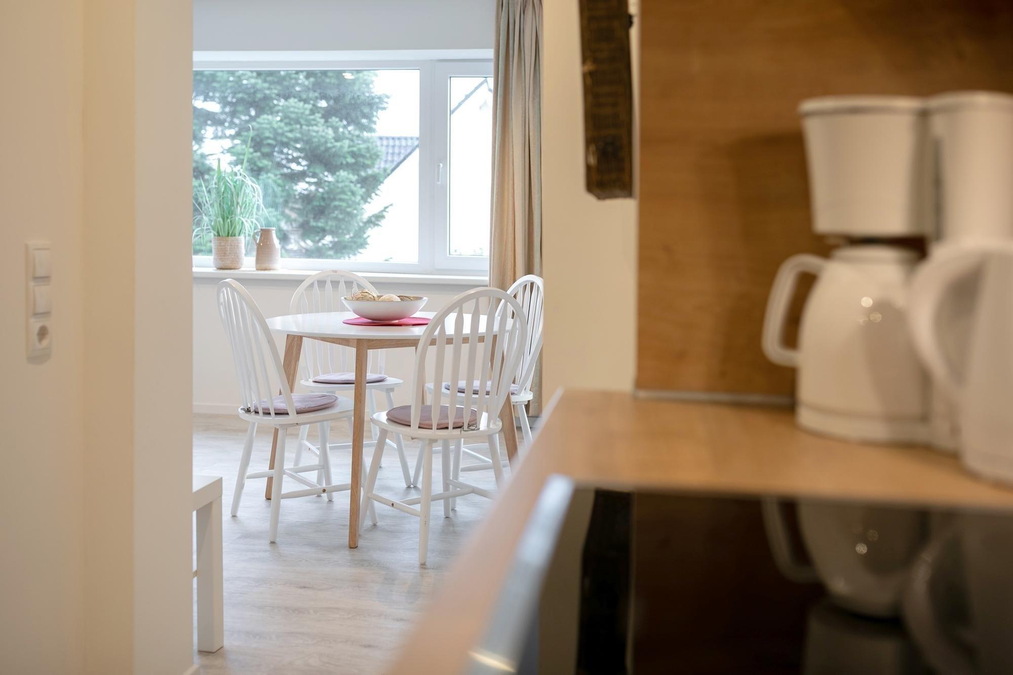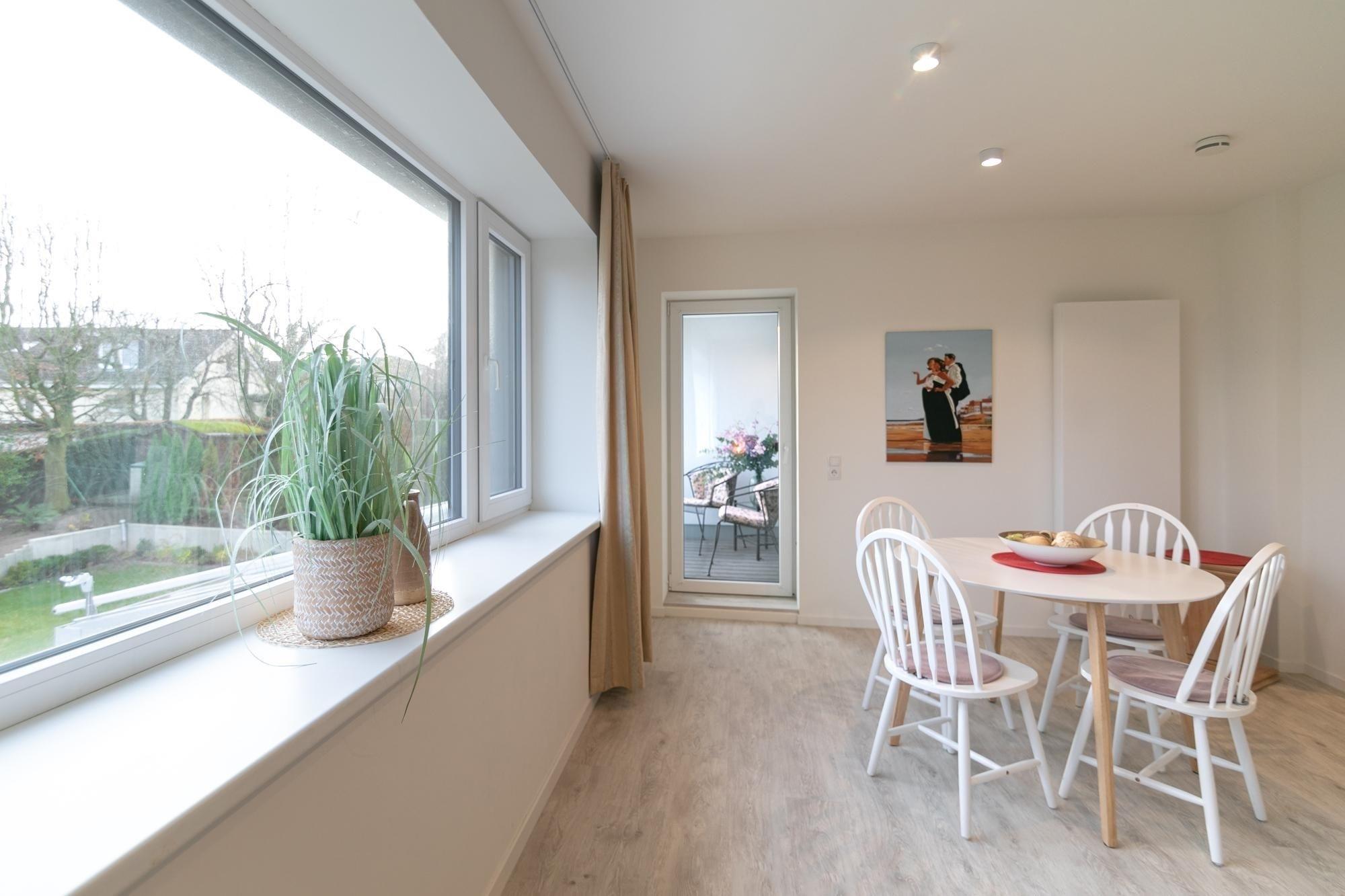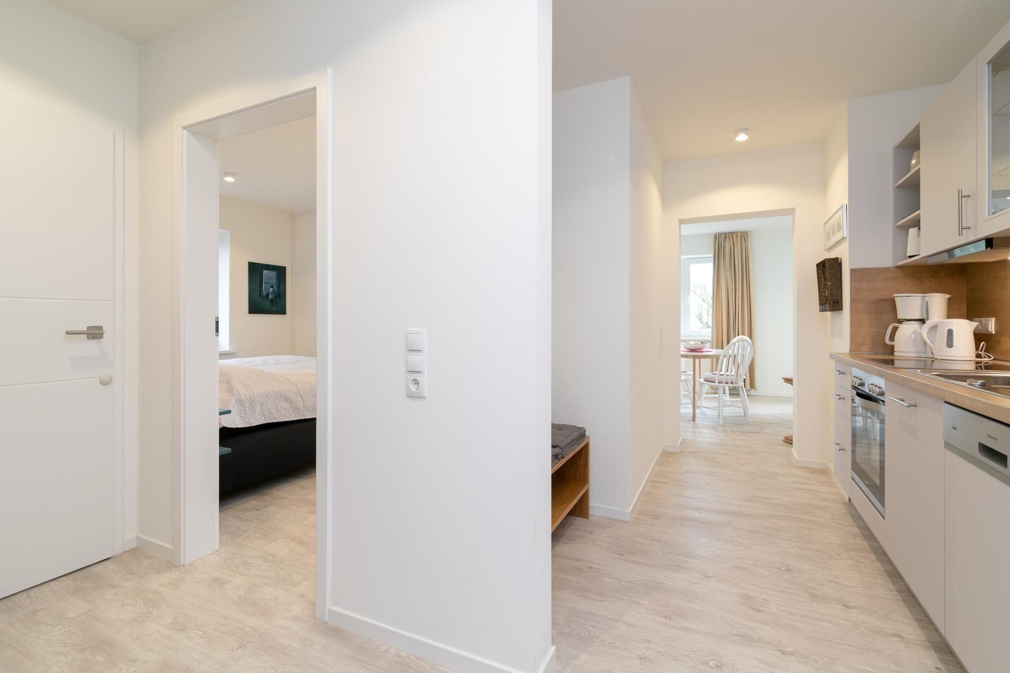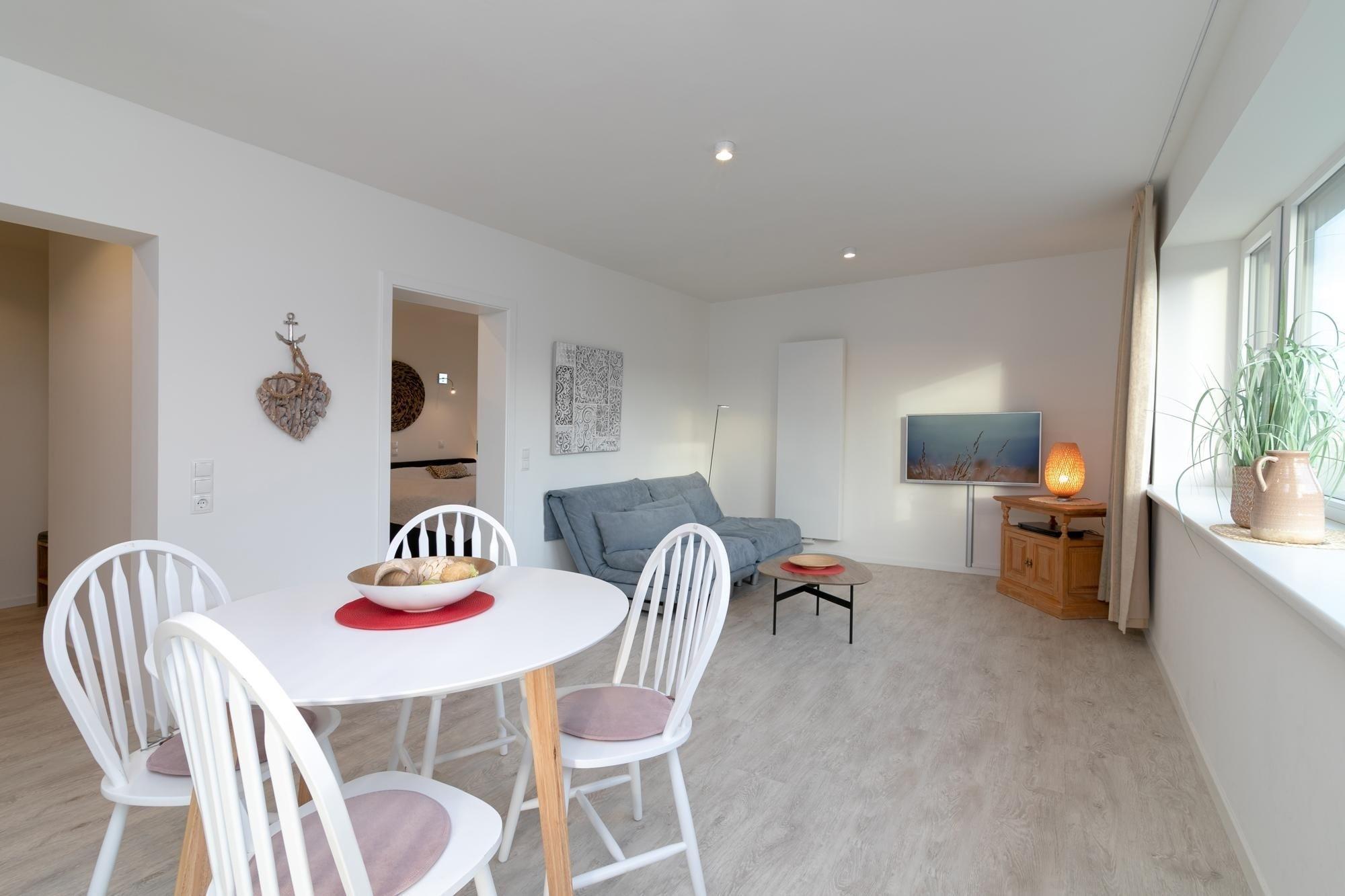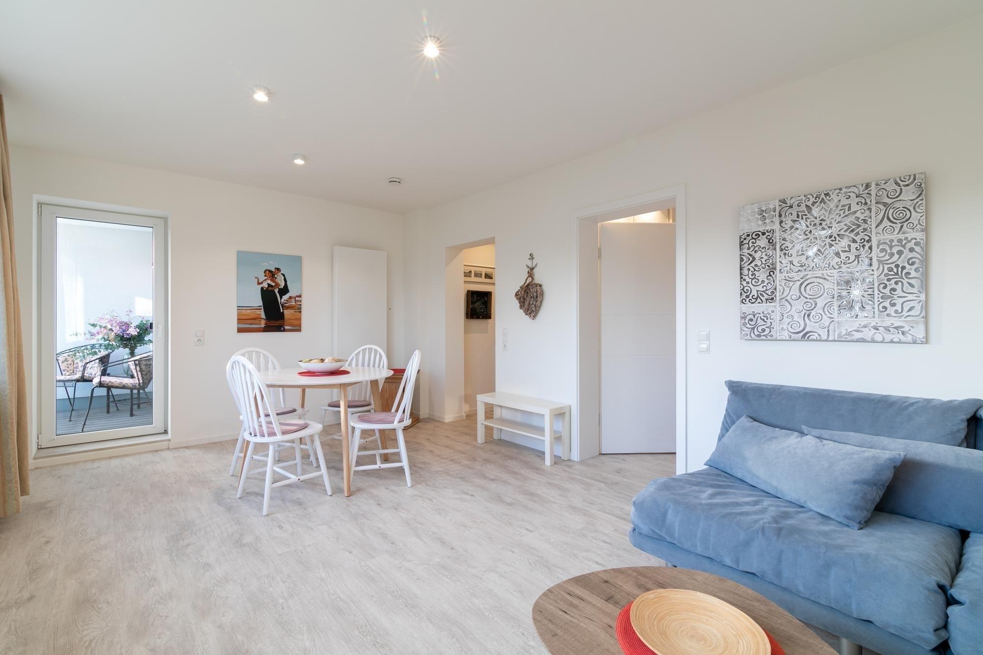 Machen Sie es sich im gemütlichen Wohnbereich mit zwei hochwertigen Schlafsesseln (Liegefläche je 90x200 cm) und Flat-TV bequem. Ein separates Schlafzimmer mit komfortablem Boxspringbett (180x200 cm) und 2. TV lädt zu erholsamen Stunden nach langen Strandtagen ein. Das stilvolle Designbad überzeugt mit Annehmlichkeiten wie bodentiefer Wellnessdusche, Schminkspiegel und Fußbodenheizung. In der offen gestalteten, gut ausgestatteten Küchenzeile mit hochwertigen Alltagshelfern wie Backofen, Spülmaschine, sowie 4-Platten-Ceranfeld lassen sich im Handumdrehen leckere Ferienmahlzeiten zubereiten. Der lichtdurchflutete und großzügige Essbereich für bis zu 4 Personen hat einem direkten Zugang zum überdachten, möblierten Balkon. Von hier aus öffnet sich der Blick ins Grüne – Ruhe, Entspannung und ein Hauch von Ostsee in der Ferne. Erholung pur!
