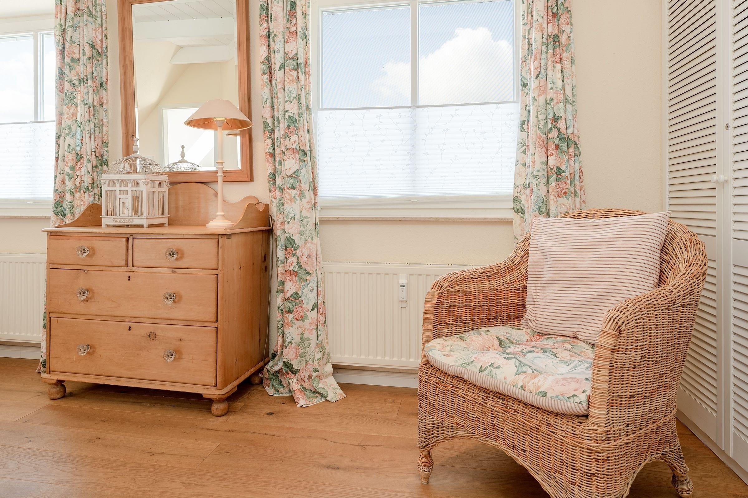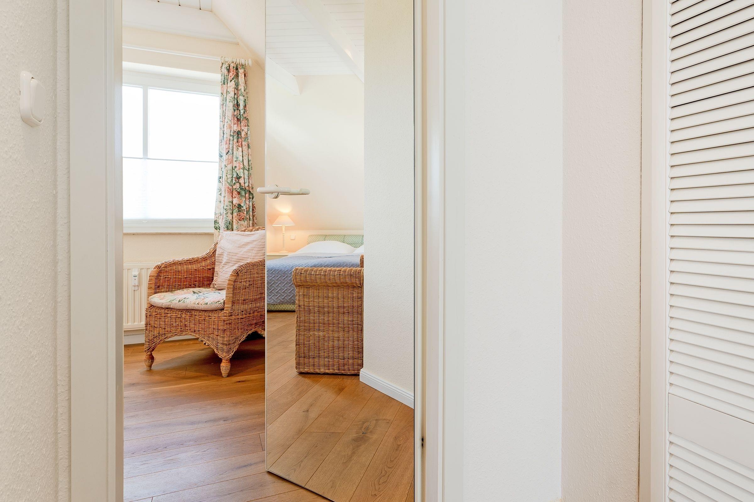 Der offene Wohn-/ Schlafbereich begeistert mit gemütlicher Sitzecke auf einer Empore, Kuschelecke mit hochwertiger Schlafcouch (140x180 cm) und Flat-TV, Küchenzeile und Essbereich, direktem Zugang zum möblierten Balkon mit Markise. Das große separate Schlafzimmer ist mit hochwertigem Doppelbett (2x 90x190 cm), Kommoden, Einbauschrank und Rattan-Sessel gemütlich und praktisch ausgestattet. Daran angrenzend befindet sich ein geräumiges Badezimmer mit Badewanne, großem Spiegel, Waschtisch mit Schubladen und Föhn, des weiteren gibt es ein Gäste-WC mit Dusche.