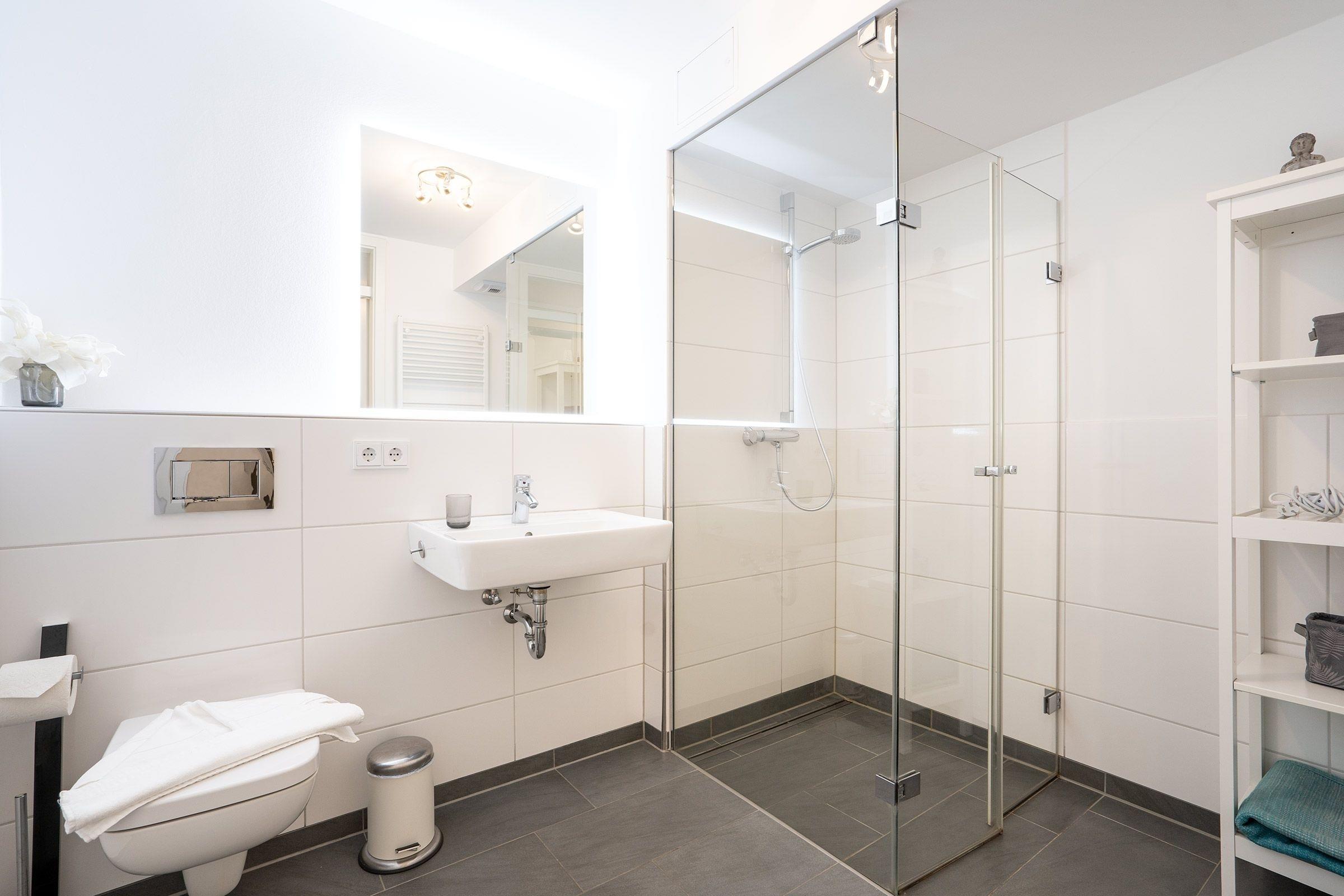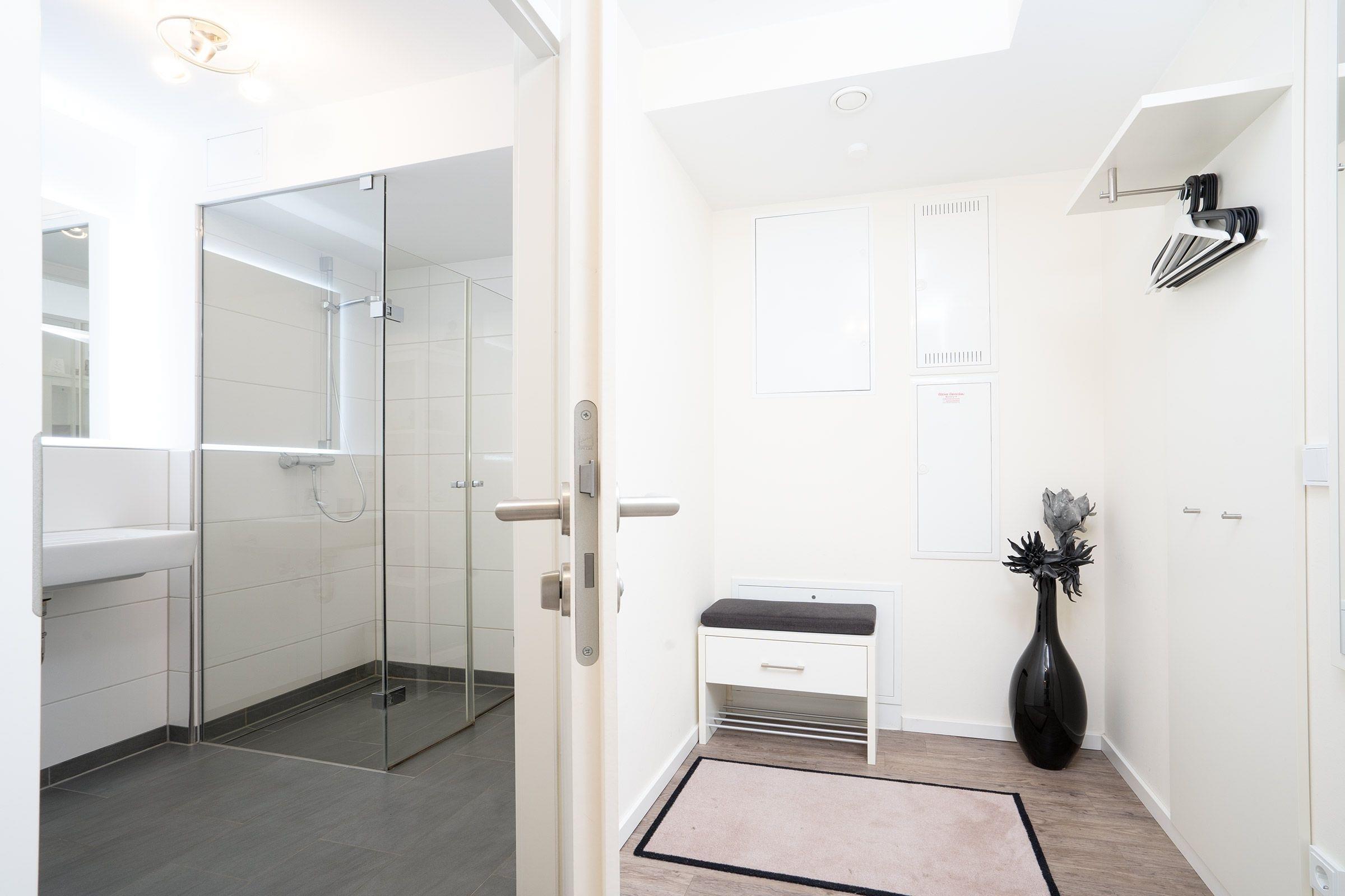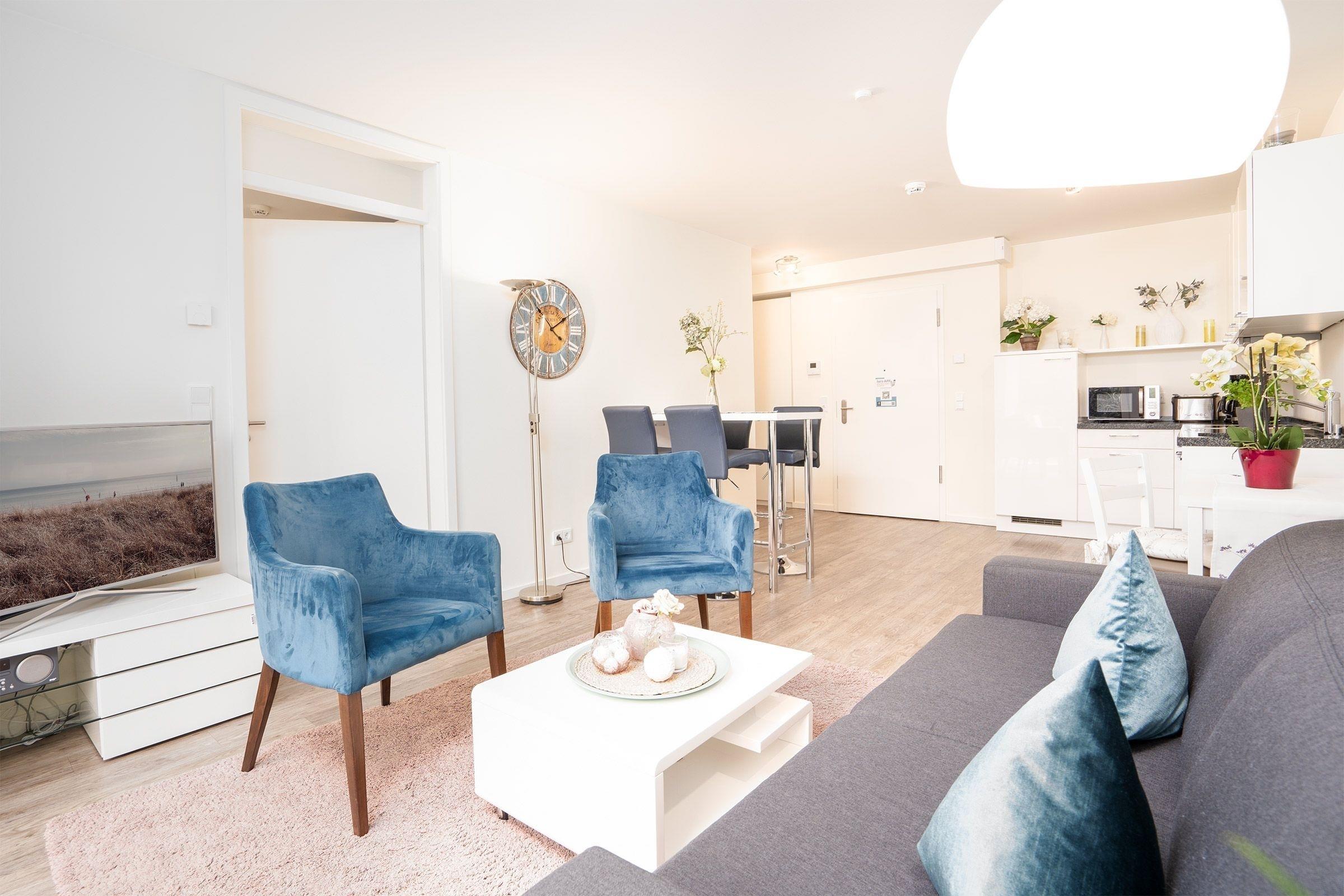 Vom kleinen Flurbereich der Wohnung gelangen Sie in das schöne Bad mit seiner ebenerdigen großzügigen Dusche. Ein Fön und eine Personenwaage gehören neben einer Handtuchheizung und einem Regal für Ihre Badutensilien zur Ausstattung. Neben modernster Ausstattung überzeugt das Appartement durch eine Südwest-Terrasse. Hier können Sie Ihren Urlaubstag mit einem gemütlichen Frühstück starten. Der funktionell eingerichtete Wohn-Essbereich mit offener Küchenzeile besticht durch klare Linien. In Ihrer rundum ausgestatteten Küche finden Sie alle notwendigen Alltagshelfer für gelungene Kochabende. Der Wohnbereich ist mit einem Schlafsofa mit Faltbettfunktion (190x140cm) ausgestattet, der Raum kann durch Außenjalousien abgedunkelt werden. Hier kann man es sich am Abend vor dem Flat-Screen-TV gemütlich machen. Das modern eingerichtete Schlafzimmer erreichen Sie vom Wohnzimmer. Ein Doppelbett (2x 90x200 cm) verspricht erholsamen Schlaf nach einem erlebnisreichen Urlaubstag. Ihre Urlaubsgarderobe kann im leichtgängigen Schwebetürenschrank verstaut werden. Zur weiteren Ausstattung gehört ein Samsung Flat-Screen-TV und ein kleiner Schminktisch mit Spiegel. Die wohlverdiente Nachtruhe können Sie auch hier mit elektrischen Außenjalousien unterstützen. W-LAN steht kostenfrei zur Verfügung