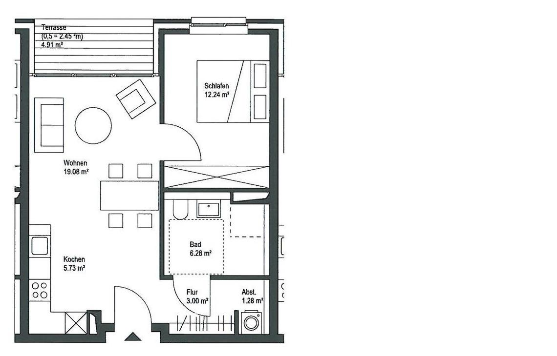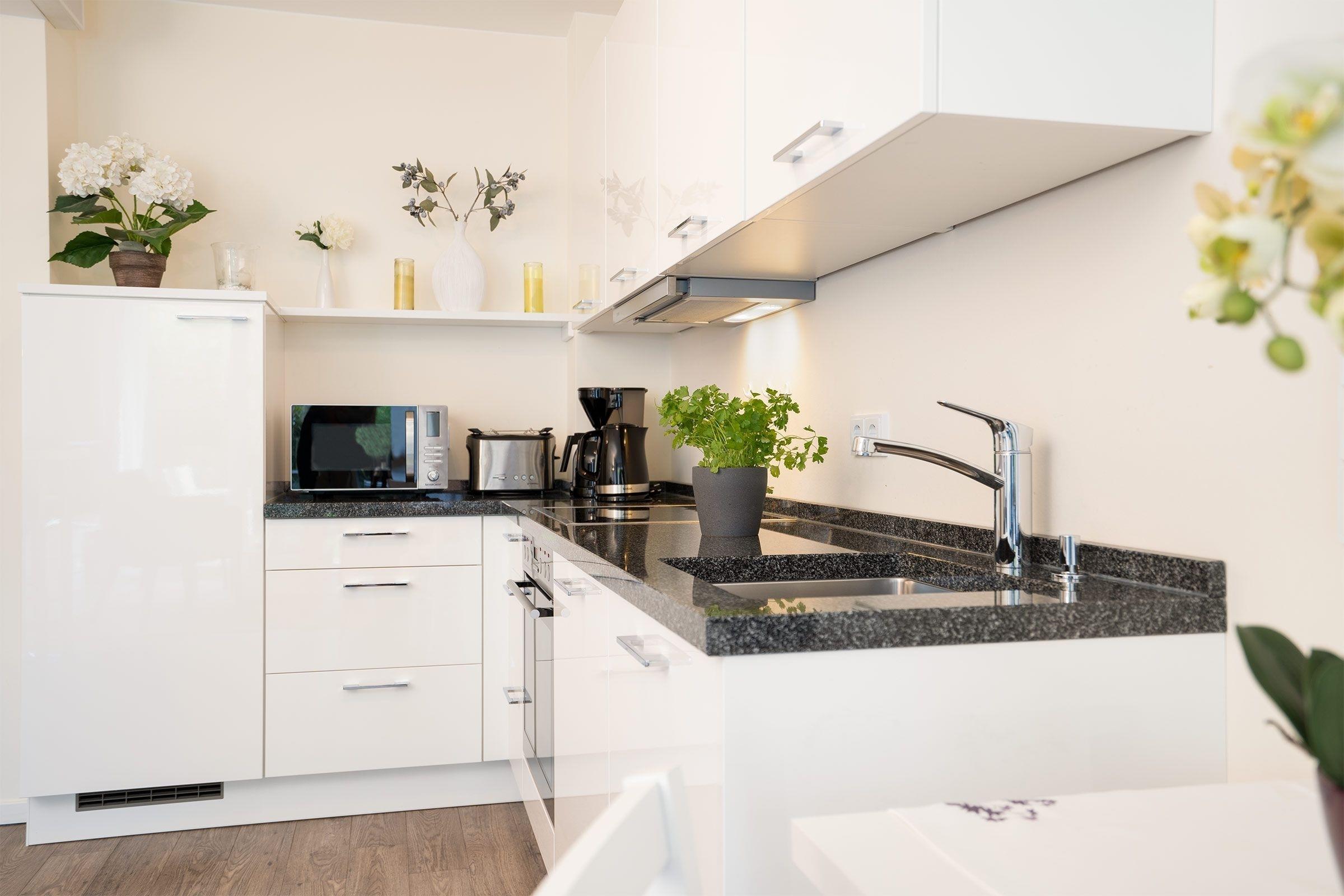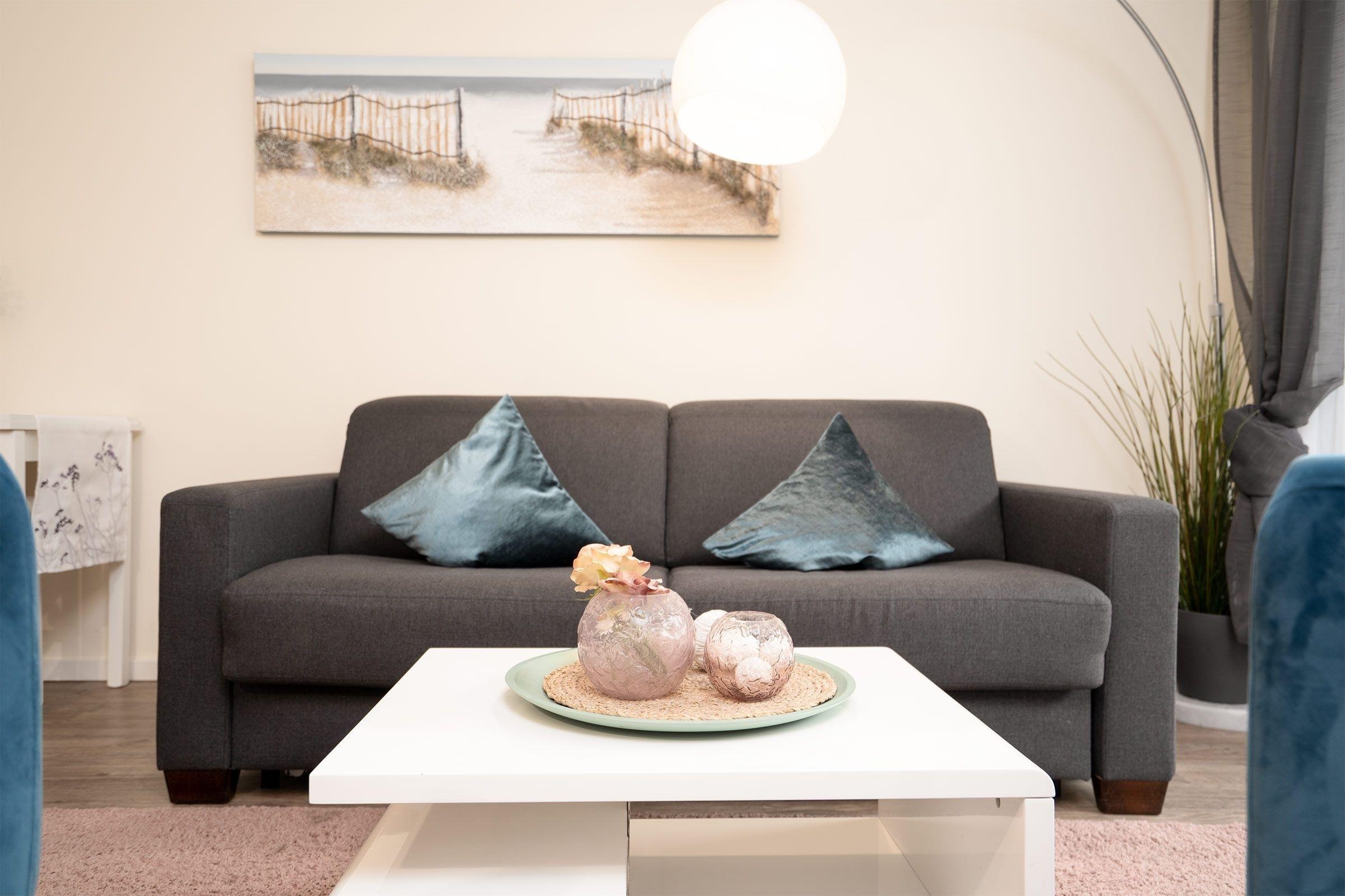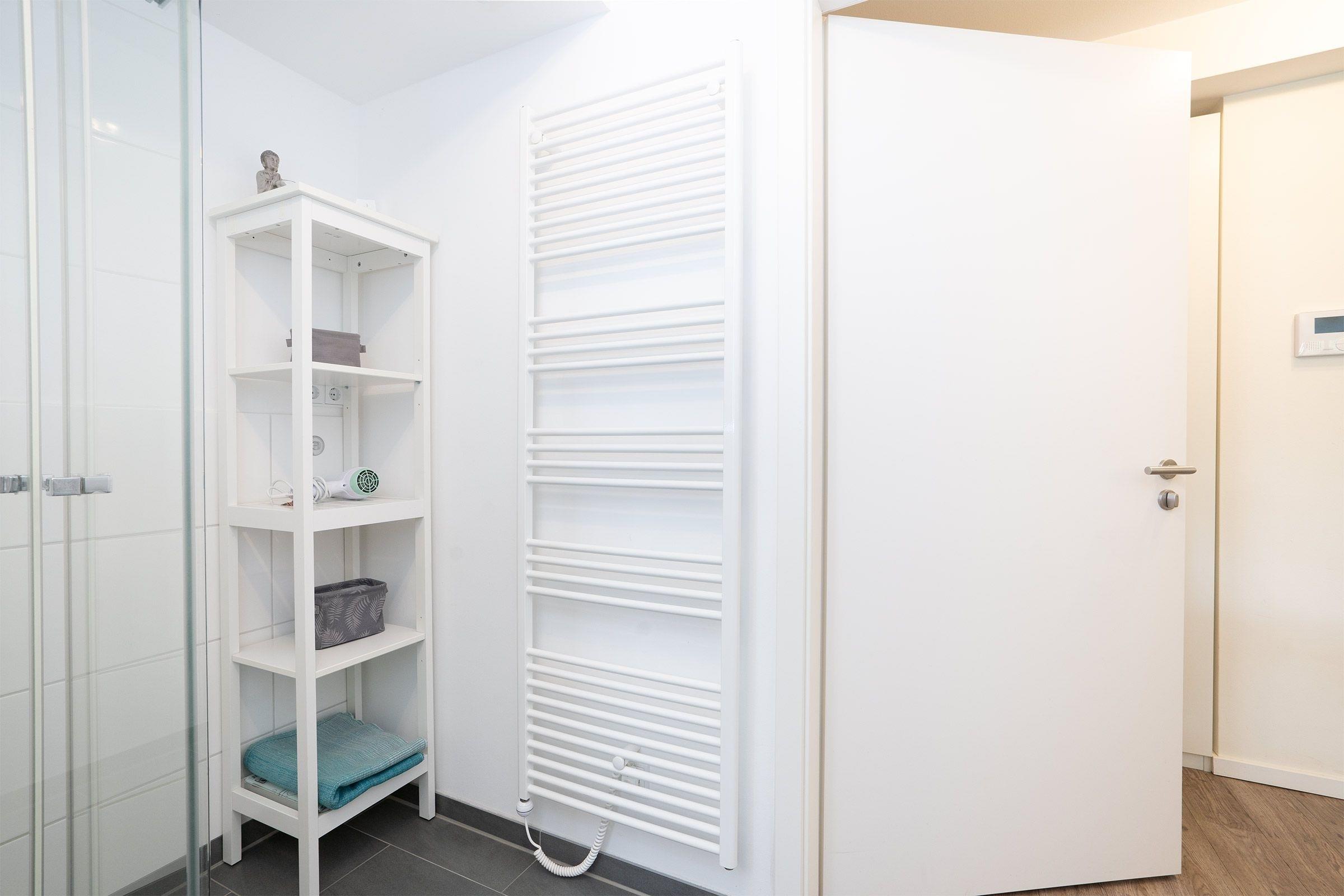 Vom kleinen Flurbereich der Wohnung gelangen Sie in das schöne Bad mit seiner ebenerdigen großzügigen Dusche. Ein Fön und eine Personenwaage gehören neben einer Handtuchheizung und einem Regal für Ihre Badutensilien zur Ausstattung. Neben modernster Ausstattung überzeugt das Appartement durch eine Südwest-Terrasse. Hier können Sie Ihren Urlaubstag mit einem gemütlichen Frühstück starten. Der funktionell eingerichtete Wohn-Essbereich mit offener Küchenzeile besticht durch klare Linien. In Ihrer rundum ausgestatteten Küche finden Sie alle notwendigen Alltagshelfer für gelungene Kochabende. Der Wohnbereich ist mit einem Schlafsofa mit Faltbettfunktion (190x140cm) ausgestattet, der Raum kann durch Außenjalousien abgedunkelt werden. Hier kann man es sich am Abend vor dem Flat-Screen-TV gemütlich machen. Das modern eingerichtete Schlafzimmer erreichen Sie vom Wohnzimmer. Ein Doppelbett (2x 90x200 cm) verspricht erholsamen Schlaf nach einem erlebnisreichen Urlaubstag. Ihre Urlaubsgarderobe kann im leichtgängigen Schwebetürenschrank verstaut werden. Zur weiteren Ausstattung gehört ein Samsung Flat-Screen-TV und ein kleiner Schminktisch mit Spiegel. Die wohlverdiente Nachtruhe können Sie auch hier mit elektrischen Außenjalousien unterstützen. W-LAN steht kostenfrei zur Verfügung