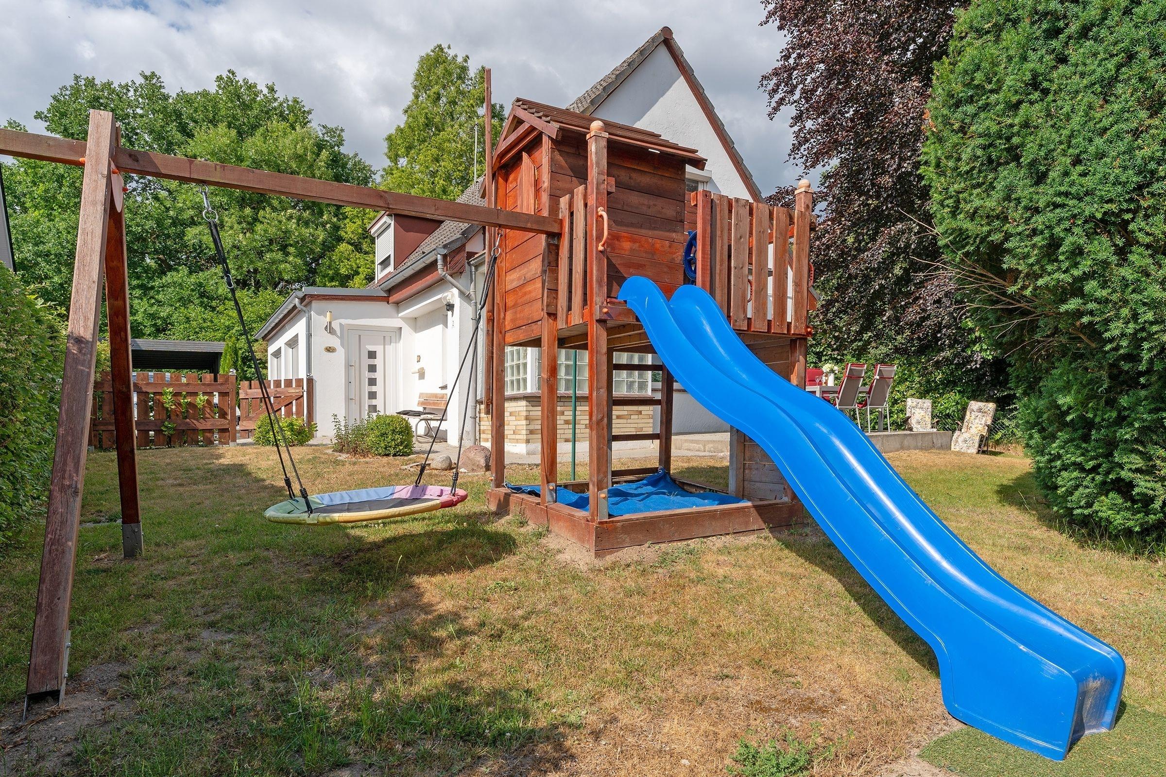 Ihr Auto parkt direkt am Ferienhäuschen. Praktisch ist der Eingangsflur mit Garderobe und Schuhschrank und Bänkchen. Treten Sie ein: rechts ist das helle Wohnzimmer mit 2 Sofas und Essplatz, TV und Musikanlage. Vom Wohnzimmer aus gelangen Sie in den schönen eingezäunten Garten mit Spielgeräten und Sandkasten. Ihre Kinder werden den großen Garten lieben – sie können dort unbeschwert spielen. Das Grillen ist hier auch erlaubt. Neben dem Wohnzimmer ist die separate vollausgestattete Küche. Hier können Sie kochen wie zu Hause und am liebsten Abends im Garten zusammen essen. Das große tageslichthelle Duschbad ist auch im Erdgeschoss. Für die schnelle Wäsche zwischendurch steht Ihnen hier eine Waschmaschine zur Verfügung. Eine Treppe hinauf führt Sie zu den beiden separaten Schlafzimmern. Gleich links ist ein kleines Schlafzimmer, mit Dachschrägen, einem Doppelbett (140x200 cm), Nachttischen und Kleiderschrank. Daneben ist das große Schlafzimmer mit Doppelbett (2x 90x200 cm), Nachttischen, Kleiderschrank, Kommode und TV. Herrlich hier können Sie morgens schon in Ruhe einen Kaffee auf dem Balkon genießen. Beide Schlafzimmer haben Außenrolladen zum Verdunkeln. Ein kleines WC ist ebenfalls auf der 1. Etage.