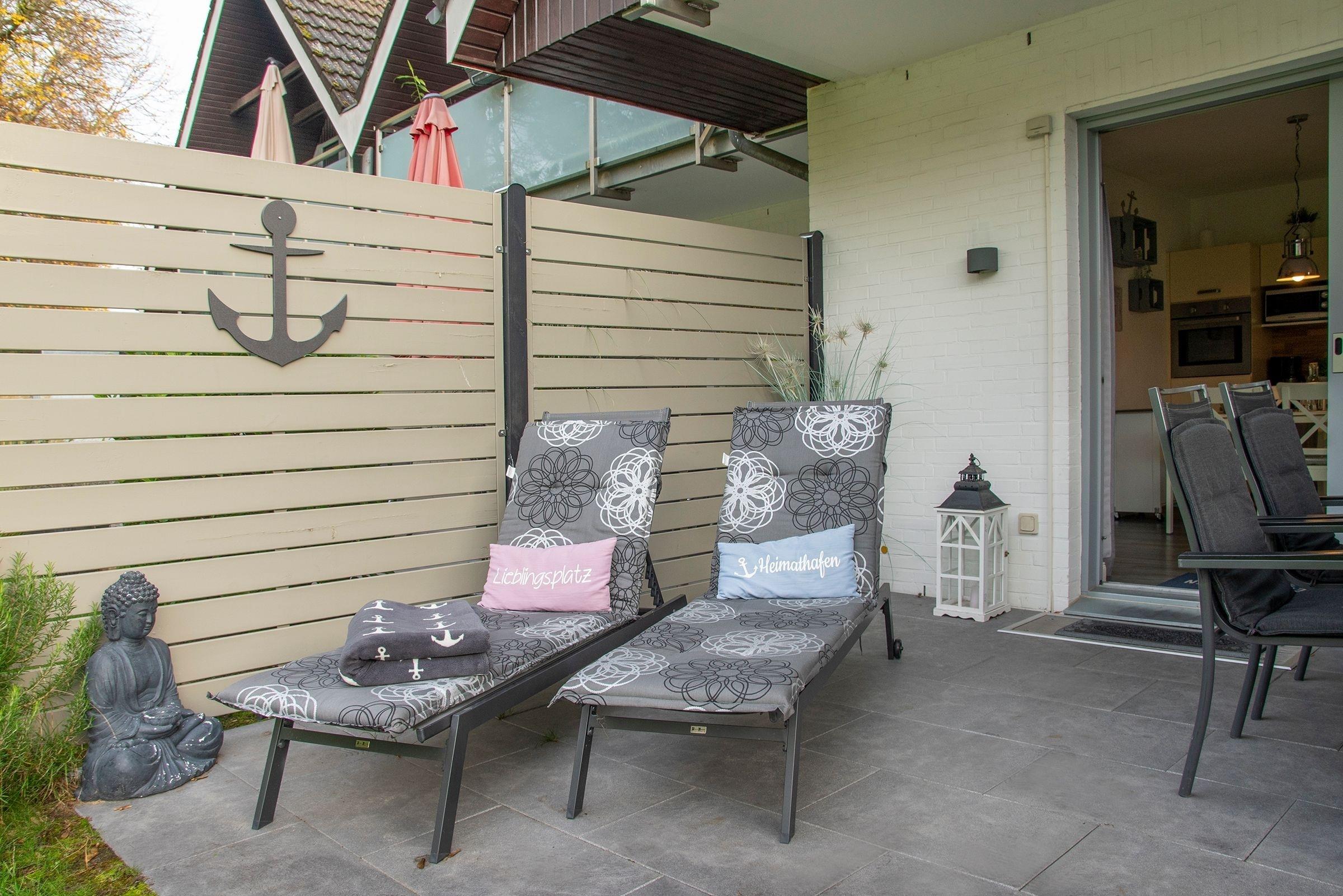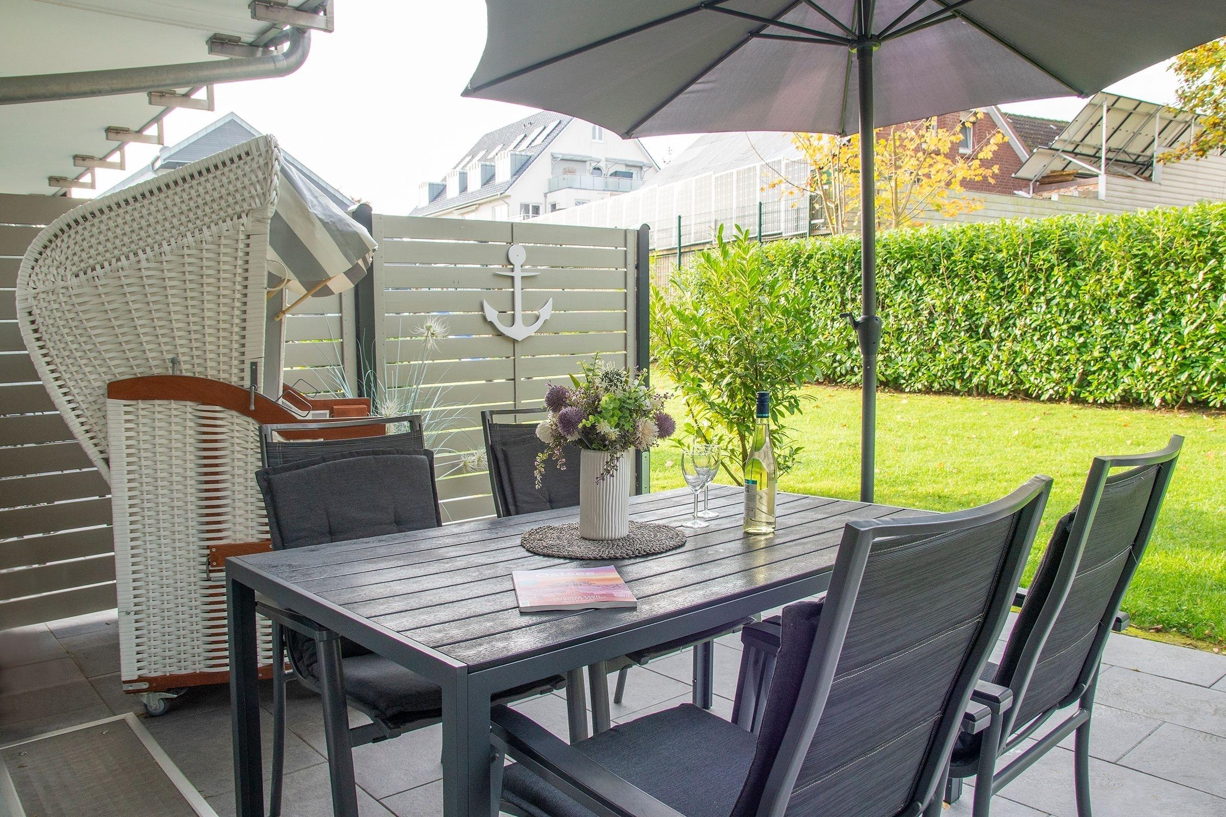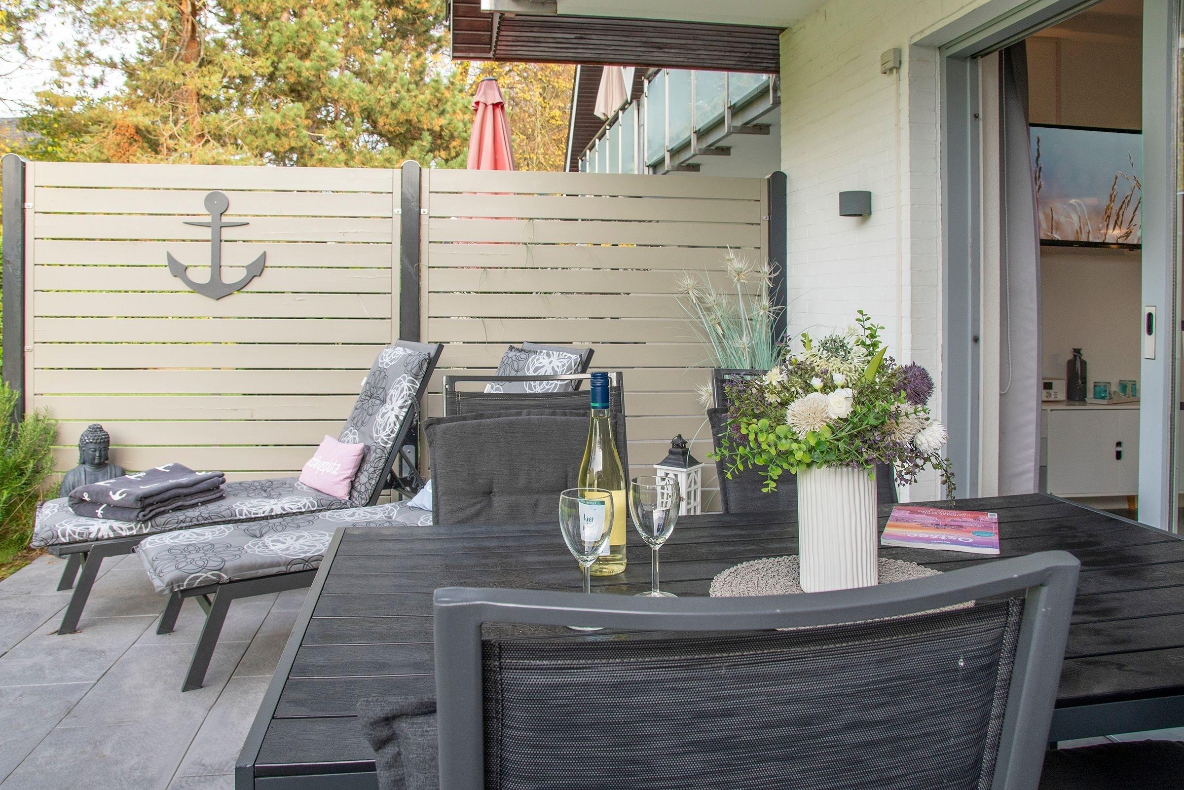 Liebevoll gestaltete,chice Ferienwohnung- 250m vom Strand entfernt. Die Terrasse ist ein Traum und lädt für gemütliche Stunden ein! Wir lieben es dort seit Jahren!