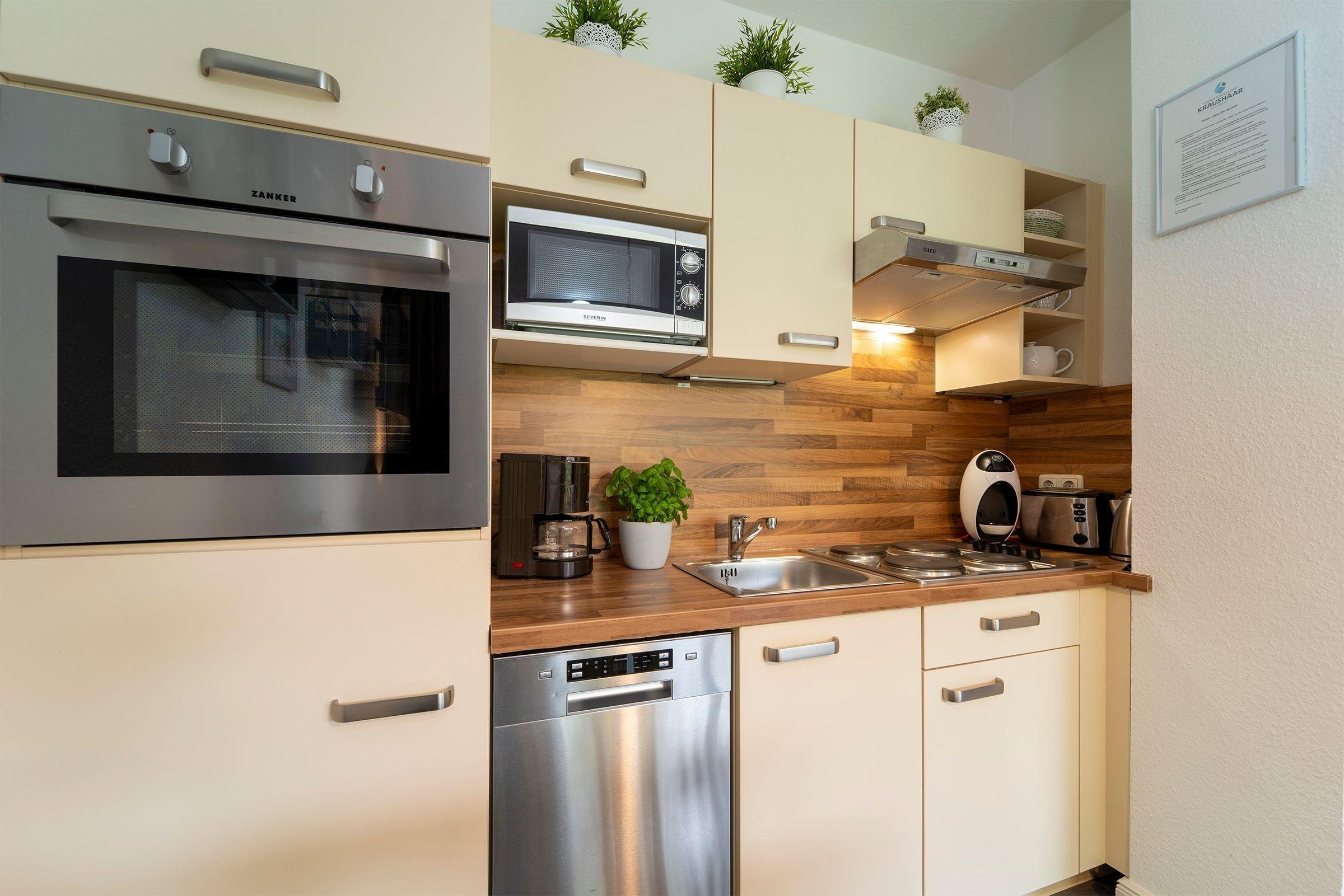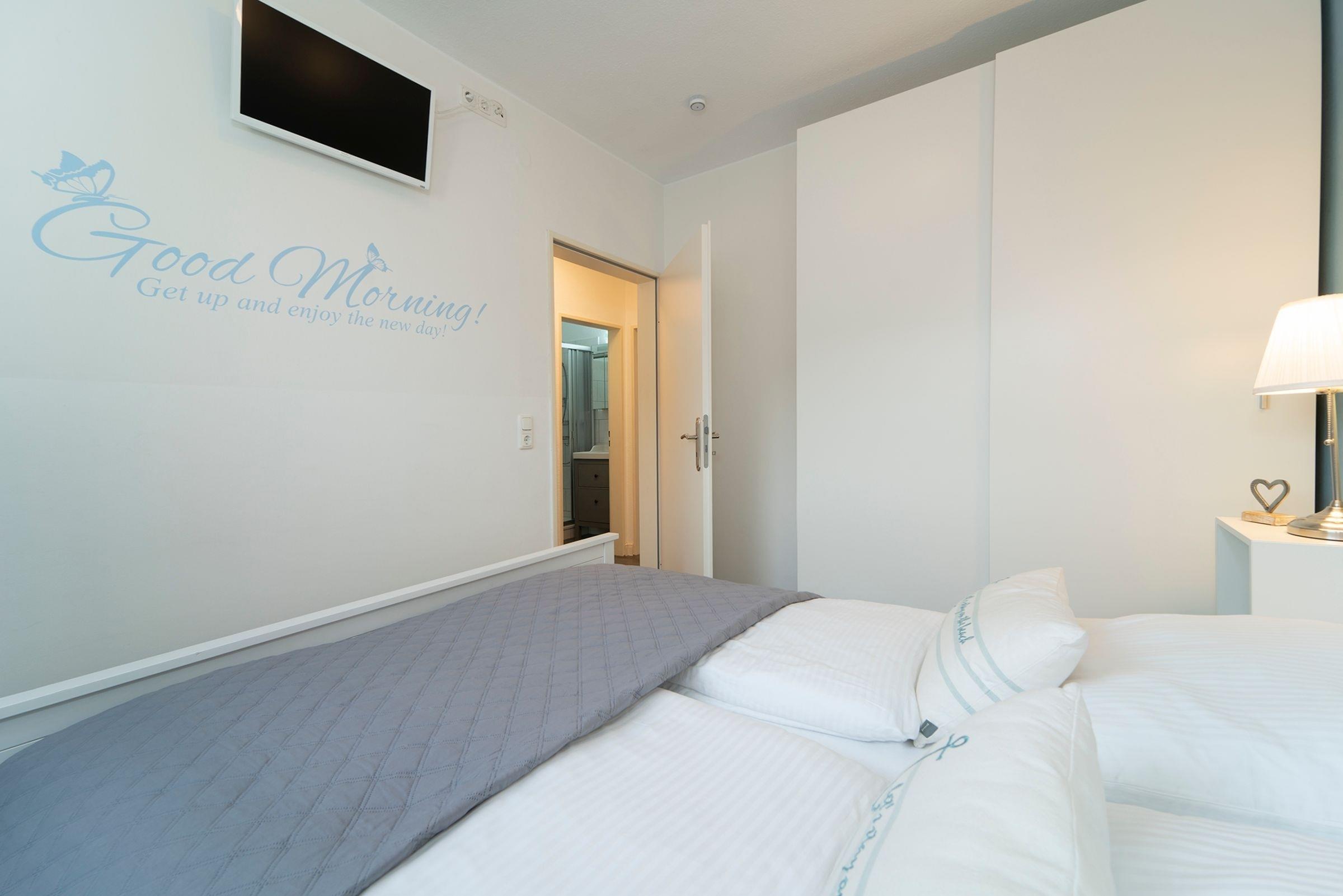 Geradezu das helle Wohnzimmer mit Essecke und offener Küchenzeile. Öffnen Sie gleich mal die große Terrassentür – wunderbar kann man hier morgens frühstücken auf der überdachten Terrasse mit einem Strandkorb oder den Abend gemütlich ausklingen lassen. Im gemeinschaftlich genutzten Garten können sich die "kleinen" Gäste vergnügen. Ob Sie nur Frühstück zubereiten möchten oder Kochen wie zu Hause, in der vollwertig ausgestatteten Küche haben Sie alle Möglichkeiten. Den Tisch nebenbei decken und dann in aller Ruhe speisen. Die Schlafcouch (160x200 cm) lässt sich zur Nacht in einen kuscheligen Schlafplatz für 2 Personen herrichten. Dunkelblaue Gardinen schützen vor den ersten Sonnenstrahlen am Morgen. Entspannen Sie auf der gemütlichen Couch und hören schöne Musik aus dem W-LAN Radio mit Bluetooth Verbindung. Vom Flur aus ist das kleine moderne Duschbad mit Handtuchwärmer. Im gegenüberliegenden Schlafzimmer können Sie auch Ihre Fernsehsendung vom Doppelbett (2x 80x200 cm) zu Ende sehen. Ausreichend Platz für Ihre Urlaubsgarderobe ist im Kleiderschrank. Praktisch ist auch der Abstellraum im Flur, neben Alltagshelfern können Sie hier Ihre Koffer oder Strandutensilien abstellen.