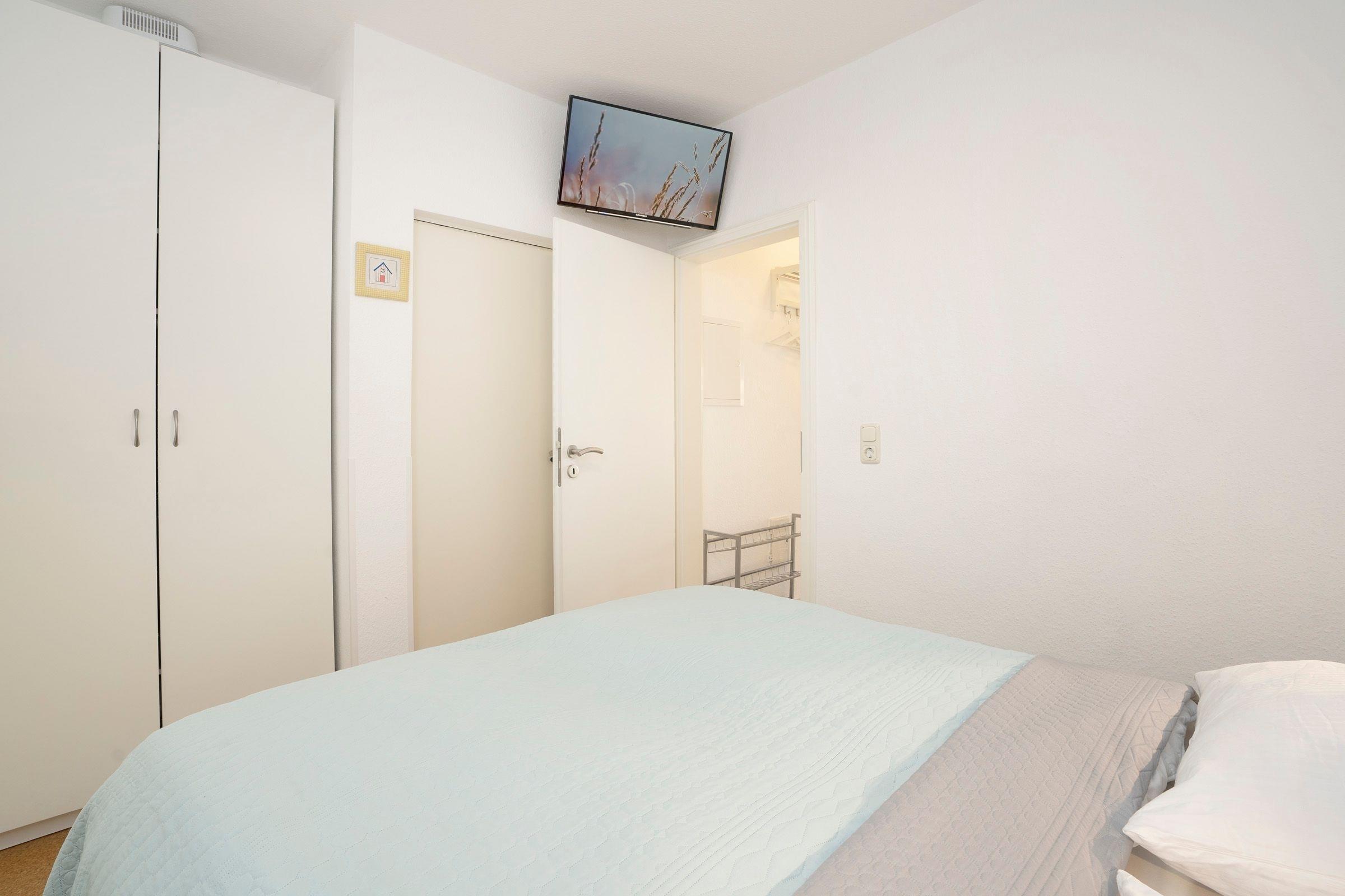 Es stehen ein kombinierter Wohn- und Schlafraum mit einem bequemen Schlafsofa (160x200 cm), Essbereich und angrenzender Küchenzeile zur Verfügung. Das Schlafzimmer ist mit einem Doppelbett (160x200 cm) eingerichtet. Außerdem gibt es ein Duschbad. Auf der Terrasse können Sie die Morgensonne genießen. Die Wohnung ist ideal für Familien mit zwei Kindern. WLAN steht Ihnen selbstverständlich kostenlos zur Verfügung.