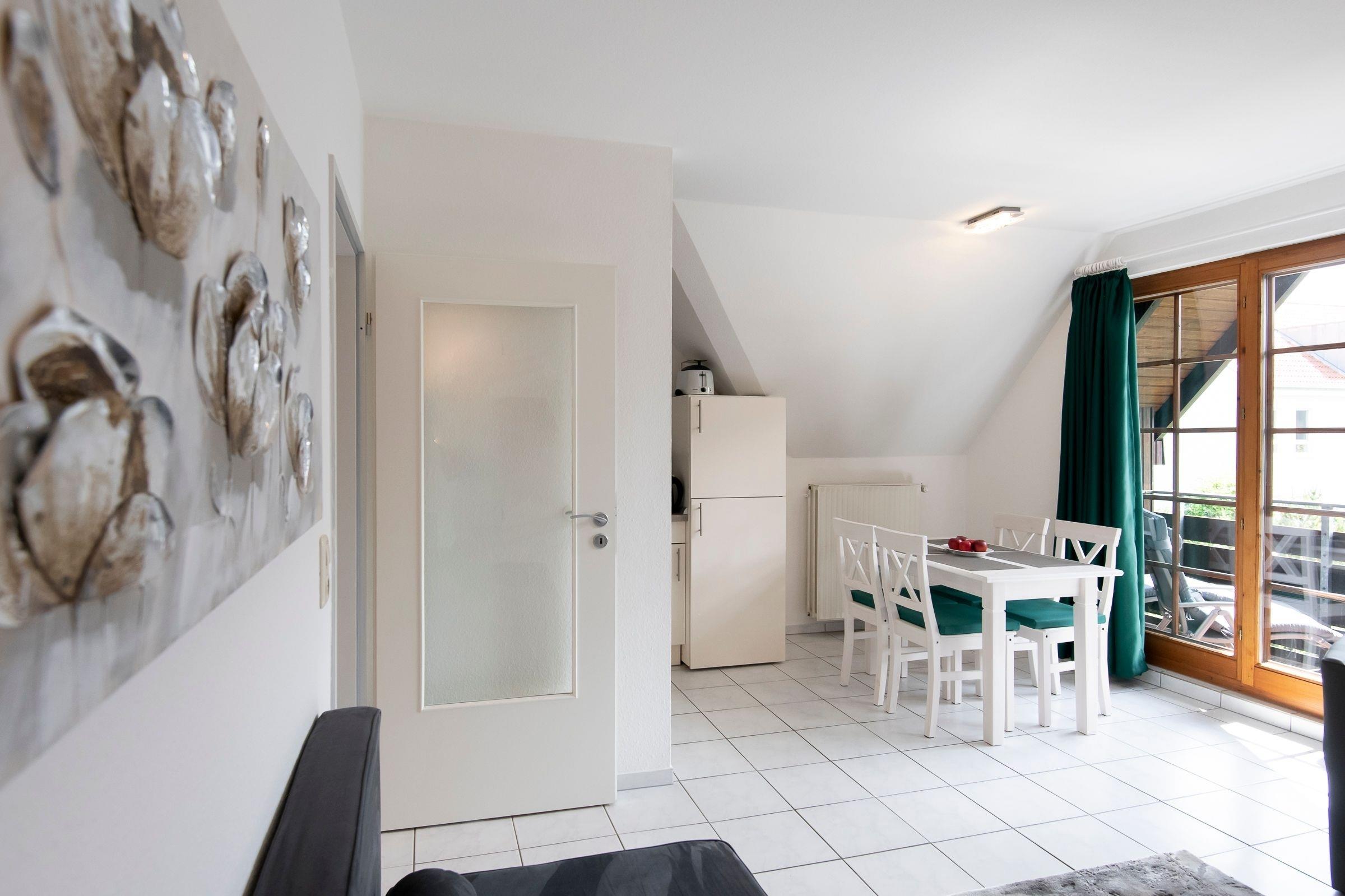 Auf 2 Zimmer verteilen sich hier das Schlafzimmer mit einem Doppelbett und das helle Wohnzimmer im Landhausstil mit gemütlicher Schlafcouch, angrenzender offener Küche und Essbereich. Für Unterhaltung sorgen ein TV und ein Radio. Vom Wohnzimmer haben Sie Zugang zum möblierten Balkon mit Süd-Ausrichtung. Starten Sie hier doch direkt Ihren Tag mit frischen Brötchen und heißem Kaffee. Die Küche ist voll ausgestattet mit Backofen, Gefrierfach, Herd, Kaffeemaschine, Kühlschrank, Mikrowelle, Spülmaschine, Toaster und Wasserkocher. Das moderne Bad mit Dusche und Föhn rundet diese Ferienwohnung ab.