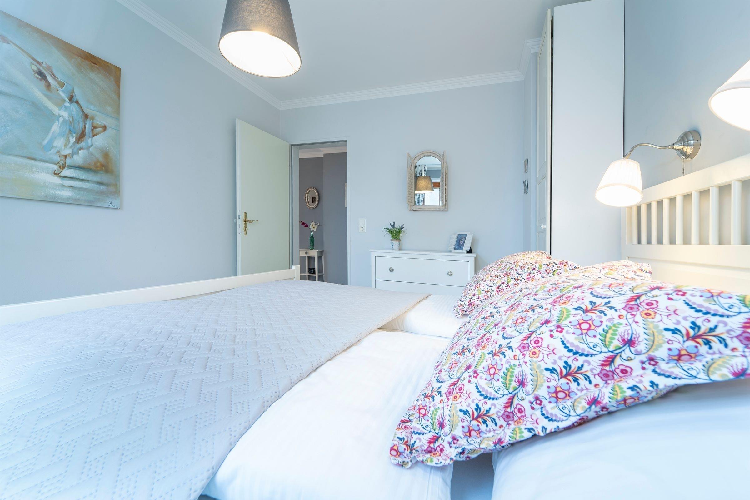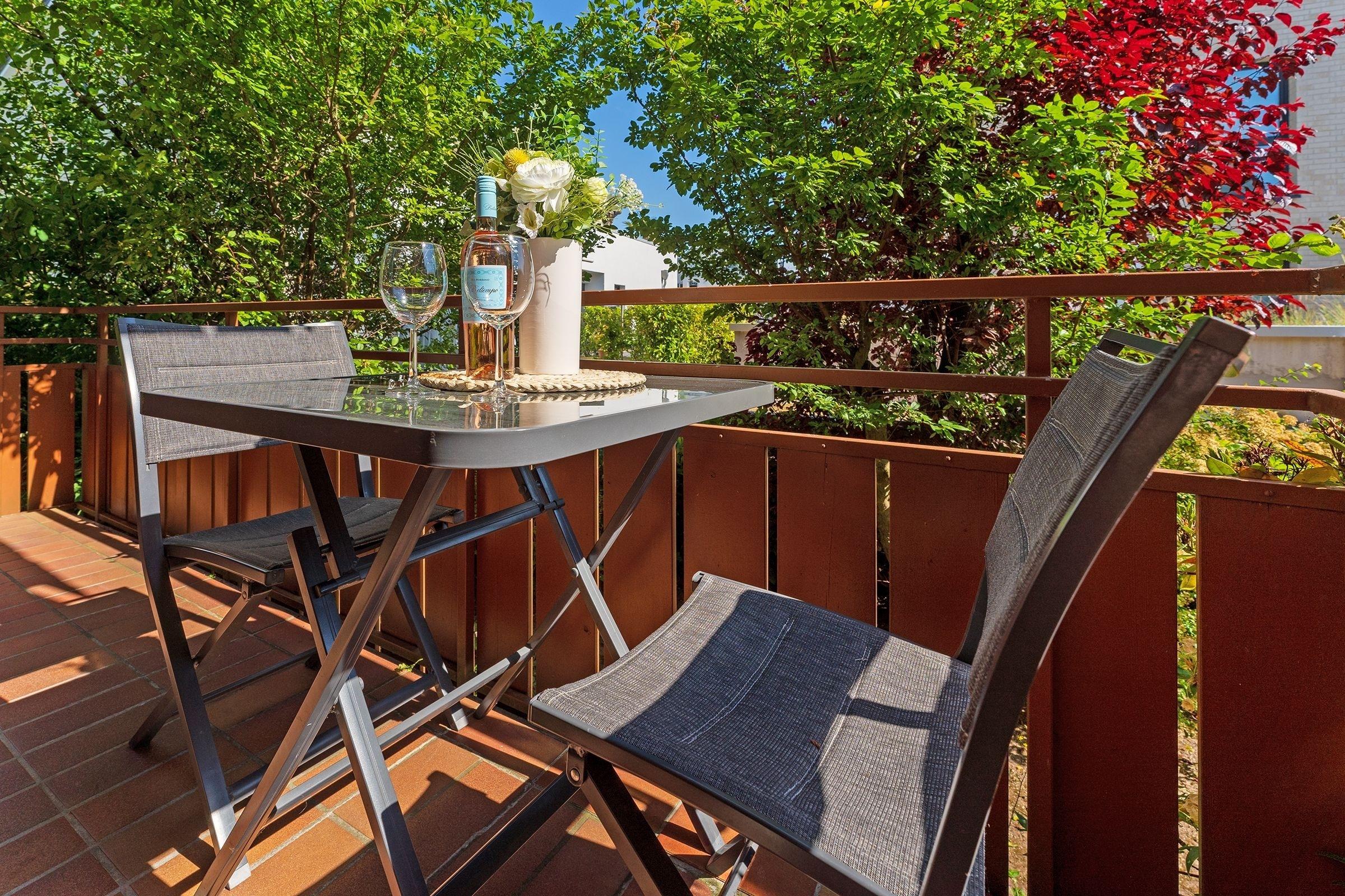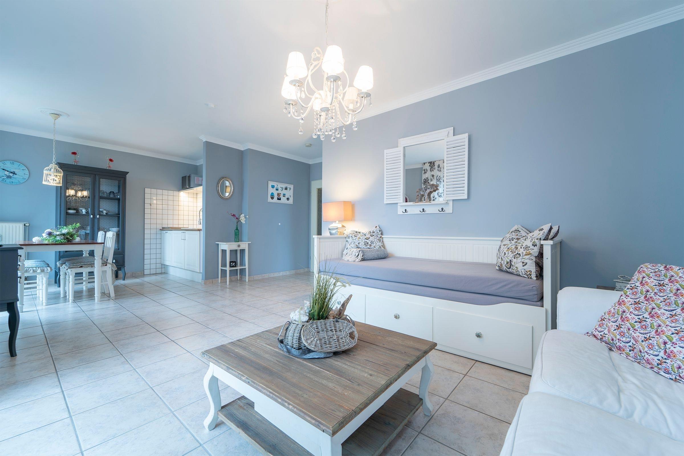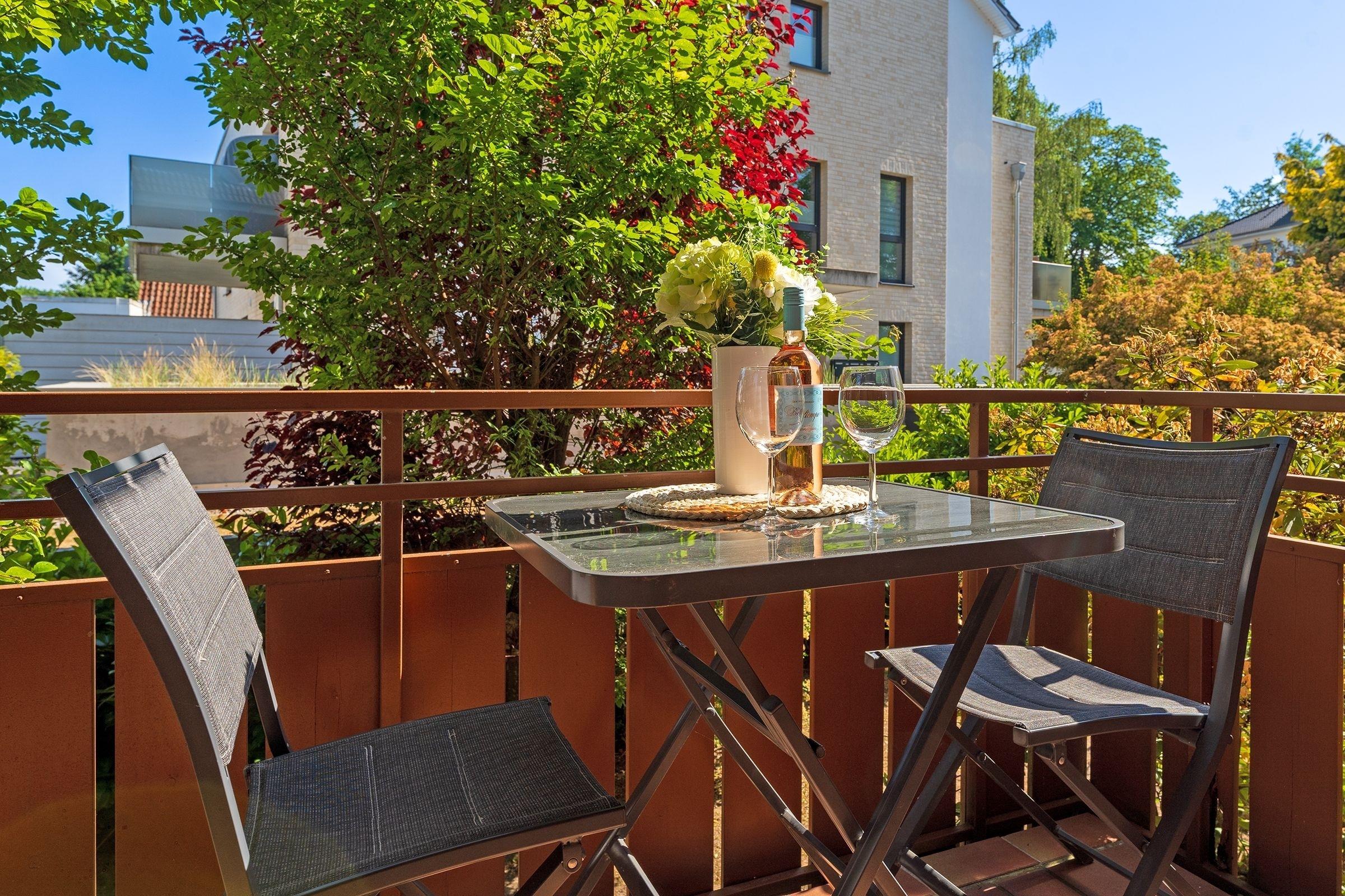 Das Appartement verfügt im Wohnbereich über ein ausziehbares Kojenbett (80x200 cm bzw. 160x200 cm), welches 2 Personen erholsamen Schlaf bietet. Ein Fernseher (mit DVB-T Empfang) mit integriertem Radio-Empfang sorgen für Unterhaltung. Außerdem befinden sich im Wohnraum der Essplatz und die moderne komplett eingerichtete Küchenzeile mit: 2-Platten-Cerankochfeld, Spülmaschine, Mikrowelle, Kaffeemaschine, Wasserkocher und Toaster. Das Schlafzimmer erwartet Sie mit einem Doppelbett (180x200 cm). Das Badezimmer verfügt über Dusche und Haartrockner. Der Balkon ist mit Balkonmöbeln ausgestattet. Der WLAN-Anschluss ist inklusive.