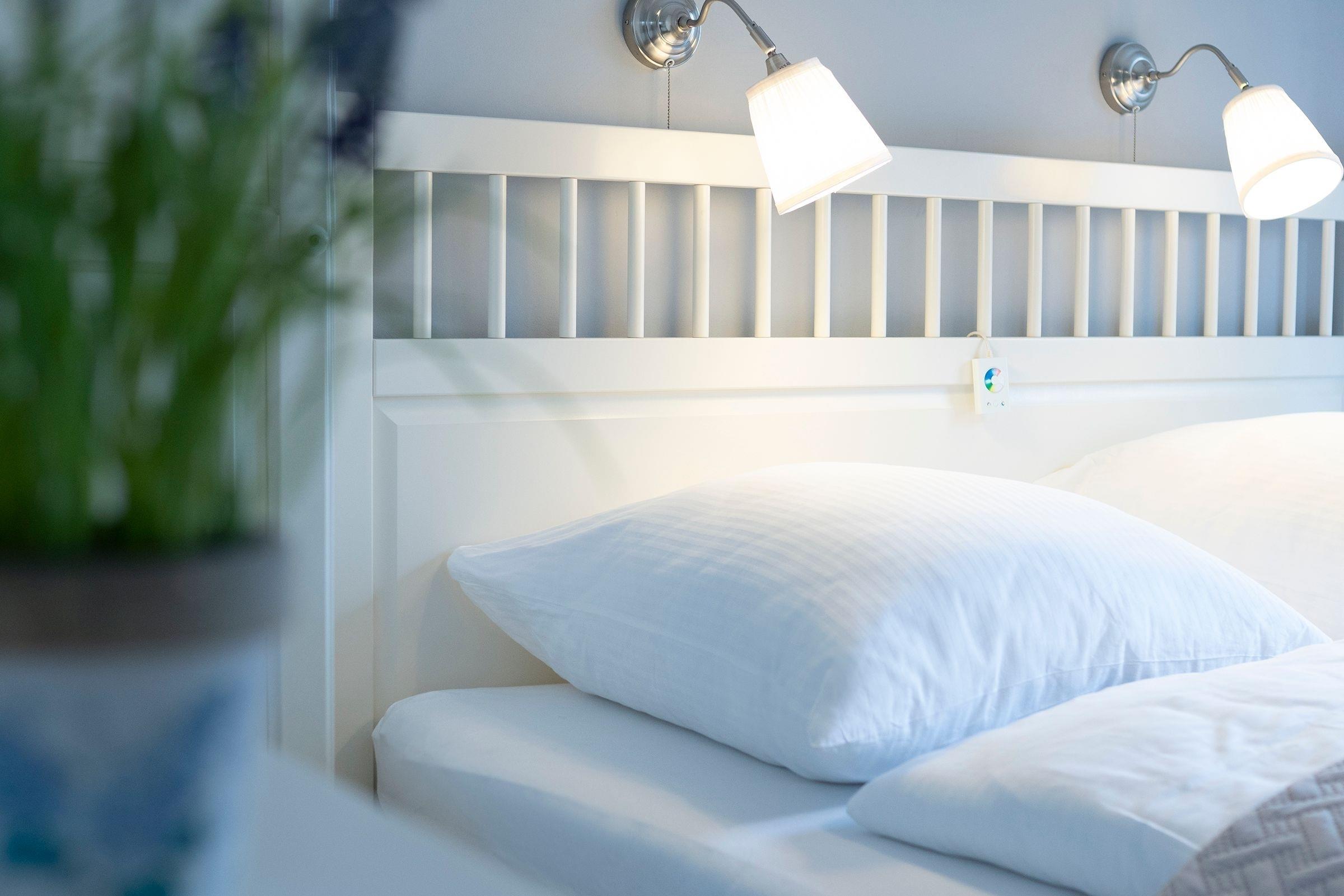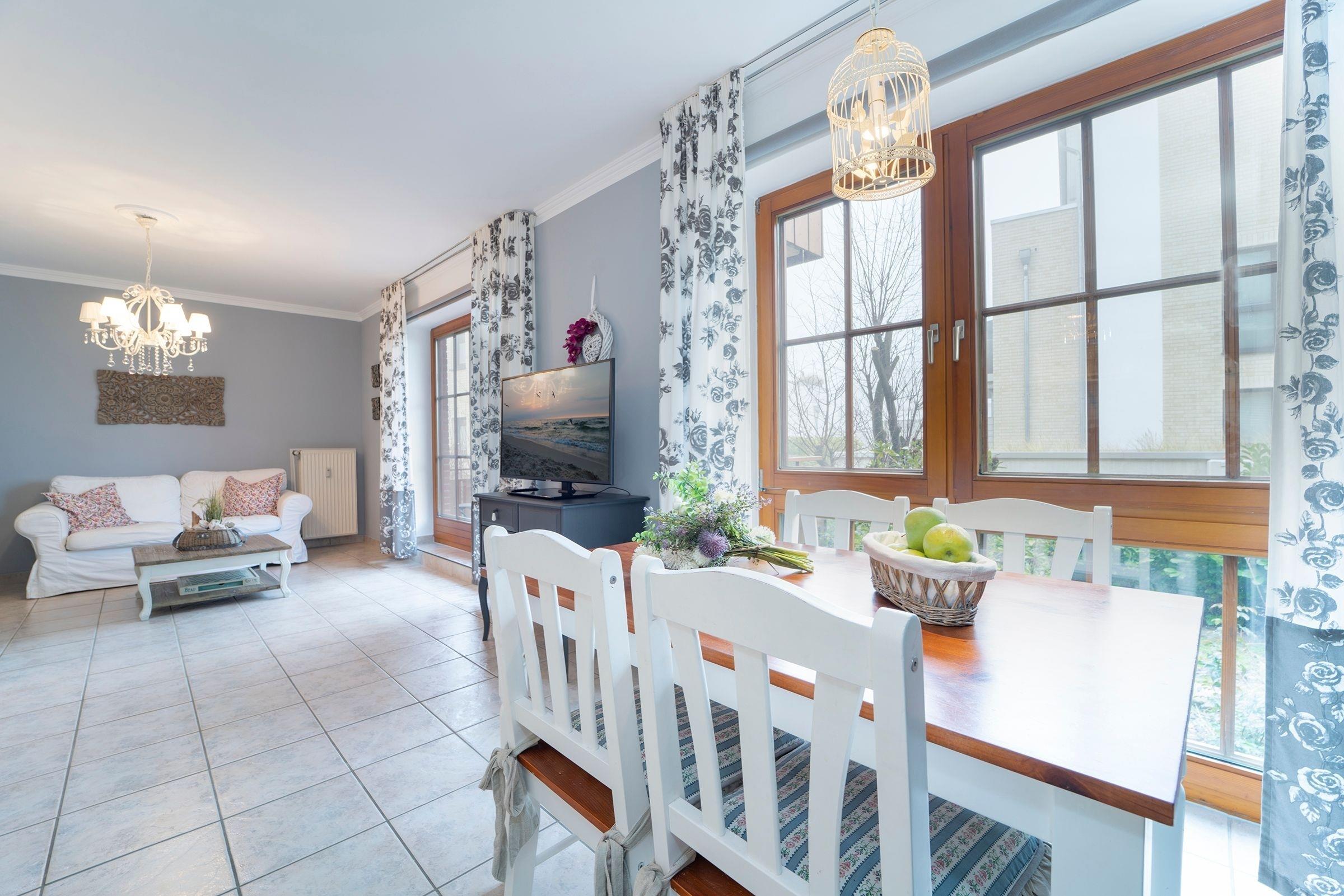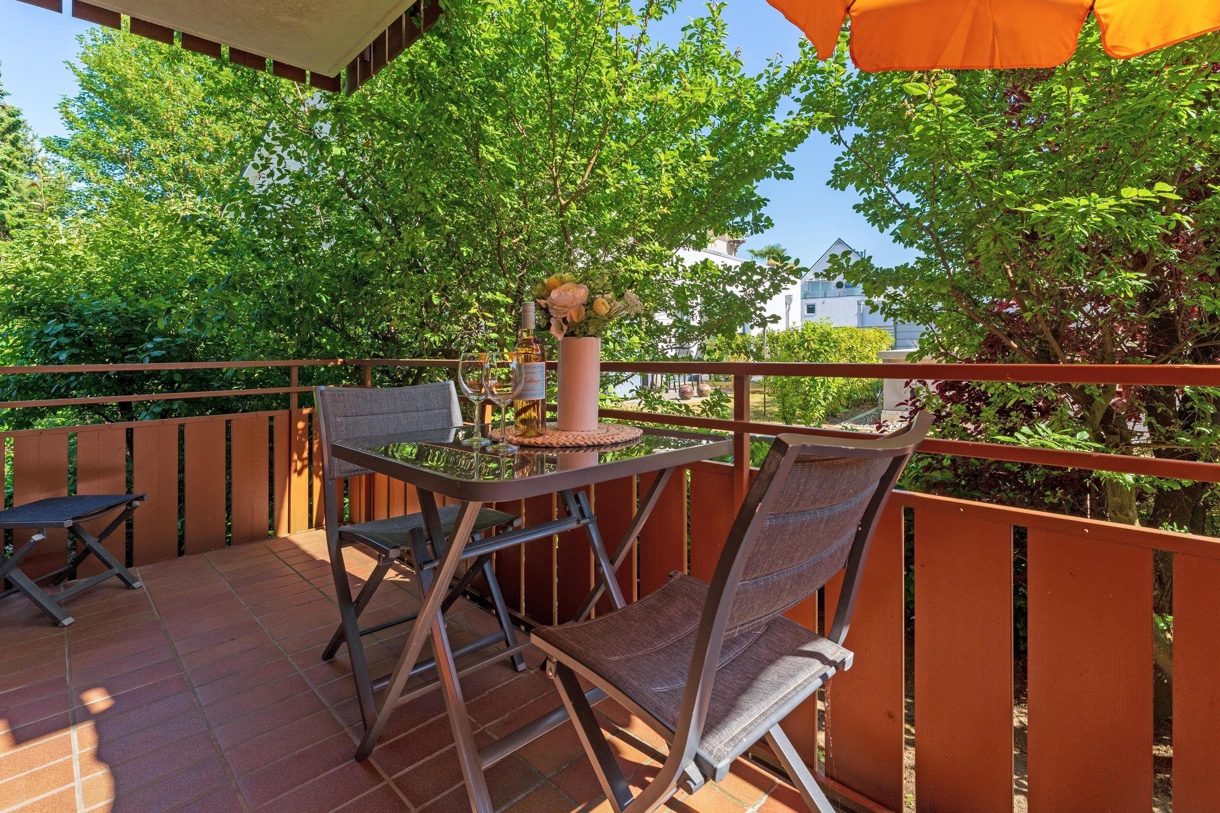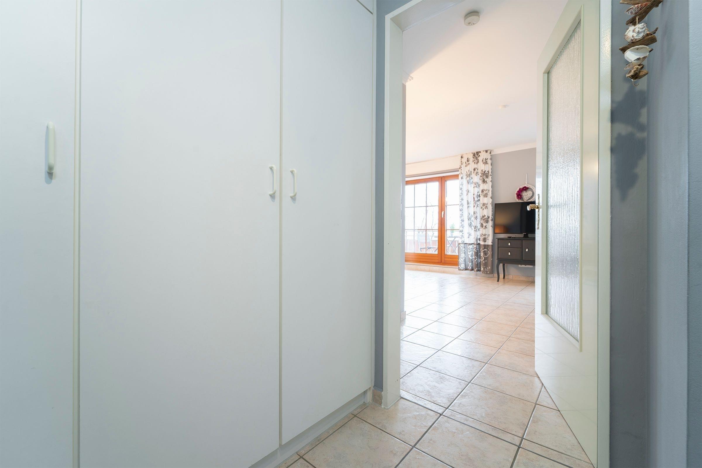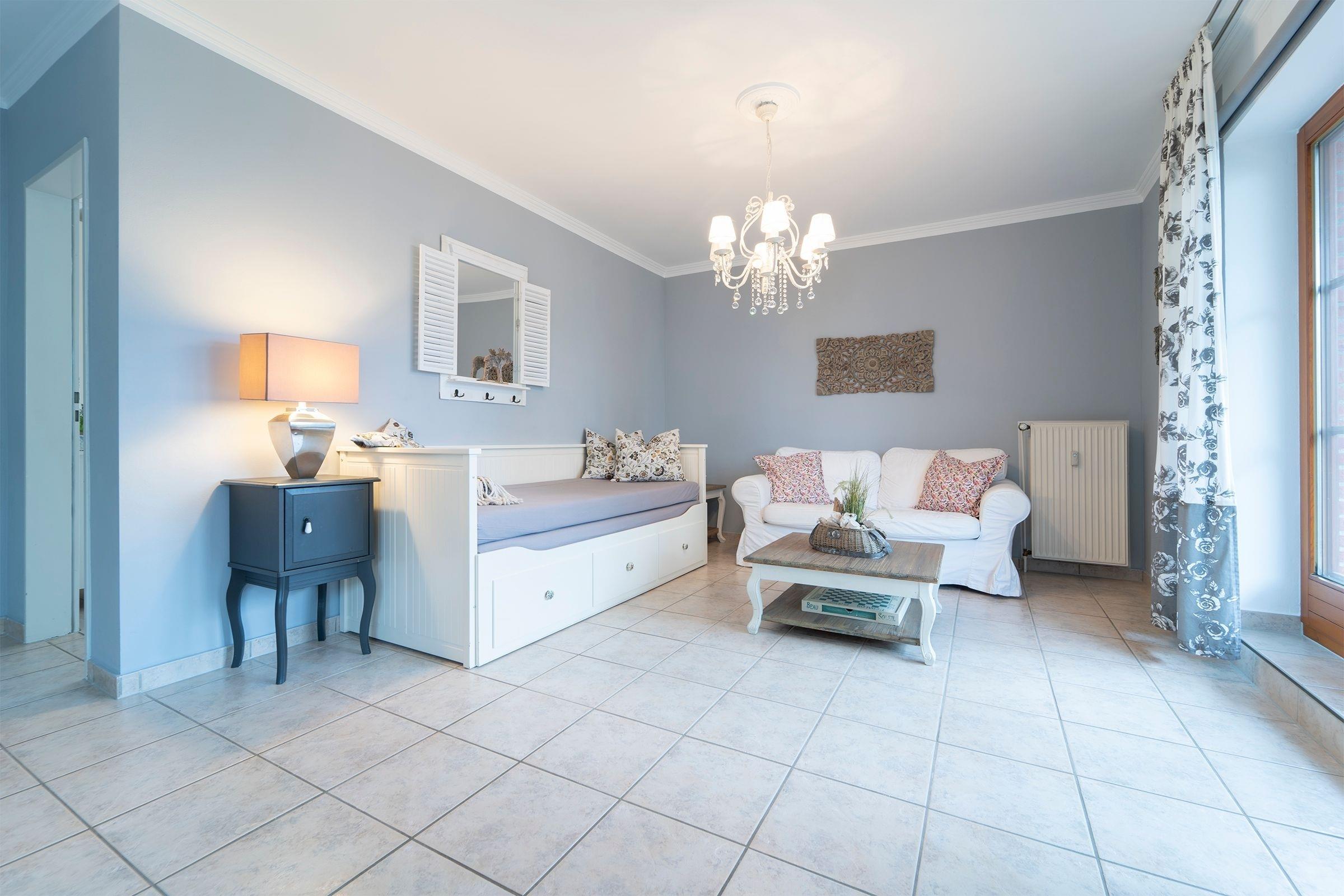Das Appartement verfügt im Wohnbereich über ein ausziehbares Kojenbett (80x200 cm bzw. 160x200 cm), welches 2 Personen erholsamen Schlaf bietet. Ein Fernseher (mit DVB-T Empfang) mit integriertem Radio-Empfang sorgen für Unterhaltung. Außerdem befinden sich im Wohnraum der Essplatz und die moderne komplett eingerichtete Küchenzeile mit: 2-Platten-Cerankochfeld, Spülmaschine, Mikrowelle, Kaffeemaschine, Wasserkocher und Toaster. Das Schlafzimmer erwartet Sie mit einem Doppelbett (180x200 cm). Das Badezimmer verfügt über Dusche und Haartrockner. Der Balkon ist mit Balkonmöbeln ausgestattet. Der WLAN-Anschluss ist inklusive.