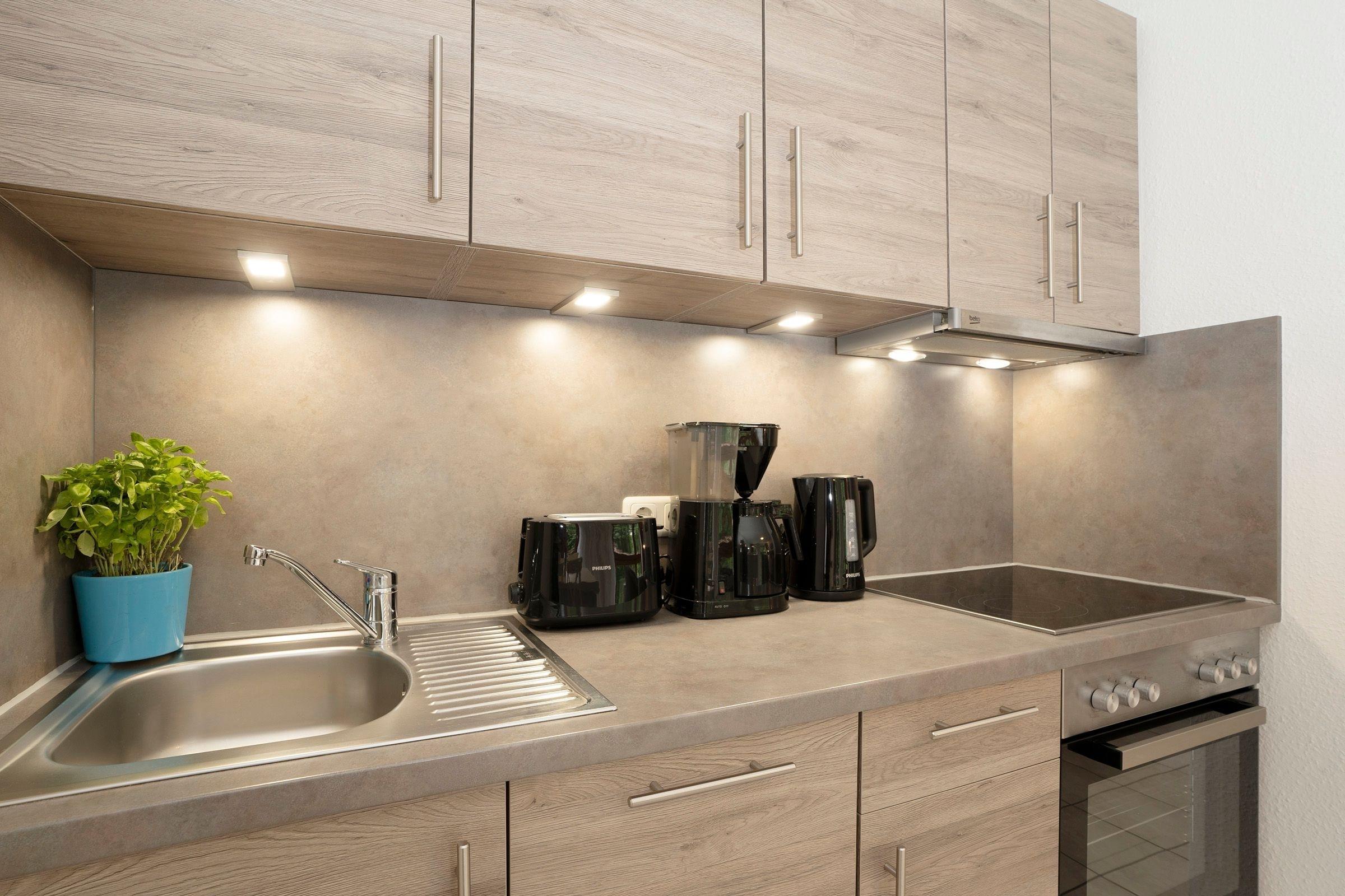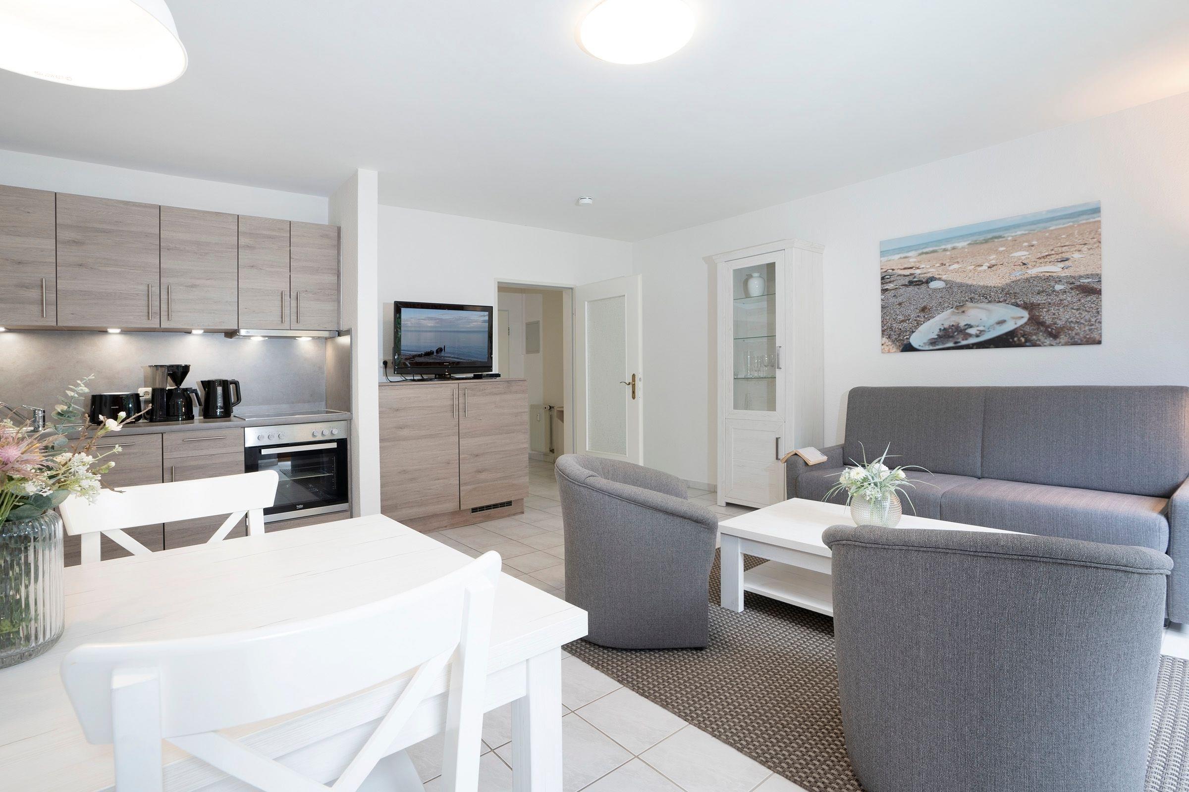 Ein Wohnzimmer mit Kabel-TV und Schlafcouch (140x200 cm), Essplatz und Küchenzeile mit Backofen, Geschirrspüler und 4-Platten-Herd. Der Balkon ist mit Gartenmöbeln ausgestattet. Schlafzimmer mit Doppelbett (2x 90x200 cm) und Radiowecker. Das Duschbad/WC ist hochwertig. Das gesamte Appartement ist weiß gefliest. WLAN steht kostenfrei zur Verfügung.