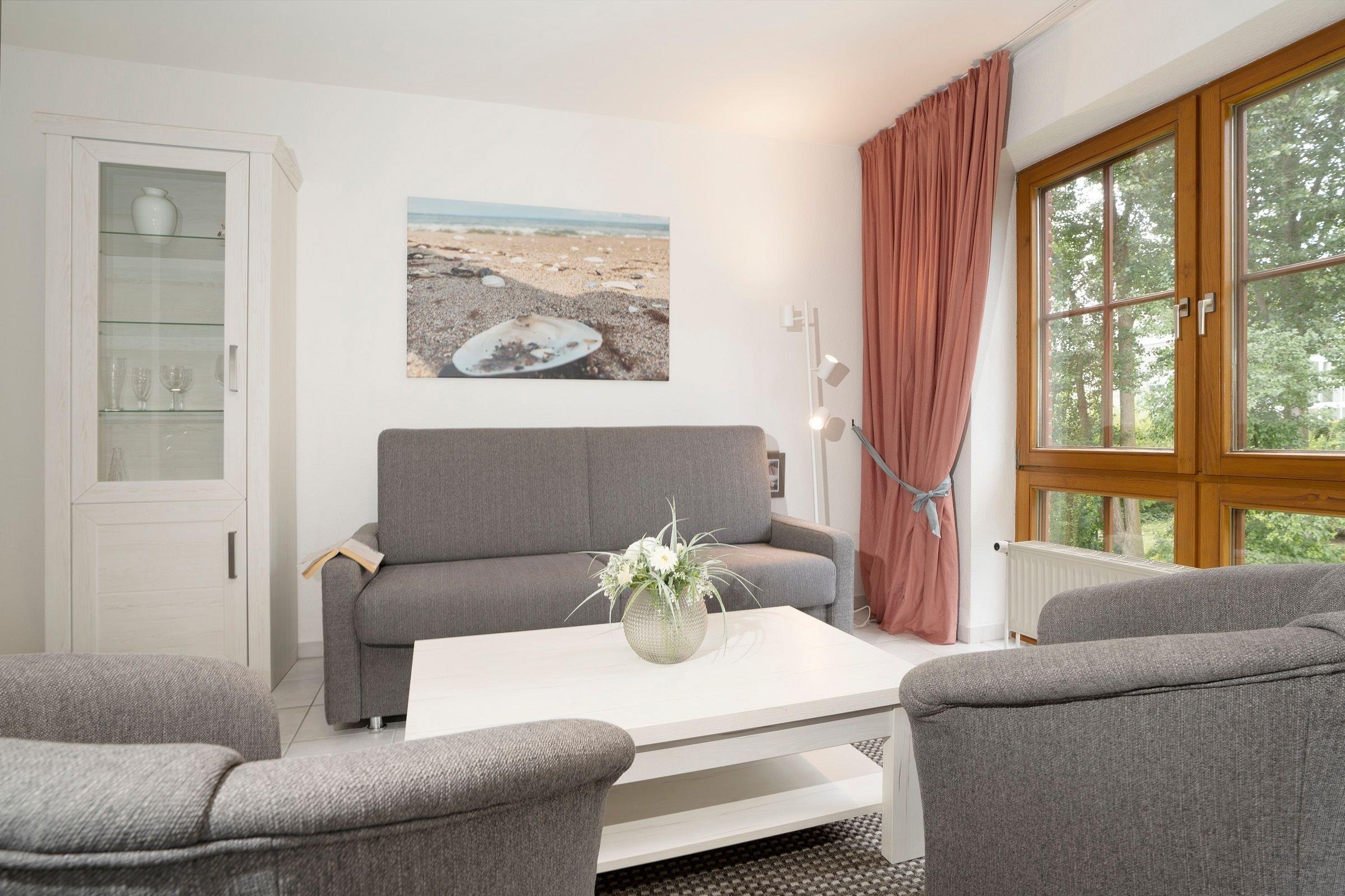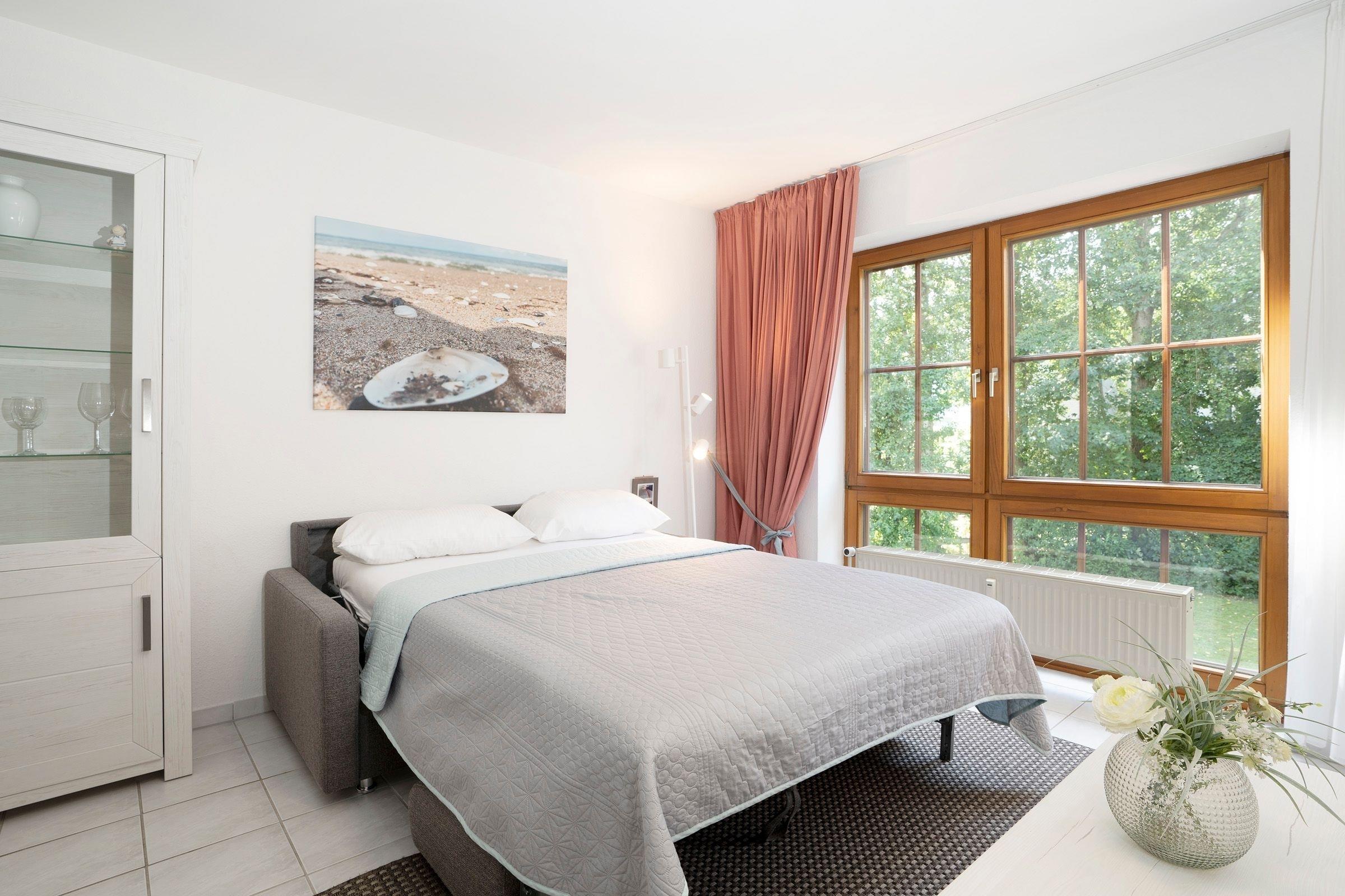 Wohnzimmer: 1 Schlafsofa (140x200 cm), Verdunkelung (Gardinen)