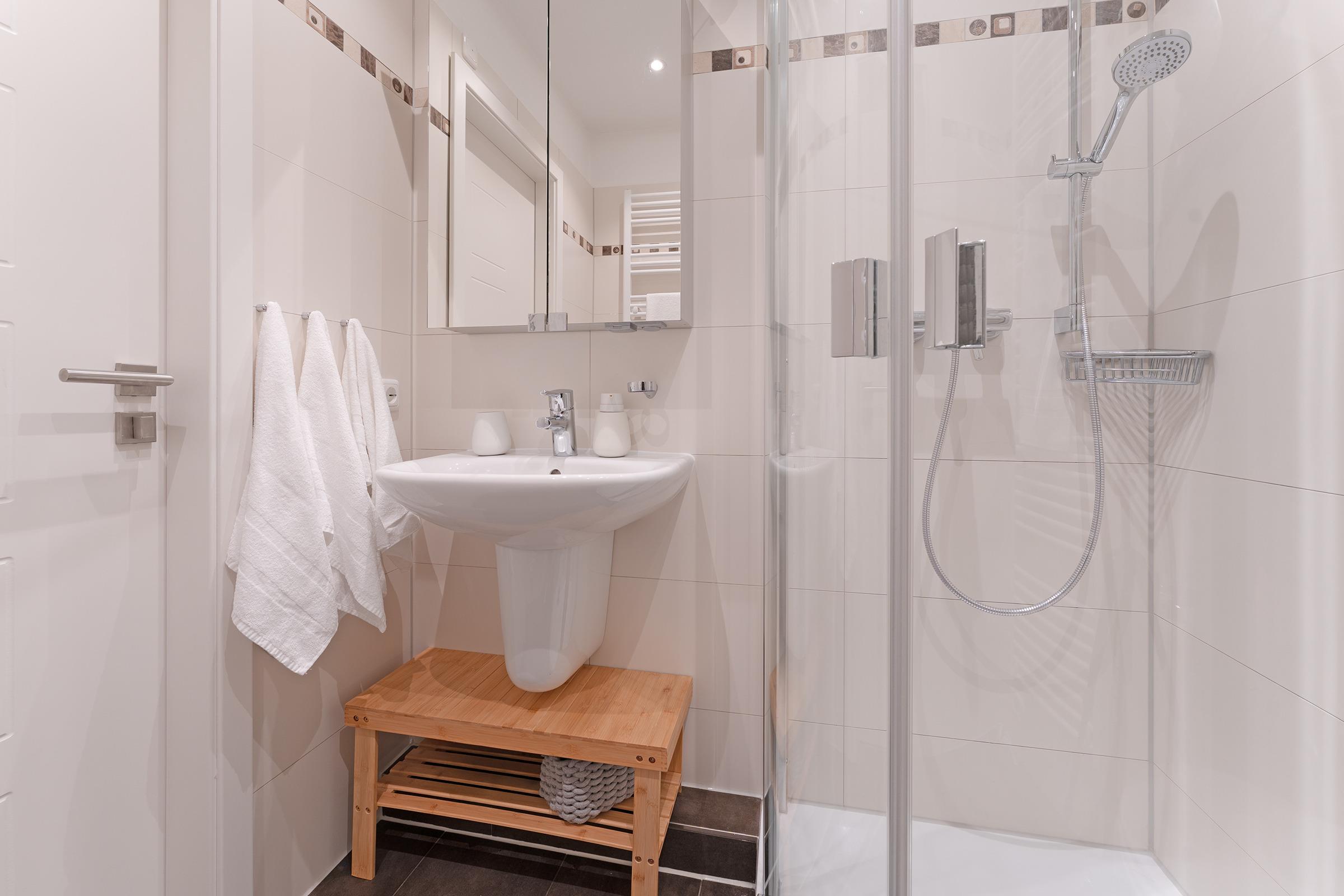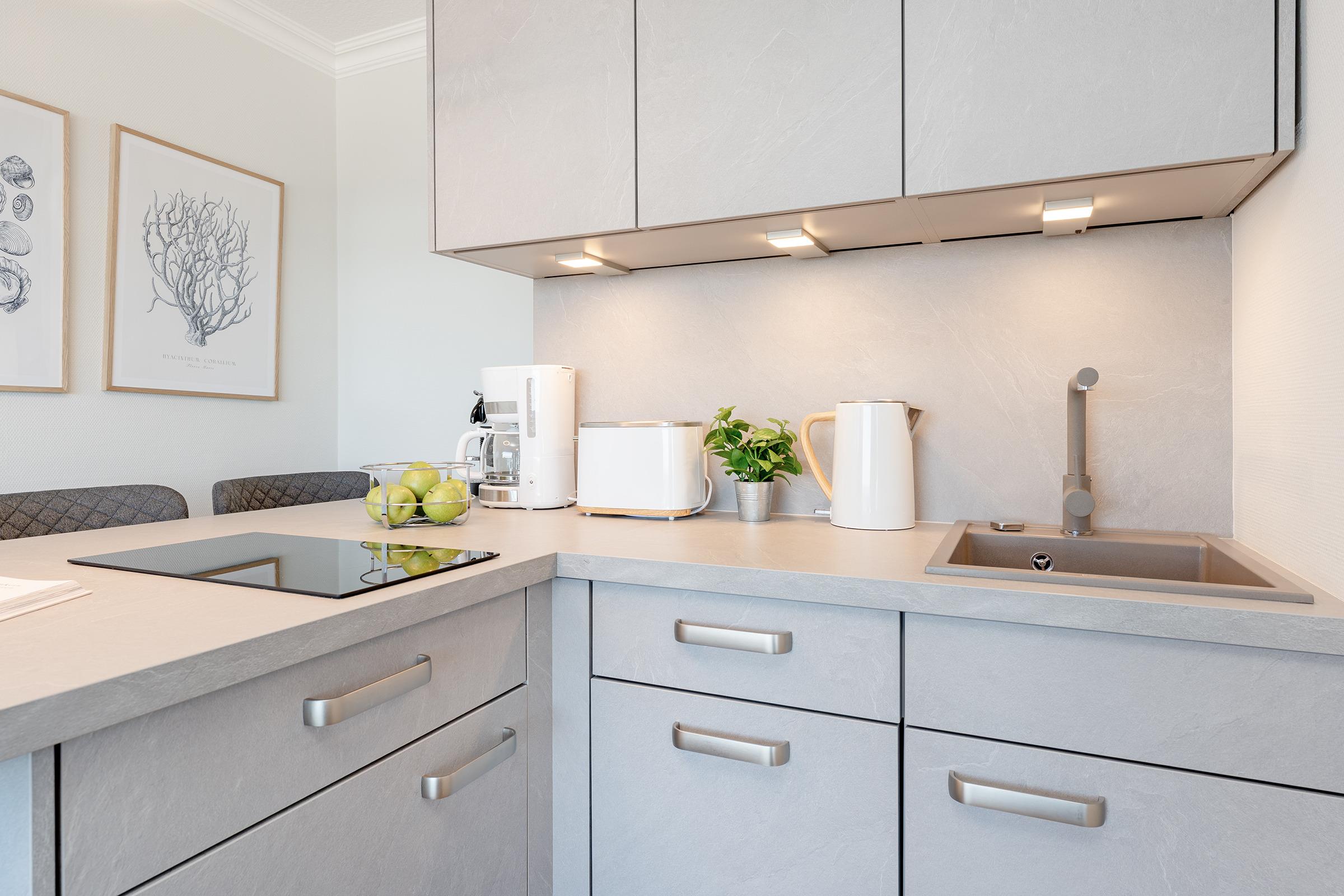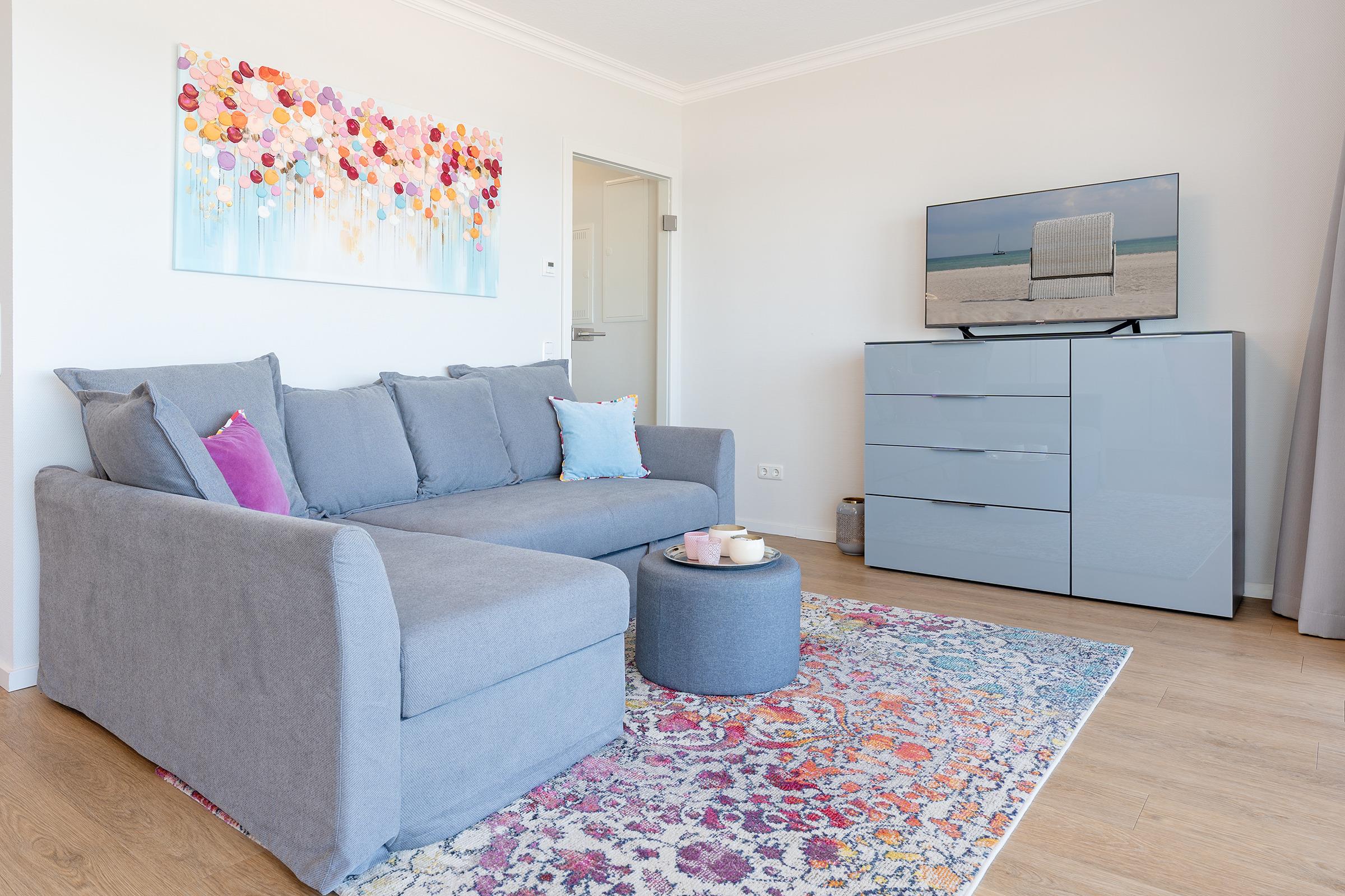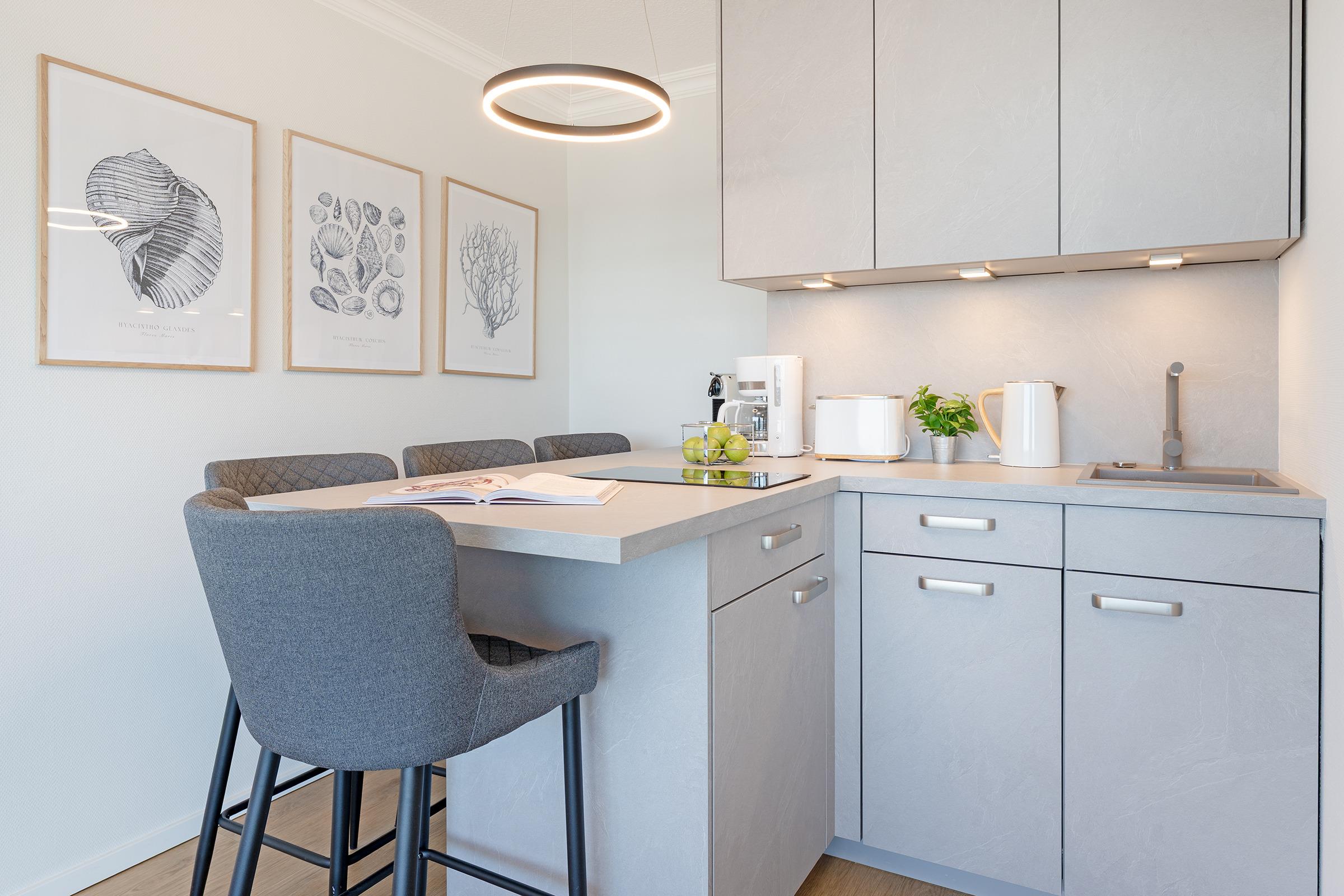 Im Schlafzimmer befindet sich ein hochwertiges Doppelbett (180x200 cm). Der Wohnraum mit der gemütlichen offenen Küche im amerikanischen Stil (Küchenzeile mit Tresen und Sitzmöglichkeiten für 4 Personen) bietet allen Komfort, den man sich im Urlaub wünscht! Auf der hochwertigen Sitzlandschaft mit Schlaffunktion (140x200 cm) steht eine weitere Übernachtungsmöglichkeit zur Verfügung. Die moderne Küchenzeile ist ausgestattet mit: Cerankochfeld (2 Kochplatten), Kühlschrank mit Gefrierfach, Geschirrspülmaschine, Wasserkocher und Kaffeemaschine (Kapselmaschine/Nespresso). Das komfortable Duschbad ist hell und modern gestaltet und sorgt mit Ausstattungsdetails wie einer geräumigen Eckdusche und Handtuchheizung für gute Laune am Morgen. Das Wohnzimmer ist mit einem LED TV ausgestattet. Auf dem Balkon kann man es sich in den Lounge-Sesseln gemütlich machen.
