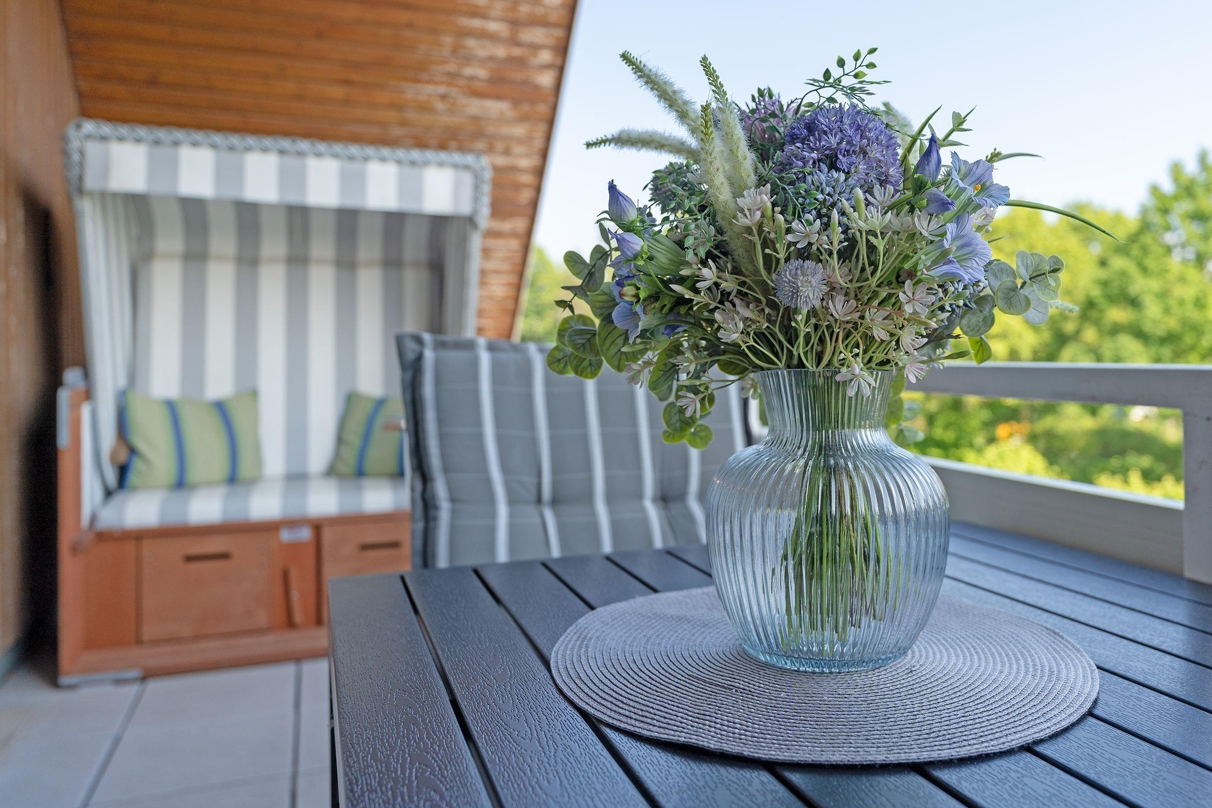 Das Appartement ist sehr geschmackvoll und modern eingerichtet und verfügt über einen sehr großzügigen Balkon mit Meerblick, Balkonmöbeln und einem Strandkorb. Das Zimmer ist in folgende 3 Bereiche aufgeteilt: Schlafbereich mit Doppelbett (2x 80x200 cm) und Stereoanlage. Wohnbereich mit Couchgarnitur und TV-Gerät. Essbereich mit Esstisch und komplett ausgestatteter Küchenzeile (4-Platten-Herd, Mikrowelle, Kaffeemaschine, Wasserkocher und Toaster). Dusche/WC.