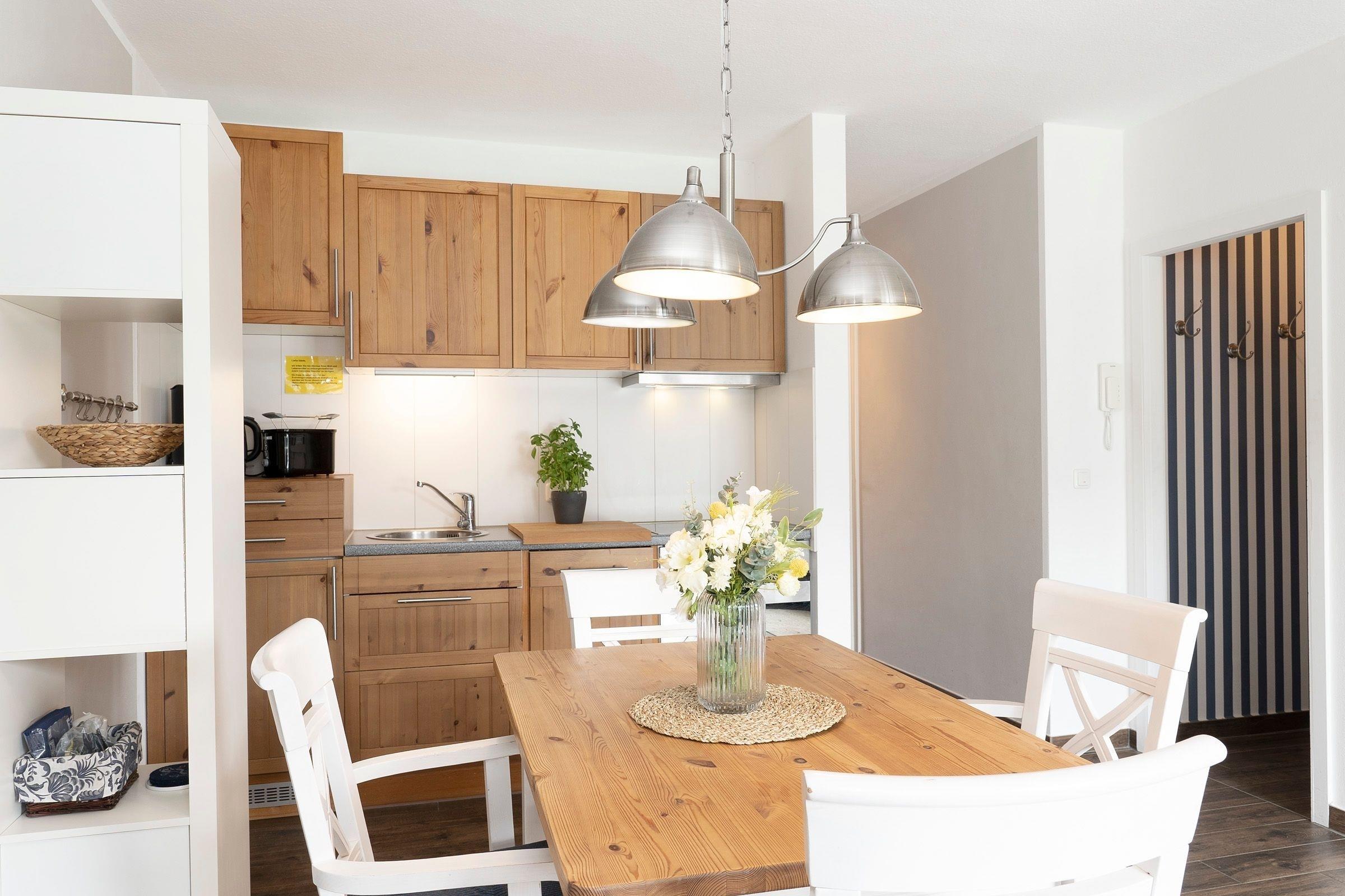 Die Ferienwohnung ist stilsicher eingerichtet und bietet Platz für 3 bis 4 Personen: Der Wohn- und Schlafbereich wurde mit hochwertigen Bodenfliesen in Dielenoptik ausgestattet. Die moderne Schlafcouch lädt zum Entspannen ein und bietet weitere Schlafmöglichkeiten (140x200 cm). Neue Möbel und liebevoll ausgesuchte Accessoires verleihen dem Ganzen einen maritimen Flair mit Wohlfühlatmosphäre. Im separaten Schlafzimmer mit Doppelbett (160x200 cm) können Sie nach einem aufregendem Urlaubstag erholsame Stunden verbringen. Auf dem großzügigen Balkon kann man durch die süd-westliche Ausrichtung Sonne bis in den Abend genießen.