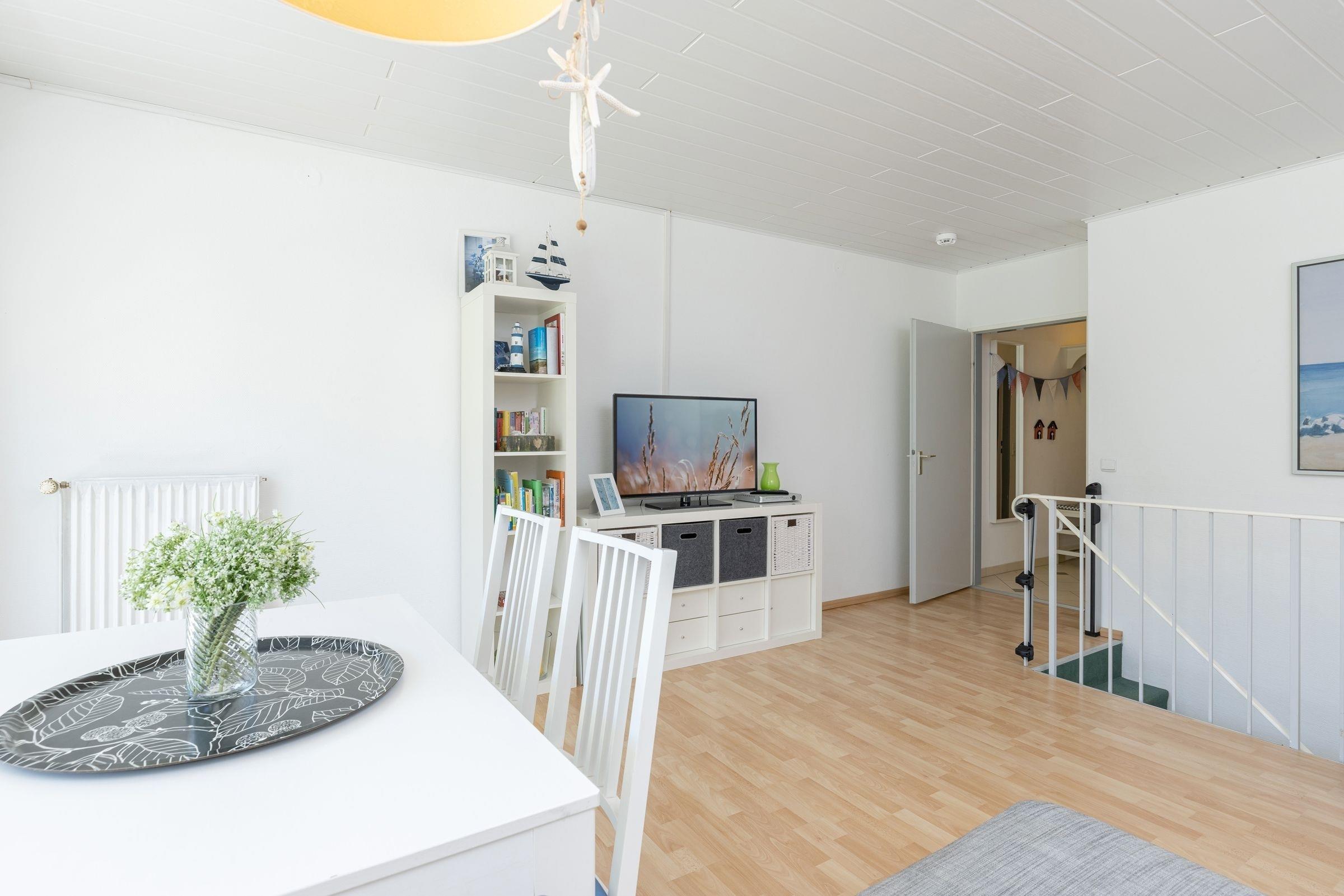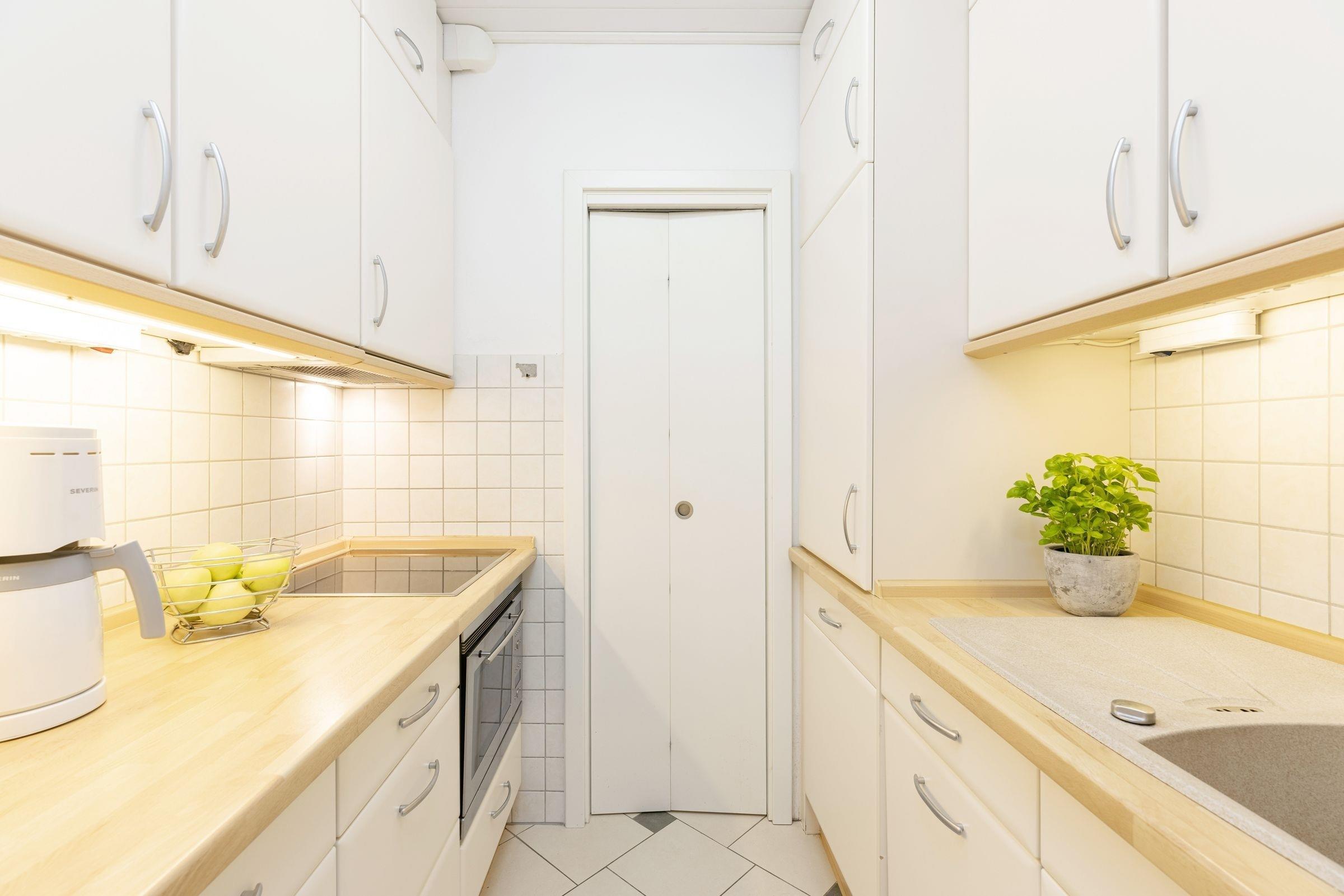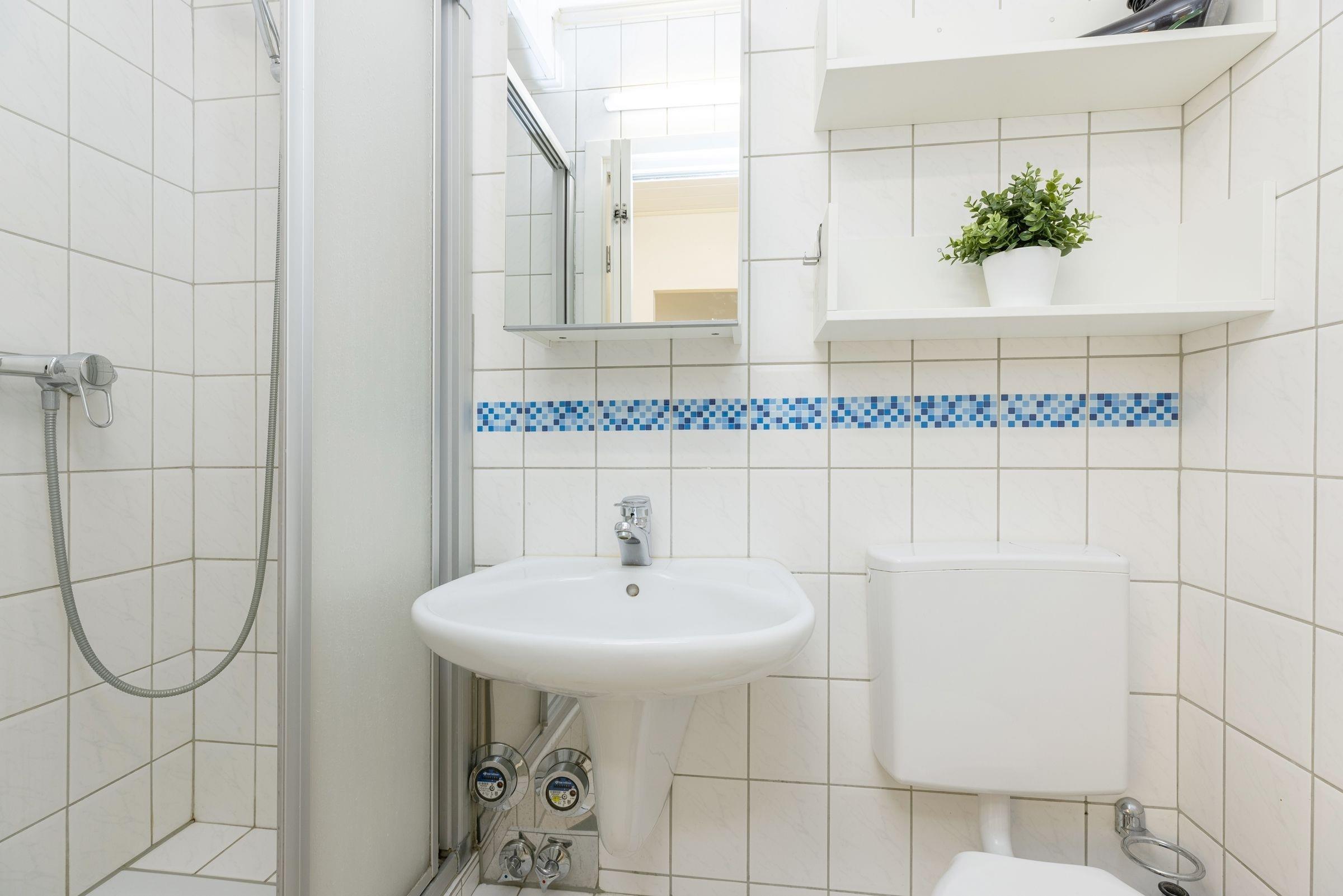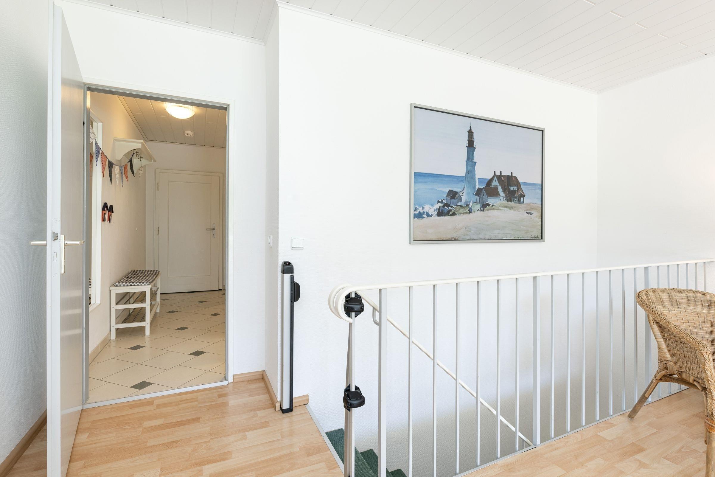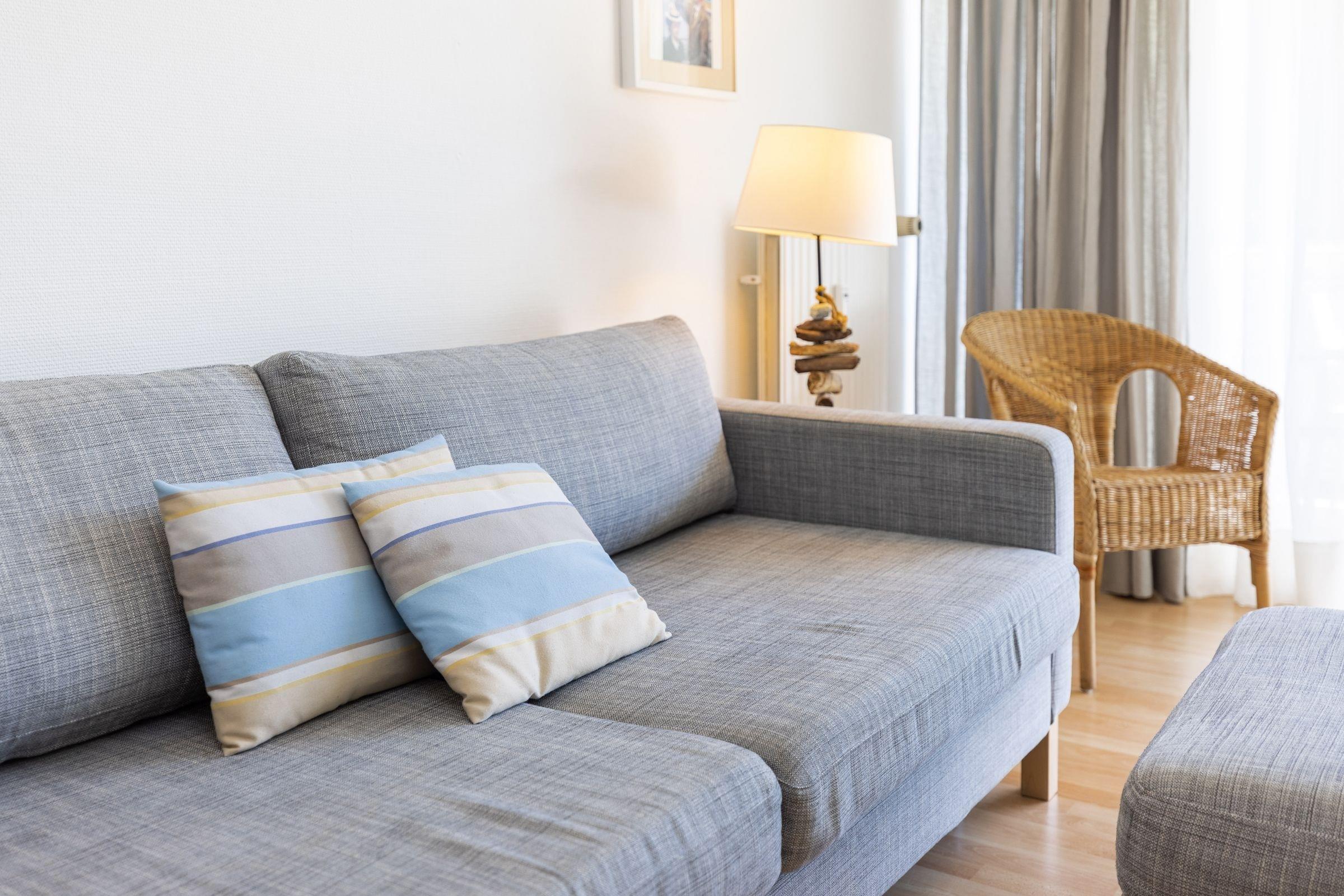 Der Flur führt in einen geräumigen Wohnbereich in dem die ganze Familie zusammen kommen kann. Hochwertige Möbel und ein Fernseher statten diesen Bereich aus. Verbringen Sie entspannte Stunden auf der Couch oder essen Sie gemeinsam am Esstisch. Von hier aus haben Sie Zugang zu einem Balkon, der mit gemütlichen Möbeln zum Verweilen einlädt. Starten Sie gemütlich in den Tag und genießen Sie die erfrischende Meeresluft bei einer Tasse Kaffee. Die Küche ist hochwertig ausgestattet. Hierzu gehört ein Kühlschrank inklusive ein Gefrierfach, ein Wasserkocher, eine Kaffeemaschine, Mikrowelle, Toaster, und ein Herd. Für ausreichend Komfort im Urlaub steht hier auch eine Spülmaschine bereit. Ein WLAN-Anschluss gehört ebenfalls zur Ausstattung.
