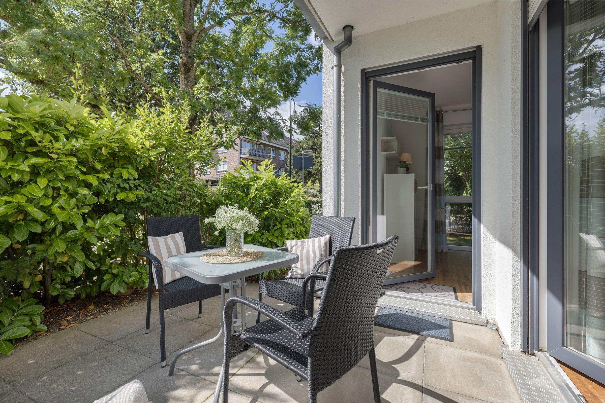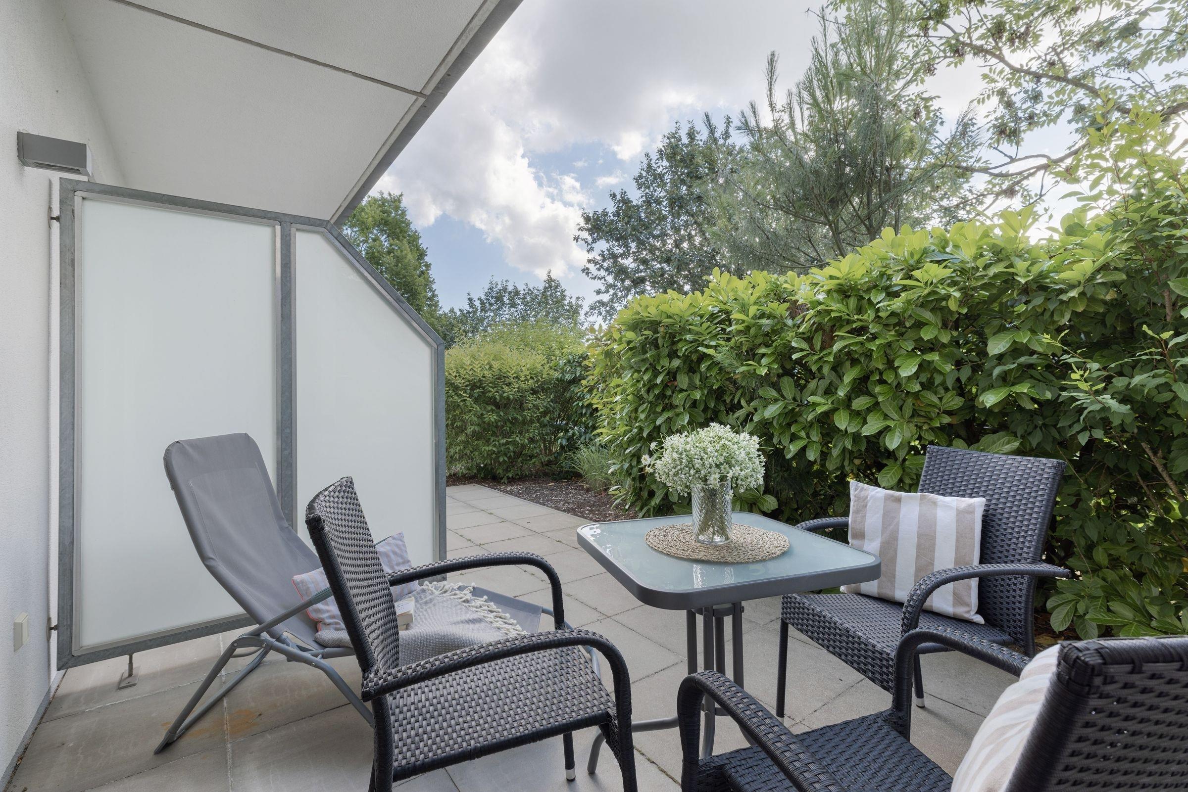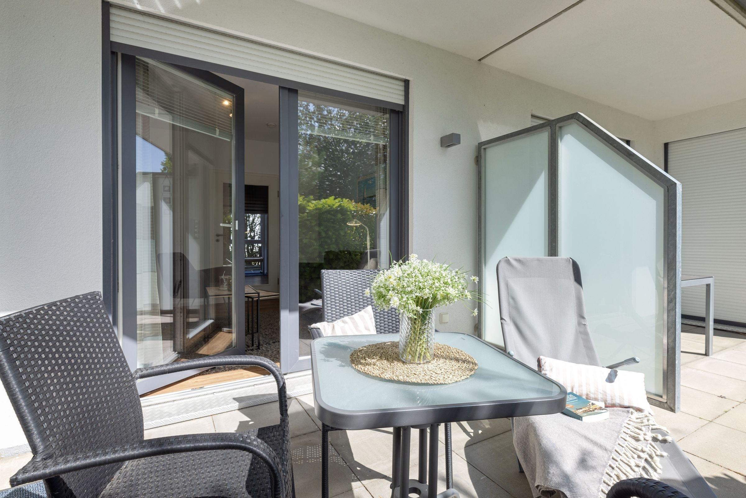 Die moderne Küchenzeile ist mit allem Komfort ausgestattet. Ein Kinderhochstuhl steht kostenlos zur Verfügung. Das bequeme Sofa lässt sich mit wenigen Handgriffen als Schlafsofa (140x180 cm) für bis zu 2 Kinder umfunktionieren. Eine Fußbodenheizung sorgt für Wärme. Die Terrasse liegt nach Süden und hält für Sie außer Tisch und Stühlen auch eine Sonnenliege bereit. Eine kleine Rasenfläche gehört zur Wohnung. Das Schlafzimmer ist mit einem Verdunklungsrollo und die gesamte Wohnung mit elektrischen Rollläden ausgestattet. Das Doppelbett (2x 90x200 cm) verfügt über bequeme Matratzen. Das helle Tageslichtbad hat eine bodengleiche Dusche mit Regendusche. Neben der Fußbodenheizung sorgt ein Handtuchheizkörper für angenehme Wärme. Diese sehr schöne Ferienwohnung punktet durch ihre stilvolle, moderne Einrichtung und zentrale Lage direkt am Kurpark.