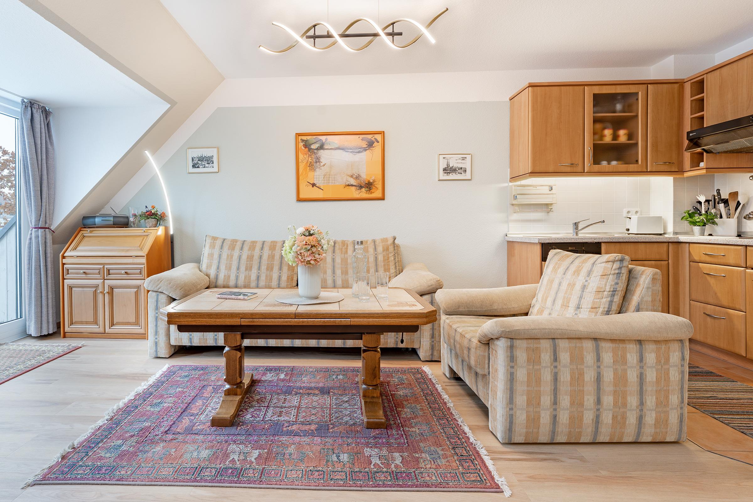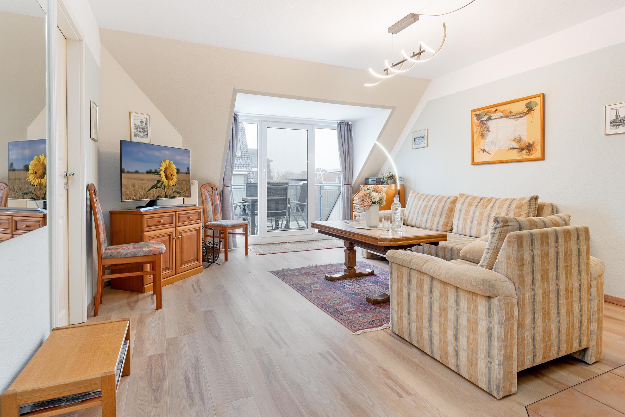 Es gibt einen Schlafraum mit einem Doppelbett (2x 90x200 cm) und ein helles Duschbad. Im Wohnraum befinden sich eine Couchgarnitur mit einem Sessel, welche zu einer weiteren Schlafgelegenheit (90x200 cm) umgewandelt werden kann, eine Musikanlage und ein TV. Die Küchenzeile ist ausgestattet mit Kühlschrank mit Gefrierfach, Geschirrspüler, 2-Plattenherd, Mikrowelle, Kaffeemaschine, Wasserkocher und Toaster. Der Couchtisch kann zum Esstisch umfunktioniert werden. Der Balkon bietet eine schöne Ausrichtung und verfügt über Gartenmöbel.