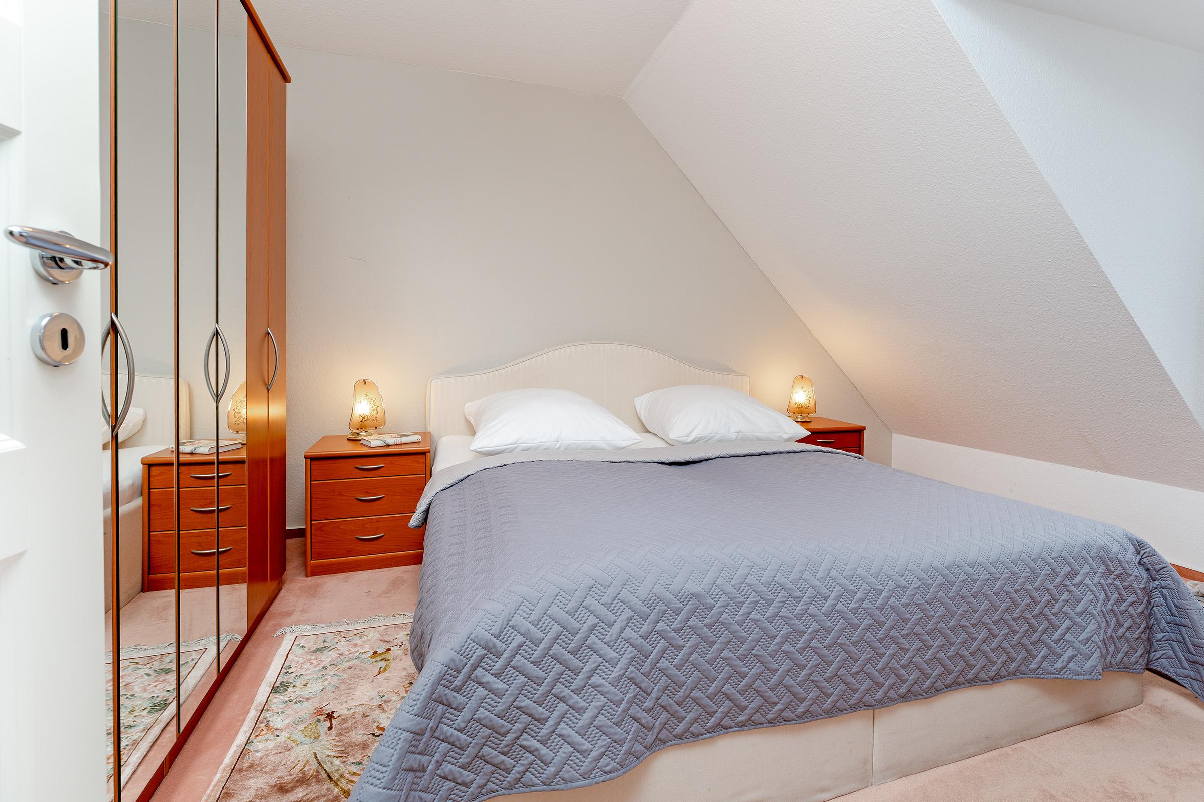 Schlafzimmer: 1 Doppelbett (180x200 cm), Kleiderschrank, Verdunkelungsmöglichkeit