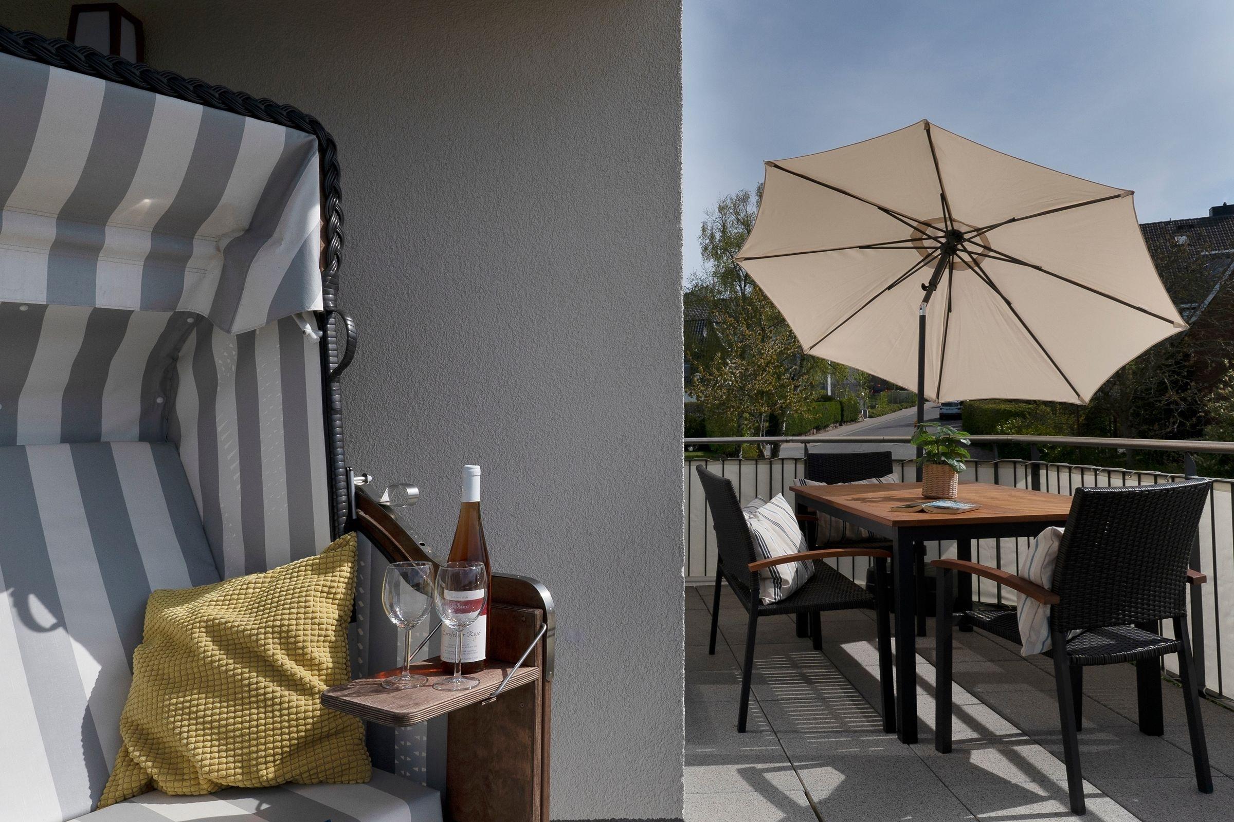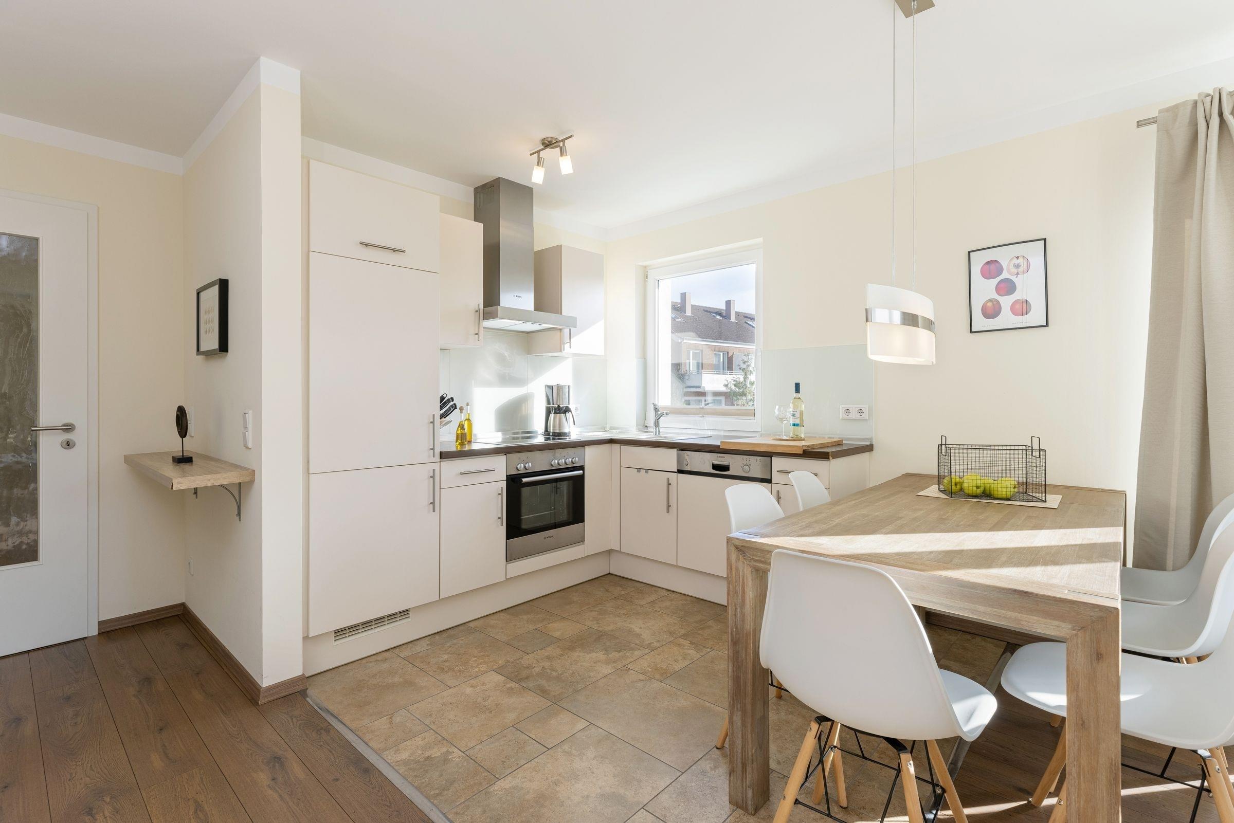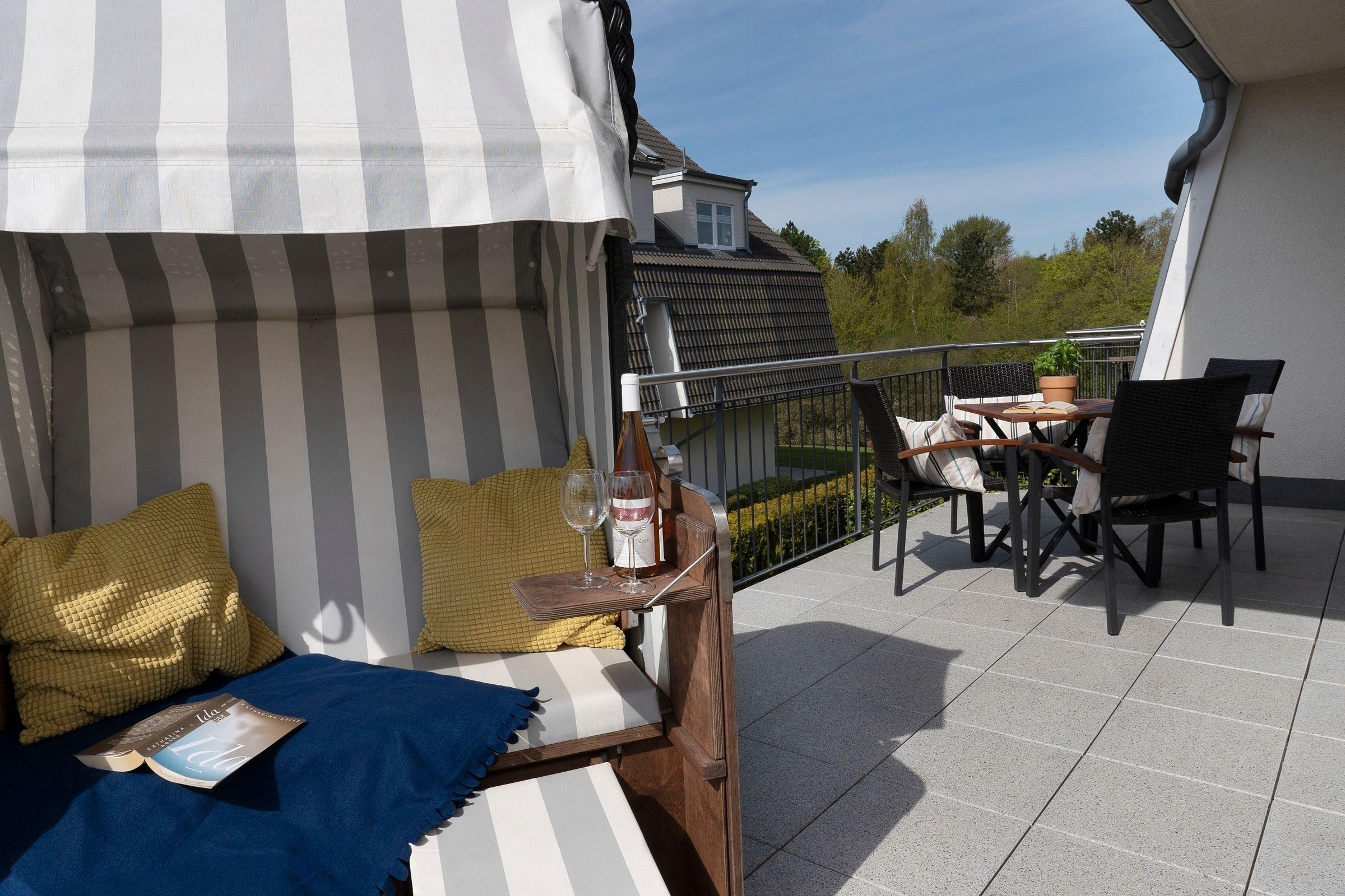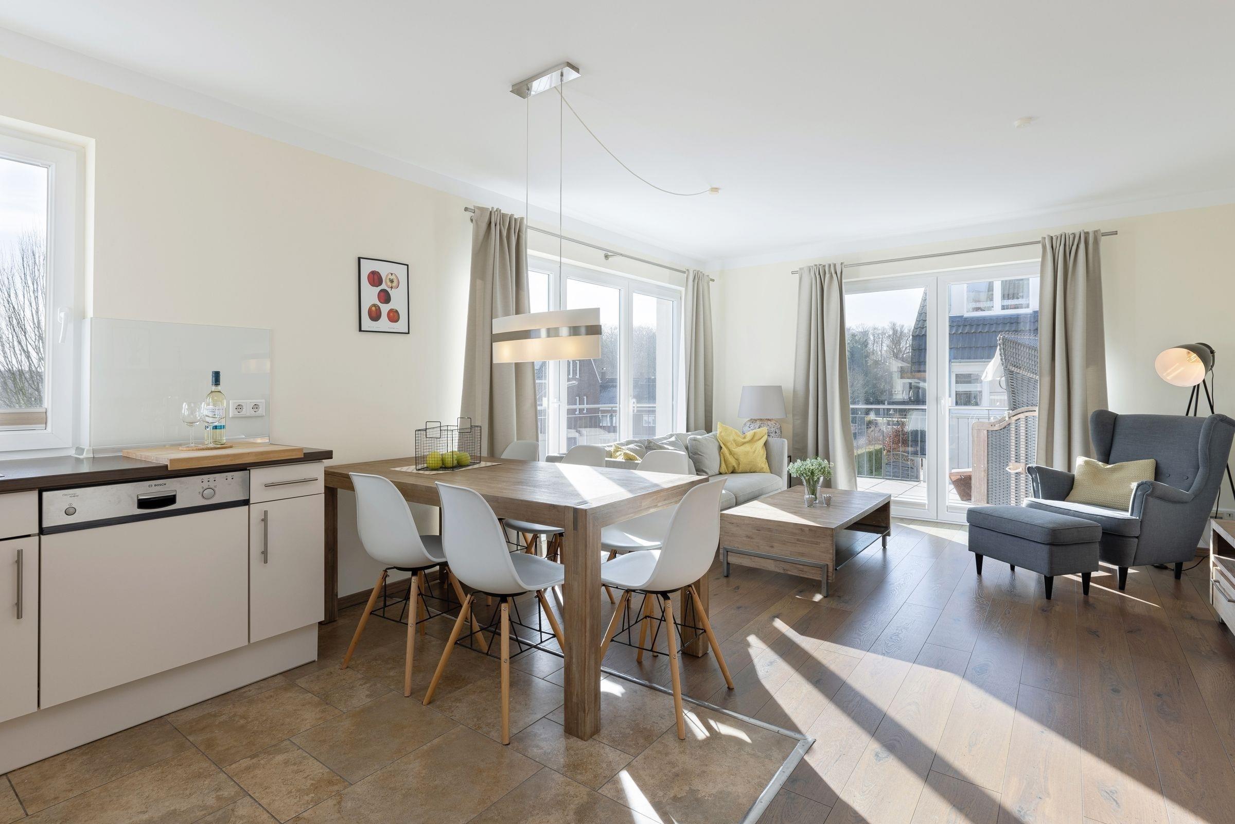 Es gibt zwei separate Schlafräume, von denen eines mit einem großen Doppelbett (2x 90x200 cm) und eines mit zwei Einzelbetten (je 90x200 cm) ausgestattet ist. Im großen Schlafzimmer befindet sich ein zusätzlicher TV. Beide Schlafräume sind mit geräumigen Kleiderschränken sowie Verdunkelungsplissees ausgestattet. Das moderne Bad verfügt neben der Dusche auch über eine Badewanne, und sorgt so für völlige Entspannung auch an einem regnerischen Tag. Im Wohnraum befinden sich eine moderne und gemütliche Couchgarnitur, ein DVD-Player und ein LCD-TV. Die offene und im Wohnraum integrierte Küchenzeile ist ausgestattet mit Kühlschrank inkl. Gefrierfach, 4-Plattenceranherd, Backofen, Geschirrspüler, Kaffeemaschine, Wasserkocher und Toaster direkt daneben steht der große Esstisch, ausgelegt für 4 Personen. Vom Wohnzimmer gelangen Sie auf den äußerst großzügigen Balkon, der eine schöne Ausrichtung in Richtung Sonne bietet und über Gartenmöbel und einen tollen Strandkorb verfügt.