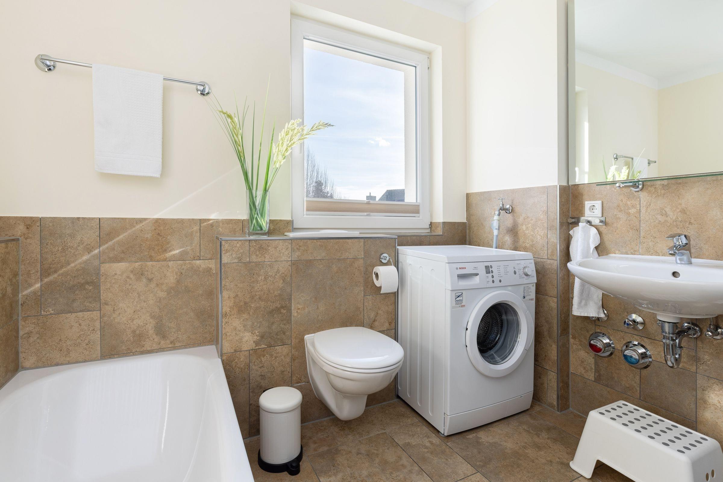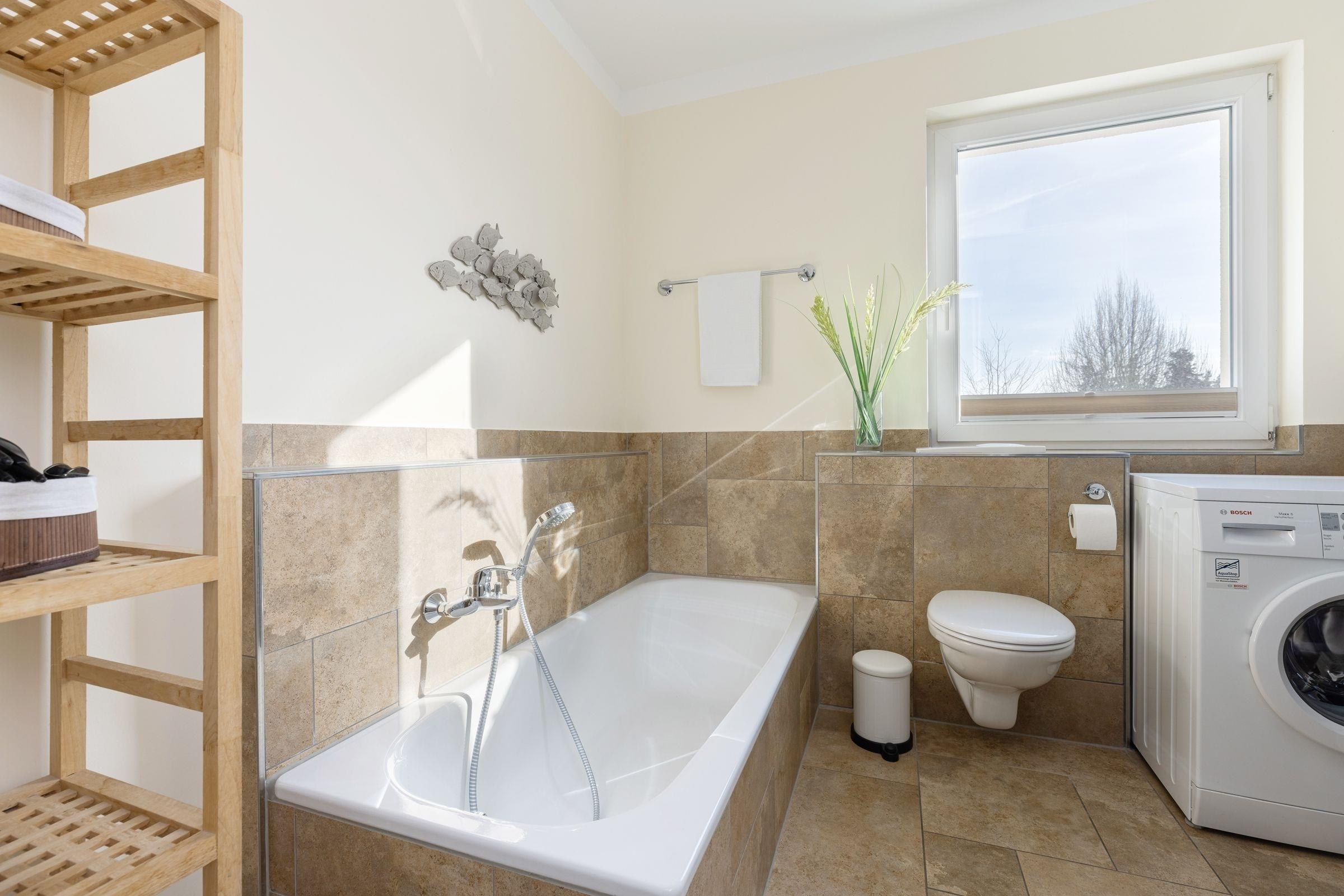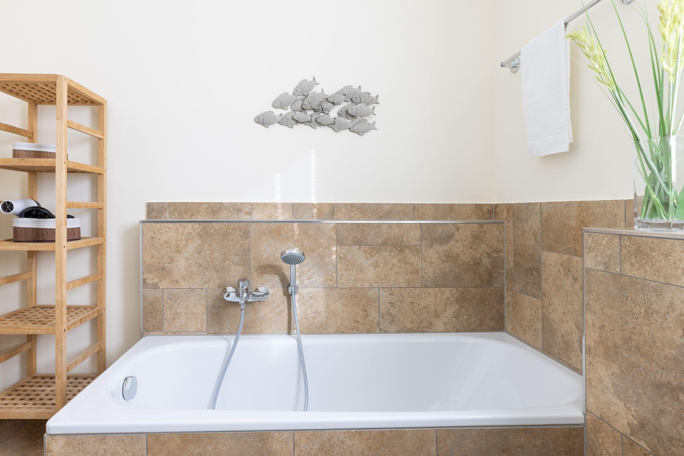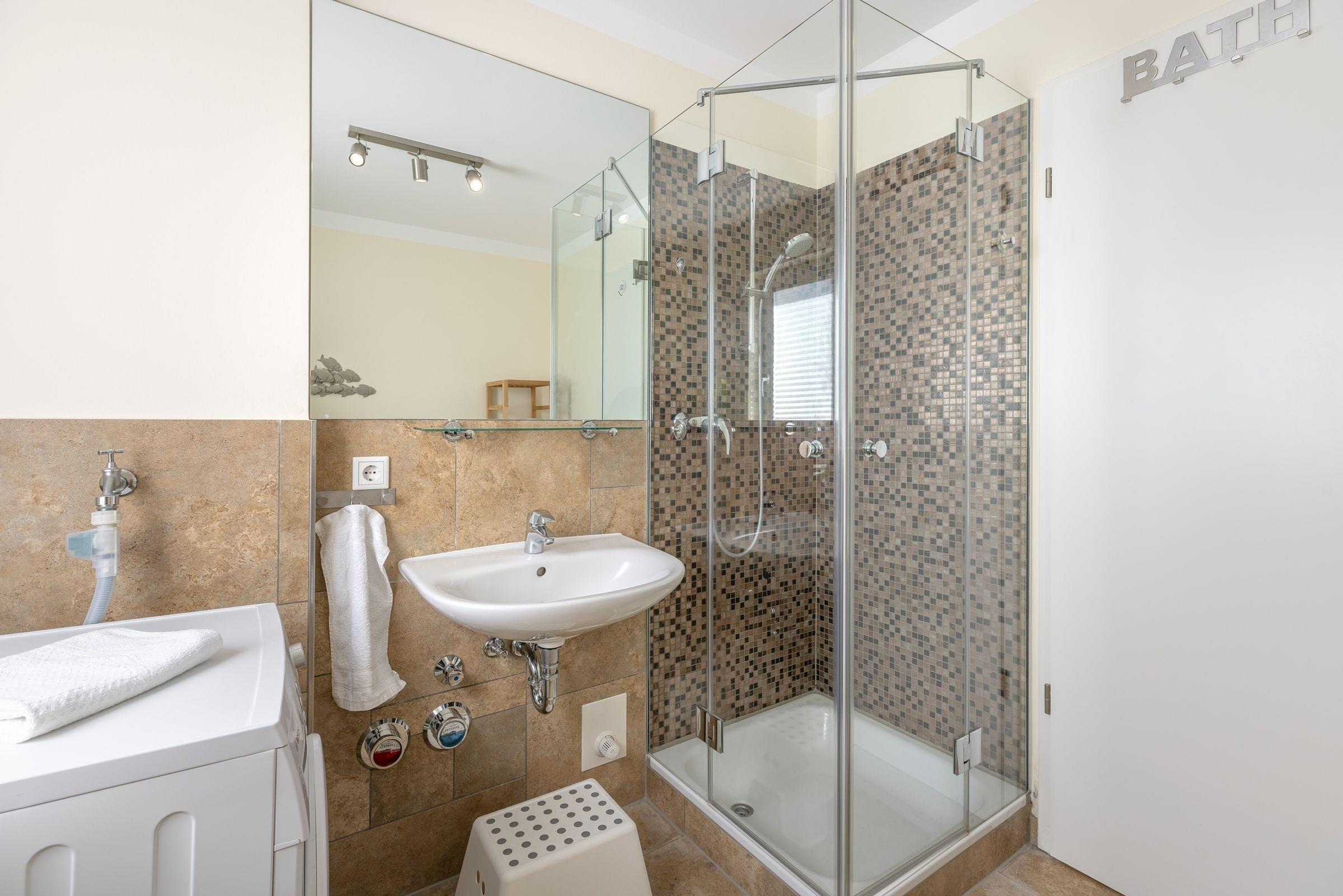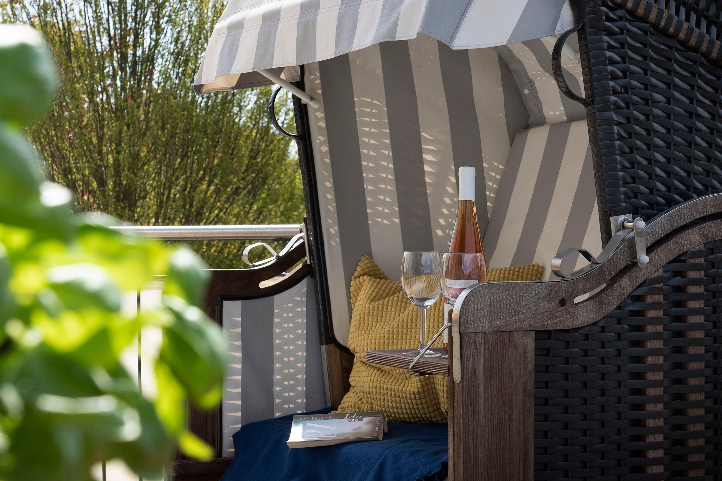 Es gibt zwei separate Schlafräume, von denen eines mit einem großen Doppelbett (2x 90x200 cm) und eines mit zwei Einzelbetten (je 90x200 cm) ausgestattet ist. Im großen Schlafzimmer befindet sich ein zusätzlicher TV. Beide Schlafräume sind mit geräumigen Kleiderschränken sowie Verdunkelungsplissees ausgestattet. Das moderne Bad verfügt neben der Dusche auch über eine Badewanne, und sorgt so für völlige Entspannung auch an einem regnerischen Tag. Im Wohnraum befinden sich eine moderne und gemütliche Couchgarnitur, ein DVD-Player und ein LCD-TV. Die offene und im Wohnraum integrierte Küchenzeile ist ausgestattet mit Kühlschrank inkl. Gefrierfach, 4-Plattenceranherd, Backofen, Geschirrspüler, Kaffeemaschine, Wasserkocher und Toaster direkt daneben steht der große Esstisch, ausgelegt für 4 Personen. Vom Wohnzimmer gelangen Sie auf den äußerst großzügigen Balkon, der eine schöne Ausrichtung in Richtung Sonne bietet und über Gartenmöbel und einen tollen Strandkorb verfügt.