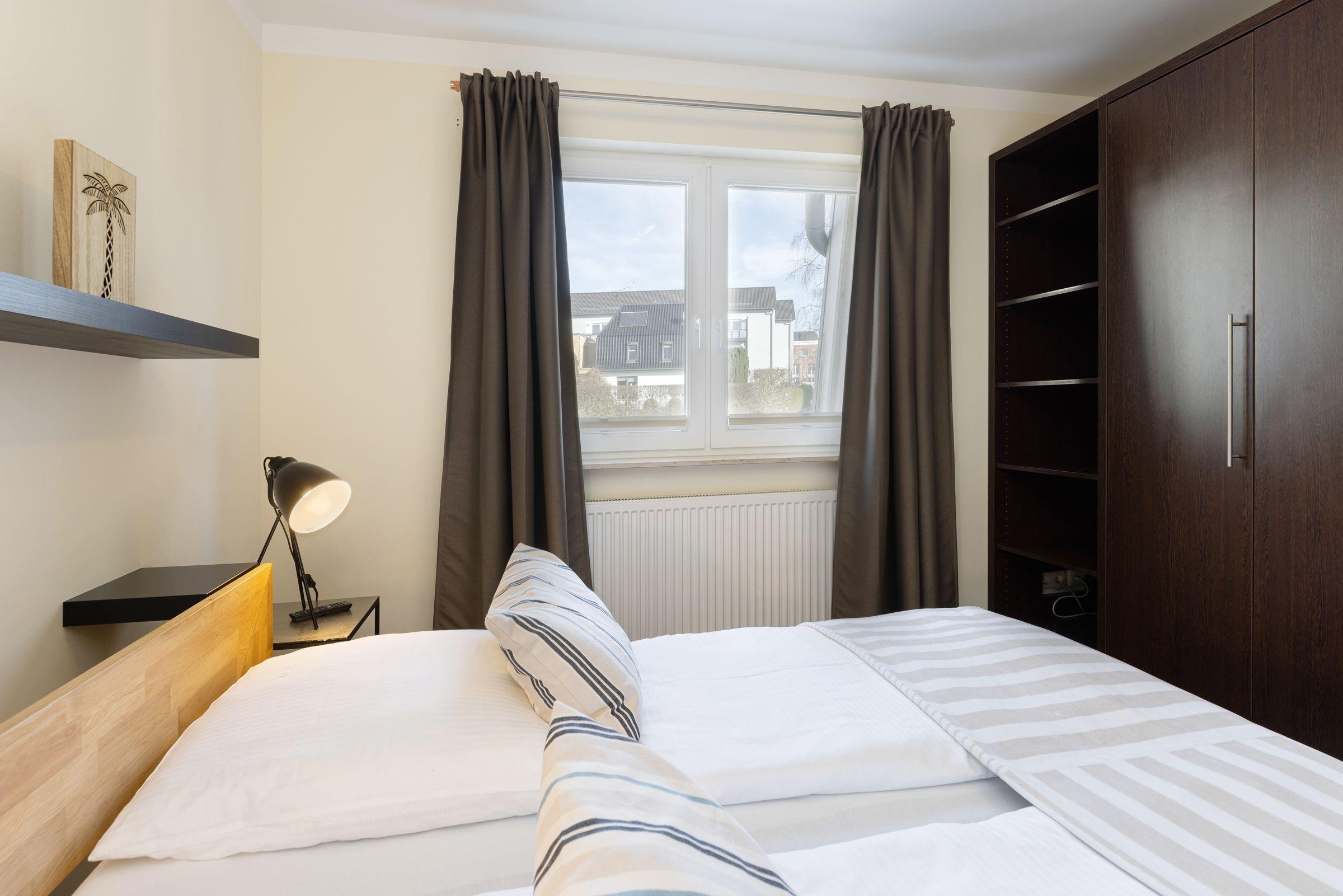 Schlafzimmer 1: 1 Doppelbett (2x 90x200 cm), Kleiderschrank, TV, Verdunkelung (Plissees).