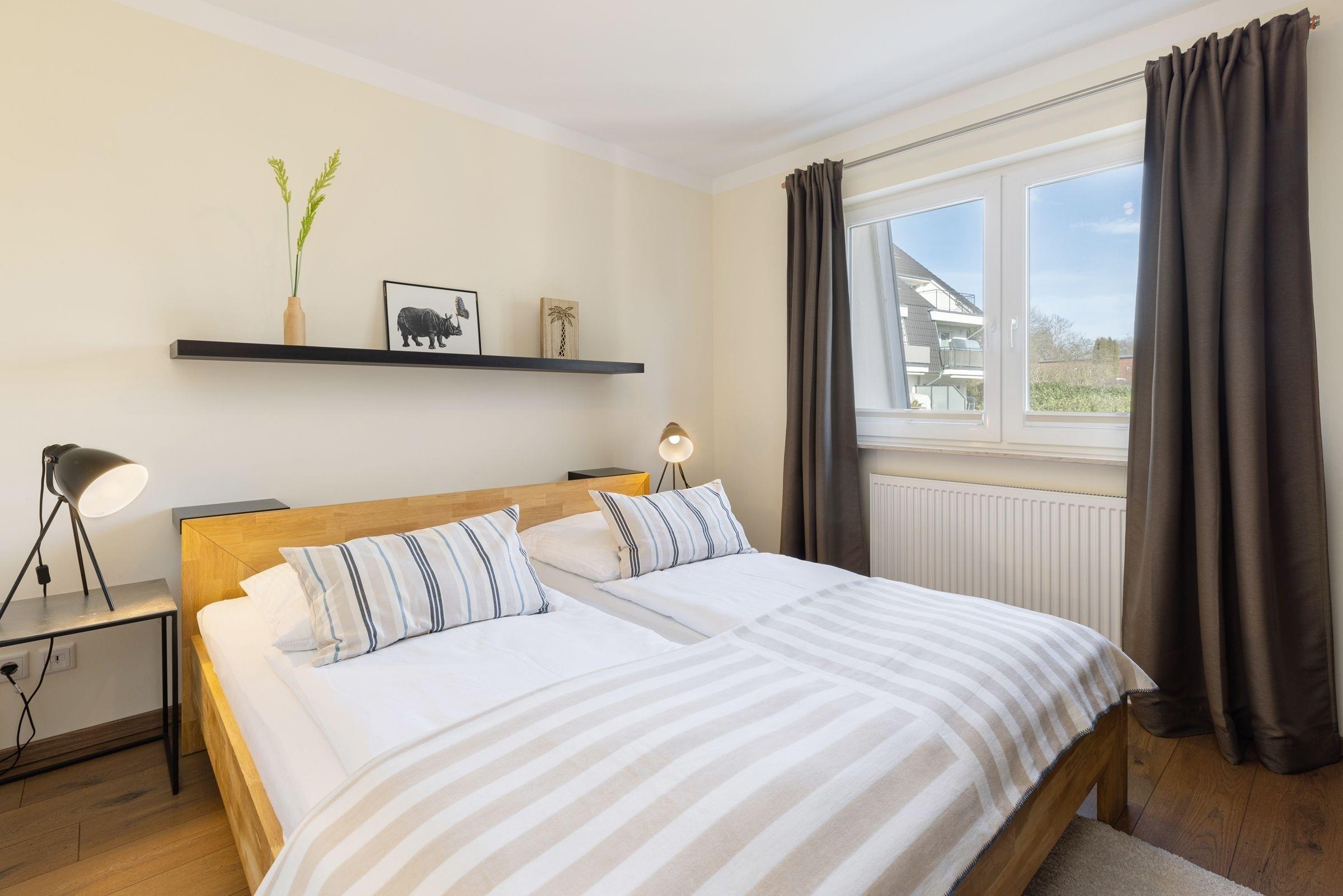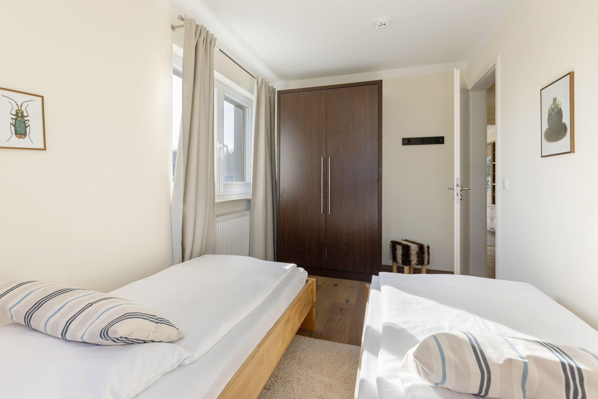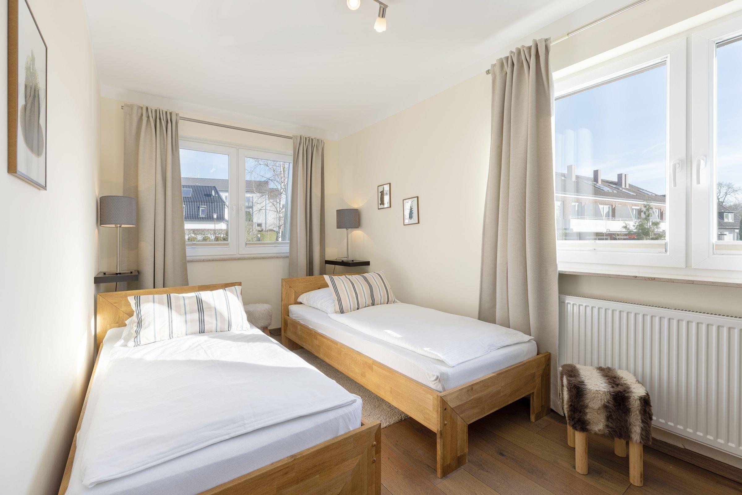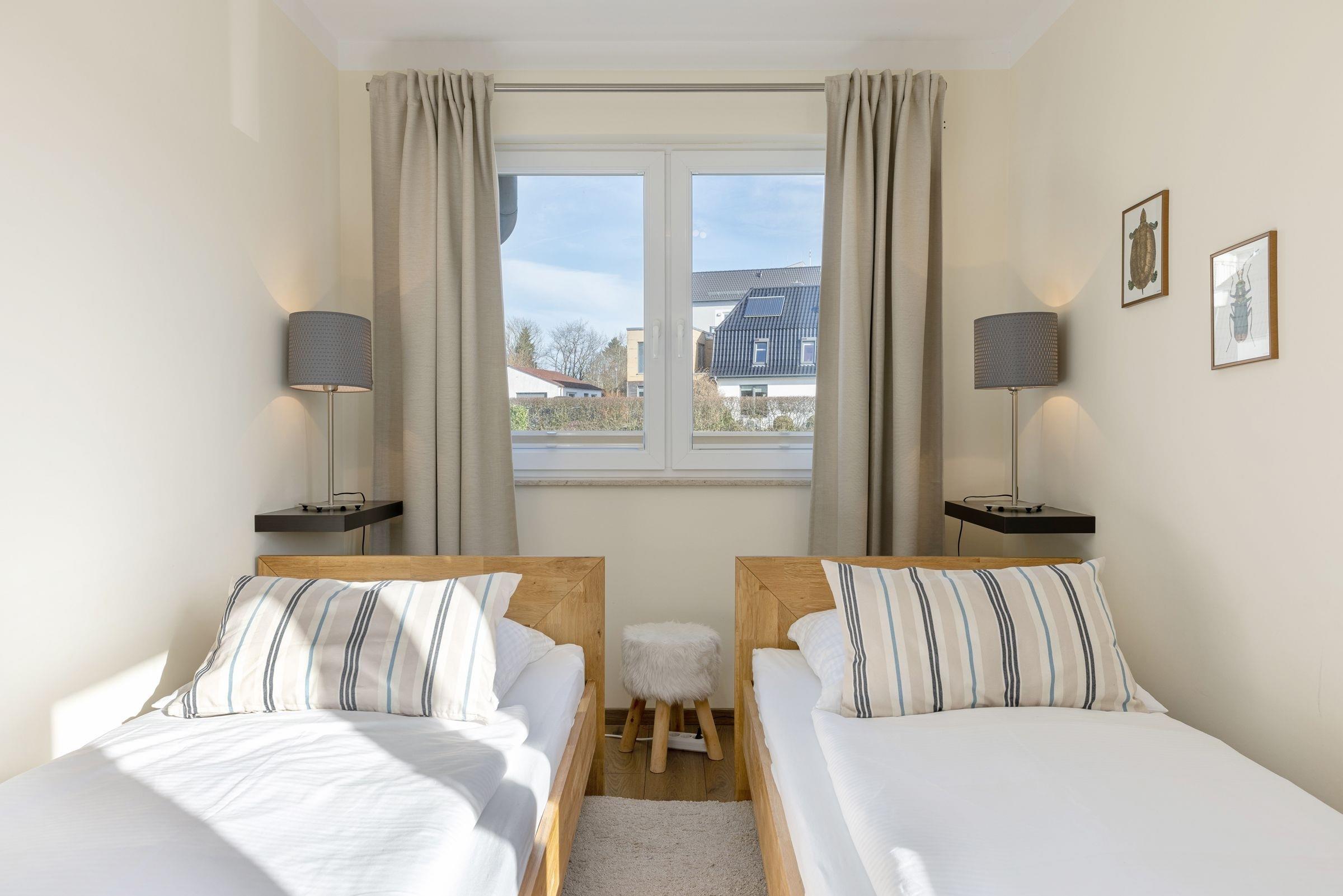 Schlafzimmer 2: 2 Einzelbetten (2x 90x200 cm), Kleiderschrank, Verdunkelung (Plissees).