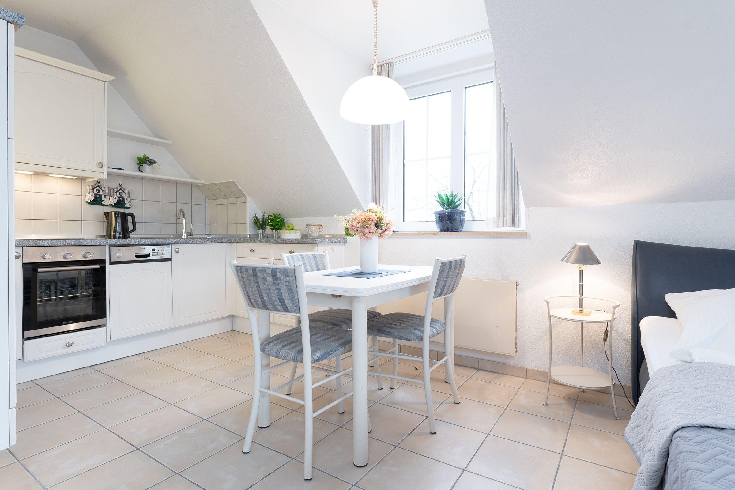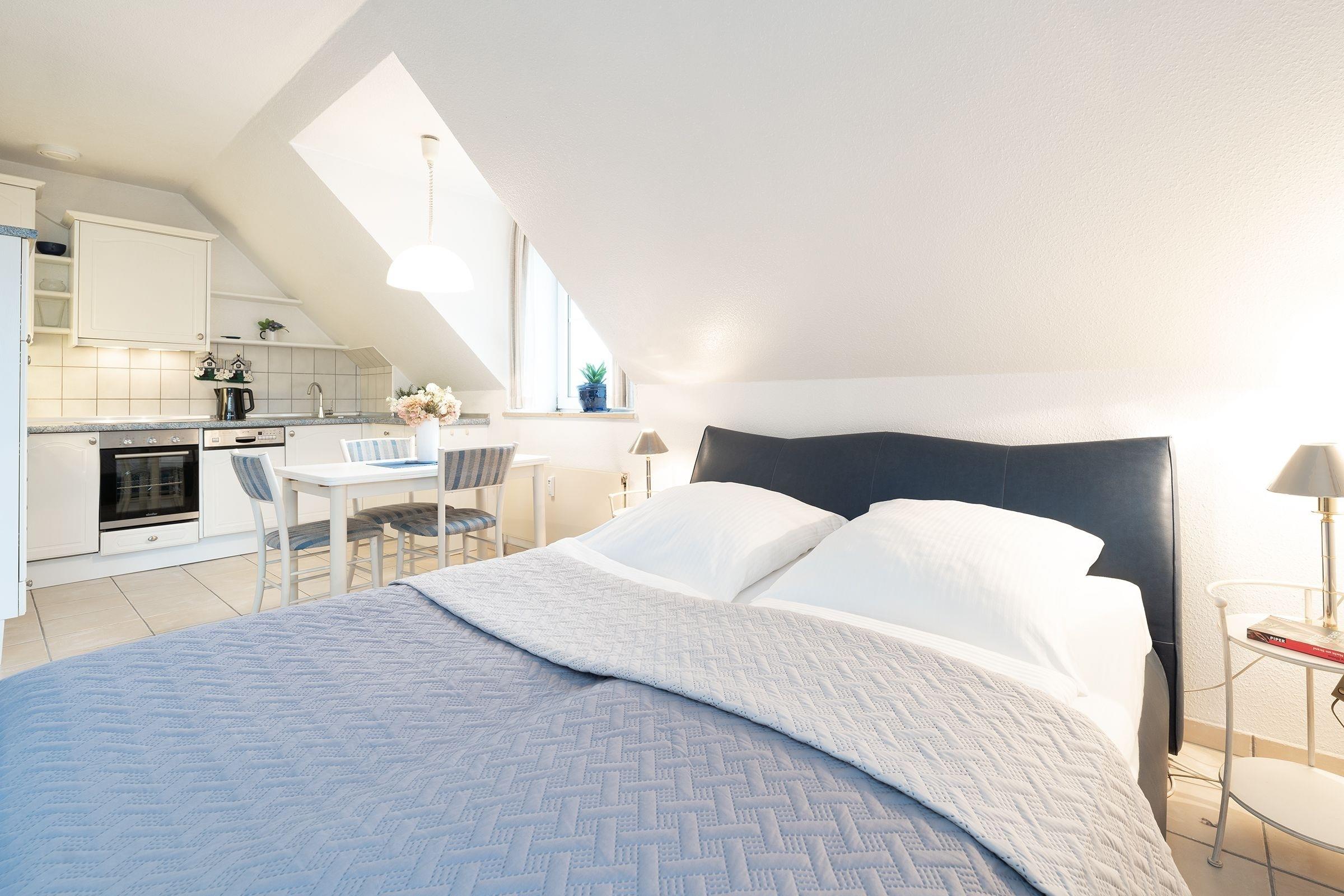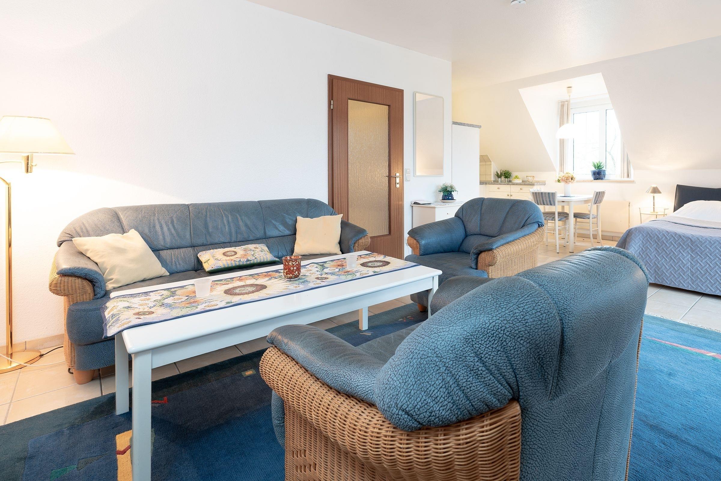 Dieses komfortable 1-Zimmer-Appartement hat ca. 38 m² und bietet Platz für bis zu 2 Personen. Es ist modern und sehr geschmackvoll eingerichtet. Der kombinierte Wohn-/Schlafraum verfügt über ein separates Doppelbett (2x 80x200 cm) und eine Couchgarnitur mit zwei Sesseln. Darüber hinaus finden sie hier eine Musikanlage und ein LED-TV. Die Küchenzeile ist ausgestattet mit Kühlschrank mit Gefrierfach, 4-Plattenceranherd, Backofen, Geschirrspüler, Kaffeemaschine, Wasserkocher und Toaster. Der Wohnraum verfügt über einen Esstisch. Der Balkon bietet eine schöne Ausrichtung in Richtung Sonne und verfügt über Gartenmöbel.