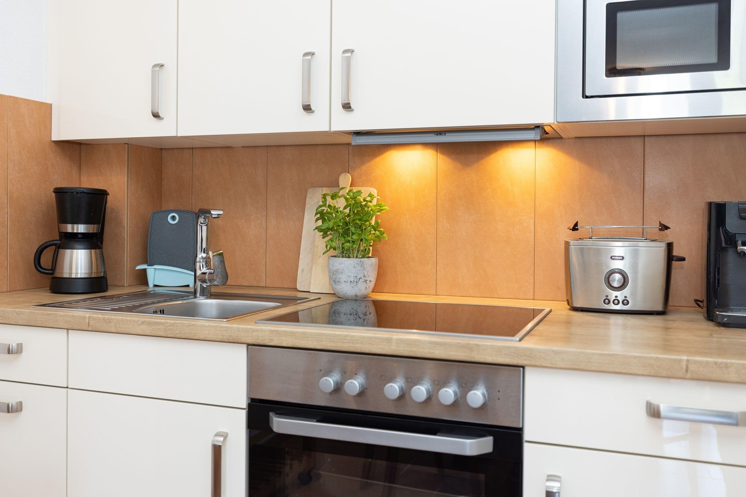 Im Wohnraum befinden sich eine Couchgarnitur mit zwei Sesseln, welche zu einem Doppelbett (140x190 cm) ausgezogen werden kann, eine Musikanlage und ein LCD- TV. Loggen Sie sich bequem in das kostenlose WLAN-Netzwerk ein und bleiben Sie auch im Urlaub erreichbar. Die Küchenzeile ist ausgestattet mit Kühlschrank mit Gefrierfach, 4-Plattenherd,Geschirrspüler,Backofen, Kaffeemaschine, Wasserkocher und Toaster. Der Wohnraum verfügt über einen Esstisch. Der Balkon bietet eine schöne Ausrichtung in Richtung Sonne und verfügt über Gartenmöbel.
