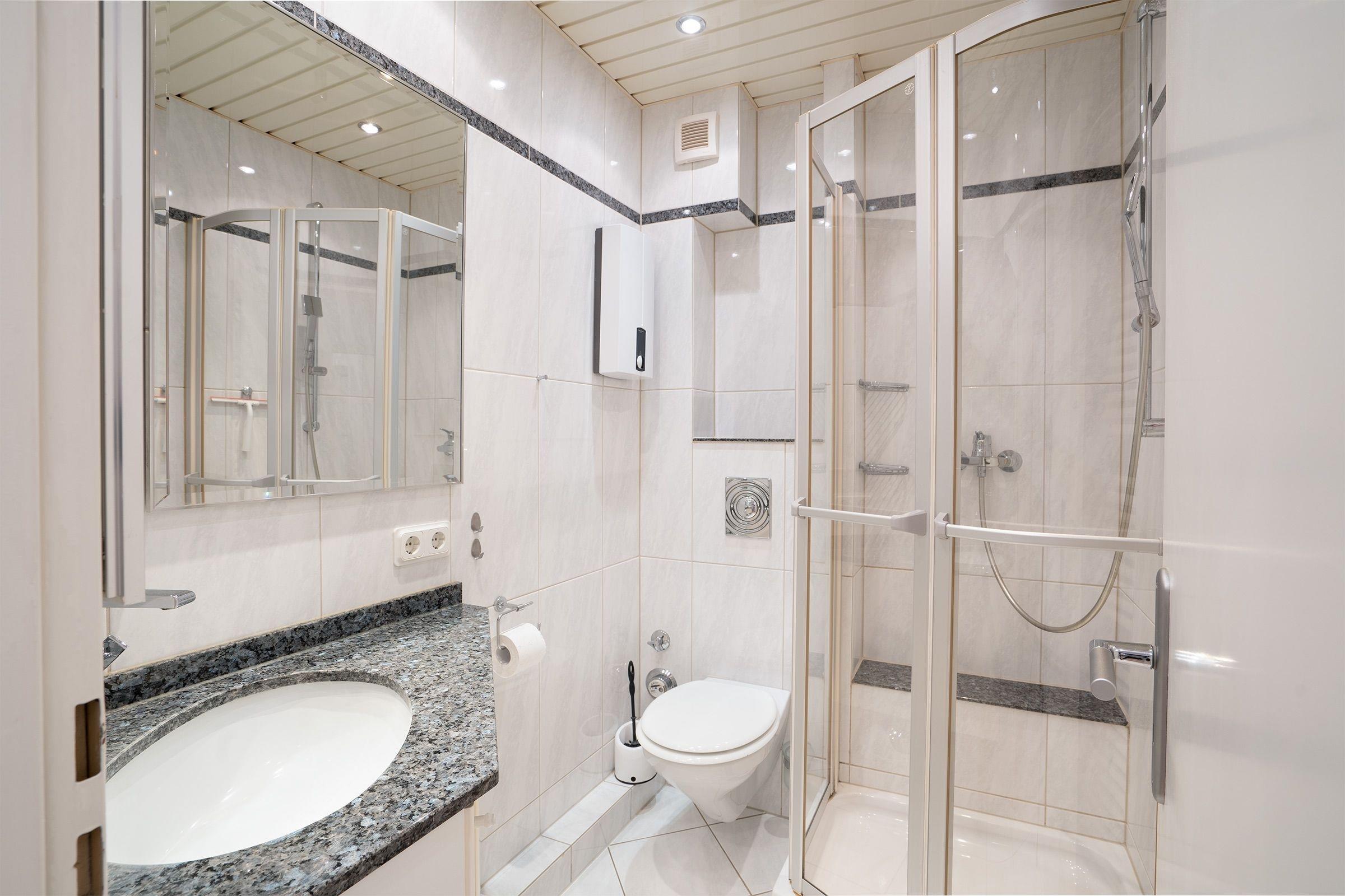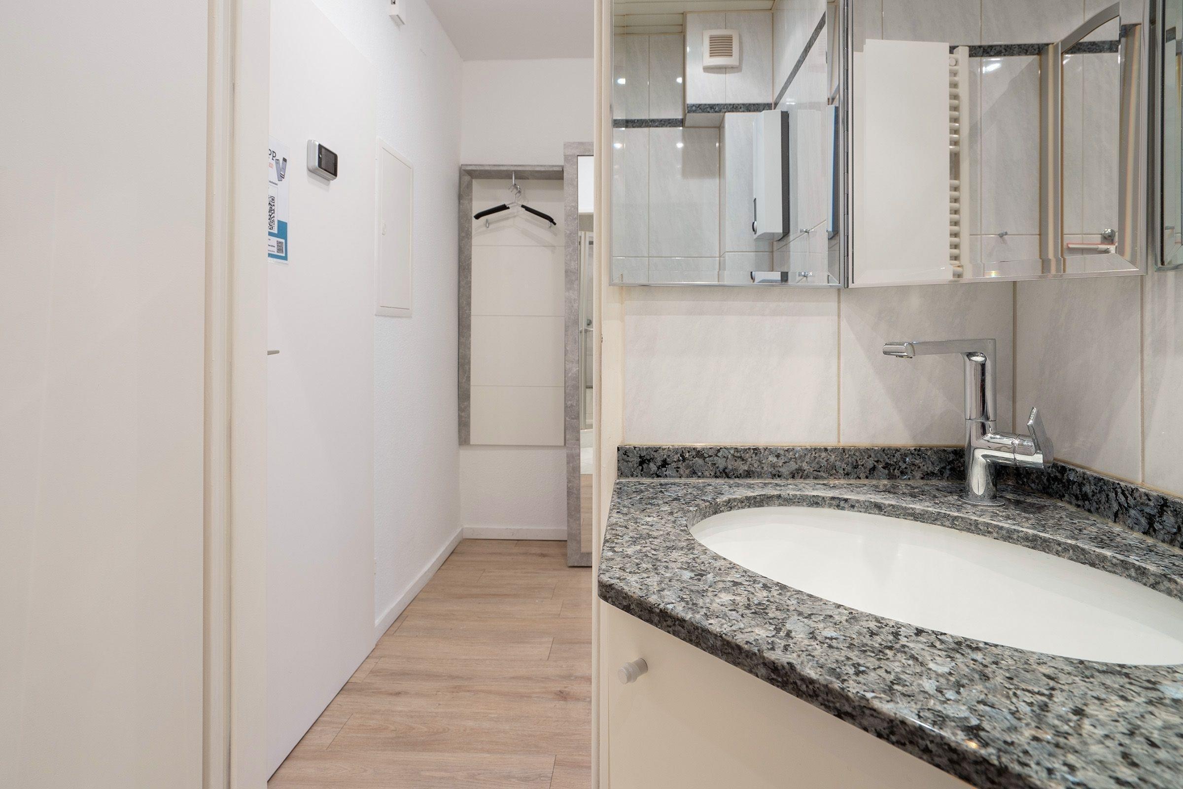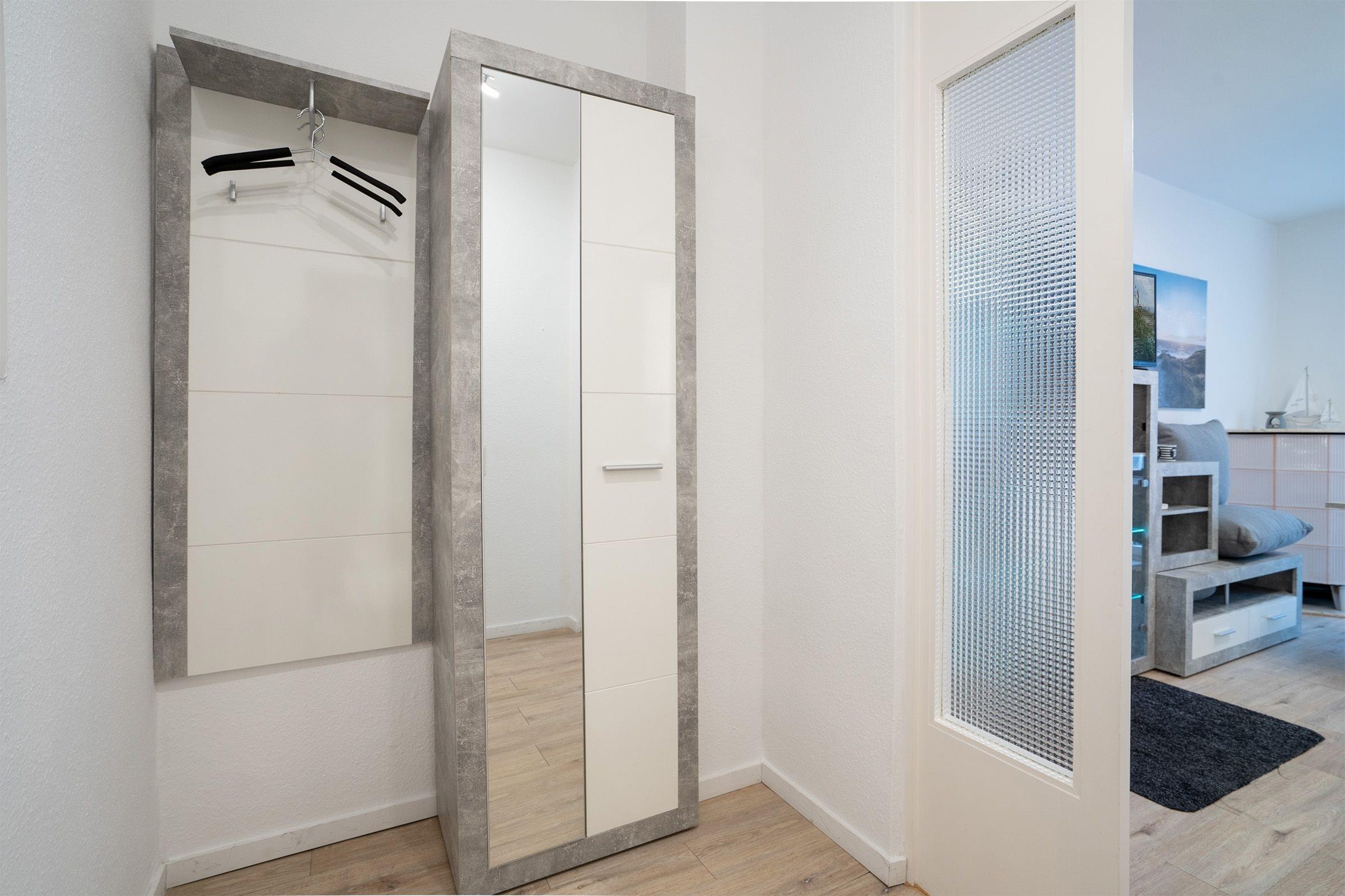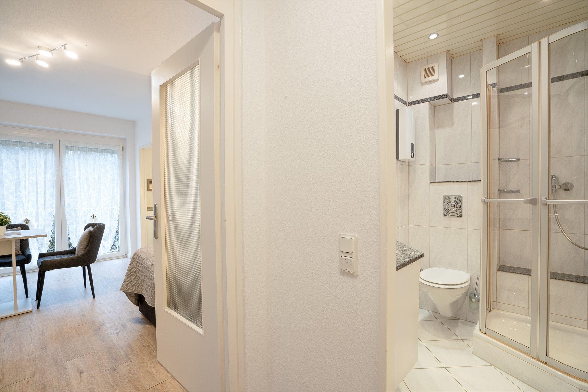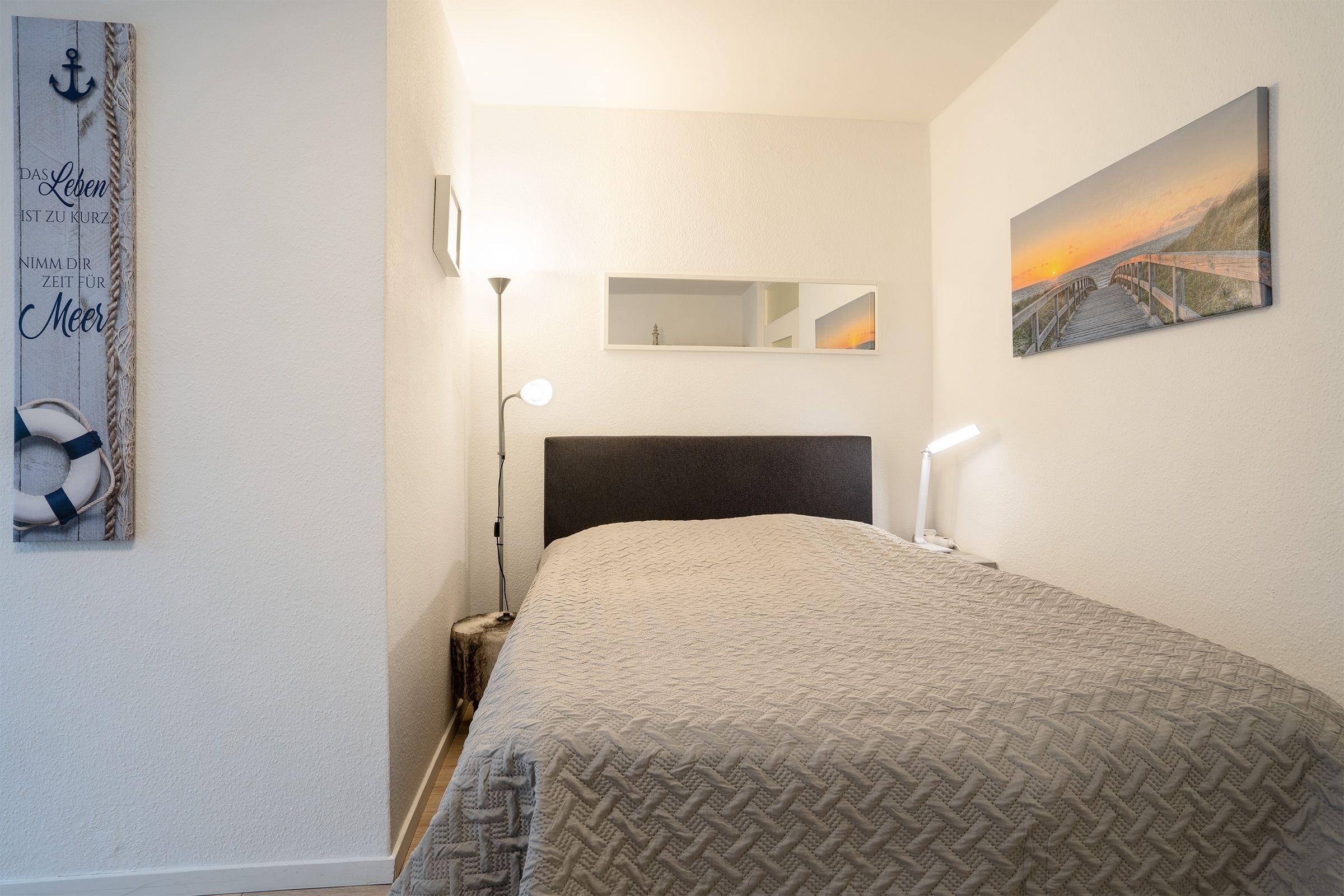 Es trennen sie nur 9 Stufen von Ihrer schnuckeligen Ferienwohnung. Über einen kleinen Flur betreten Sie die Wohnung. Rechter Hand gelangen Sie ins kleine, renovierte Bad mit Dusche, Waschbecken, Föhn, WC und großem Spiegelelement. Geradeaus geht es weiter in den Wohnschlafraum. Dort steht Ihnen für gemeinsame Fernsehabende ein Flat-TV zur Benutzung zur Verfügung. Erholsamen Schlaf finden Sie in einem Boxspringbett mit den Maßen (140x200 cm). Eine elektrische Außenjalousie schirmt Sie vor den ersten Sonnenstrahlen ab. Genießen Sie das Frühstück bei geöffneter Balkontür und starten Sie entspannt in den Tag. Die kleine Pantryküche ist komplett ausgestattet mit Kühlschrank mit Gefrierfach, Herd, Backofen, Kaffeemaschine, Kaffeepadmaschine, Wasserkocher und Toaster.