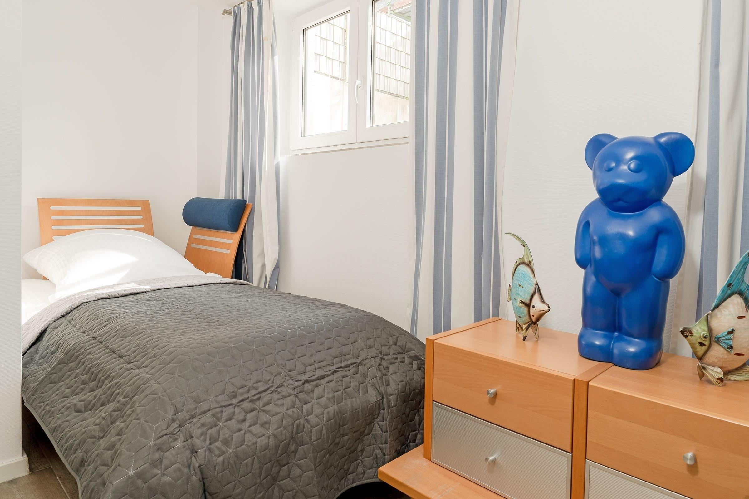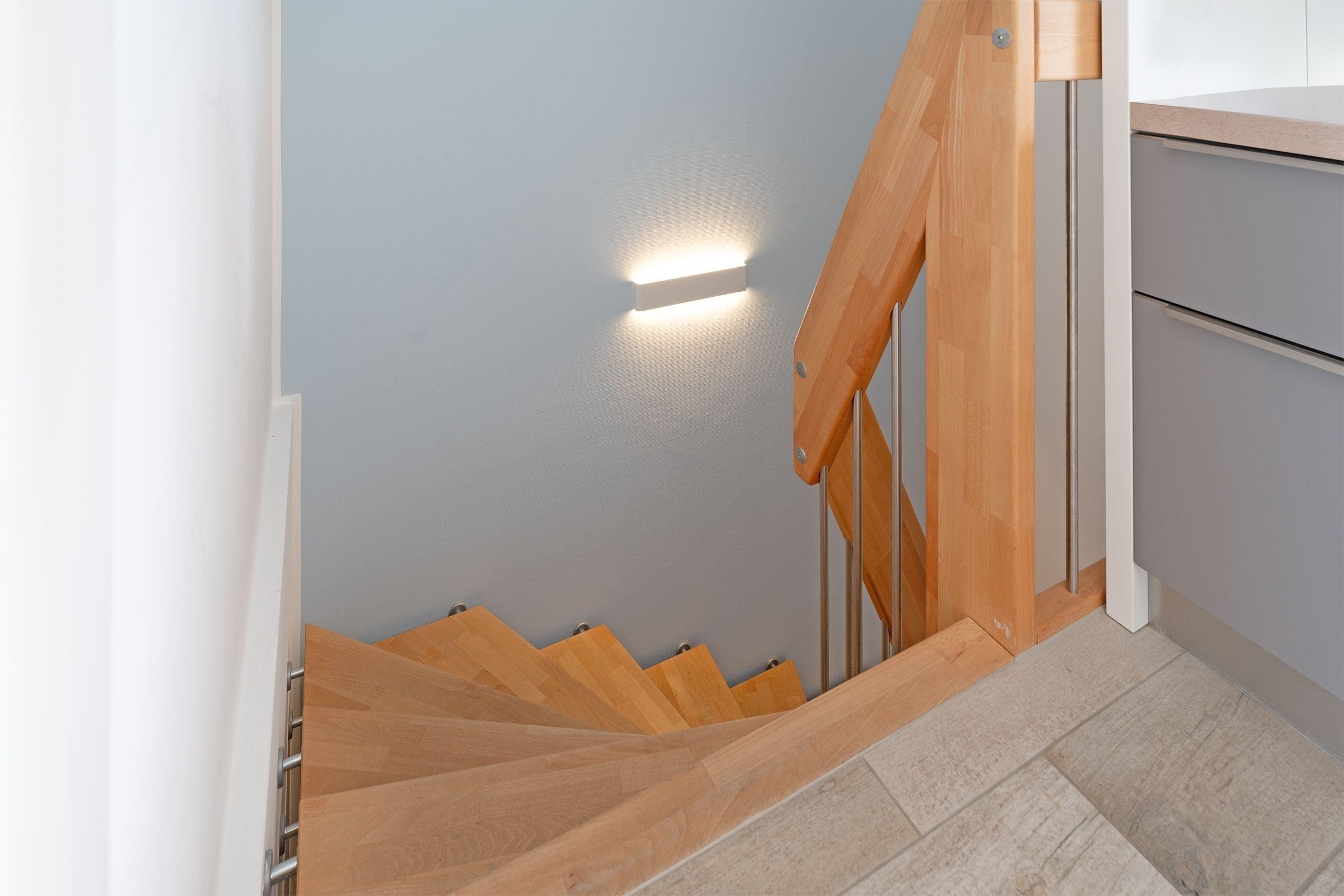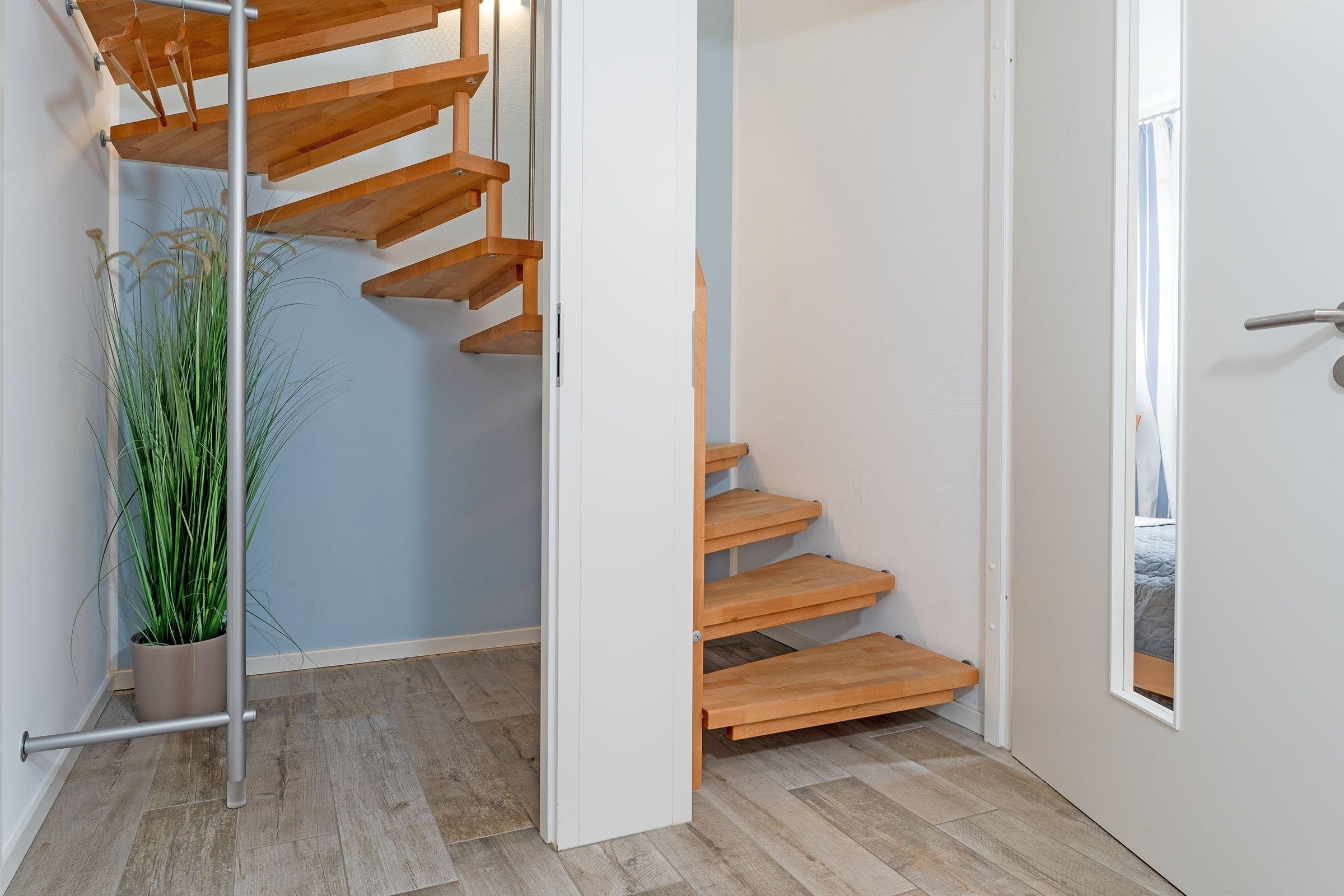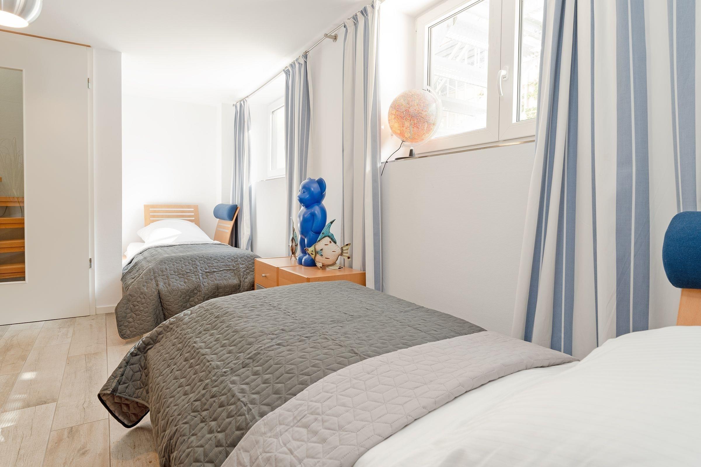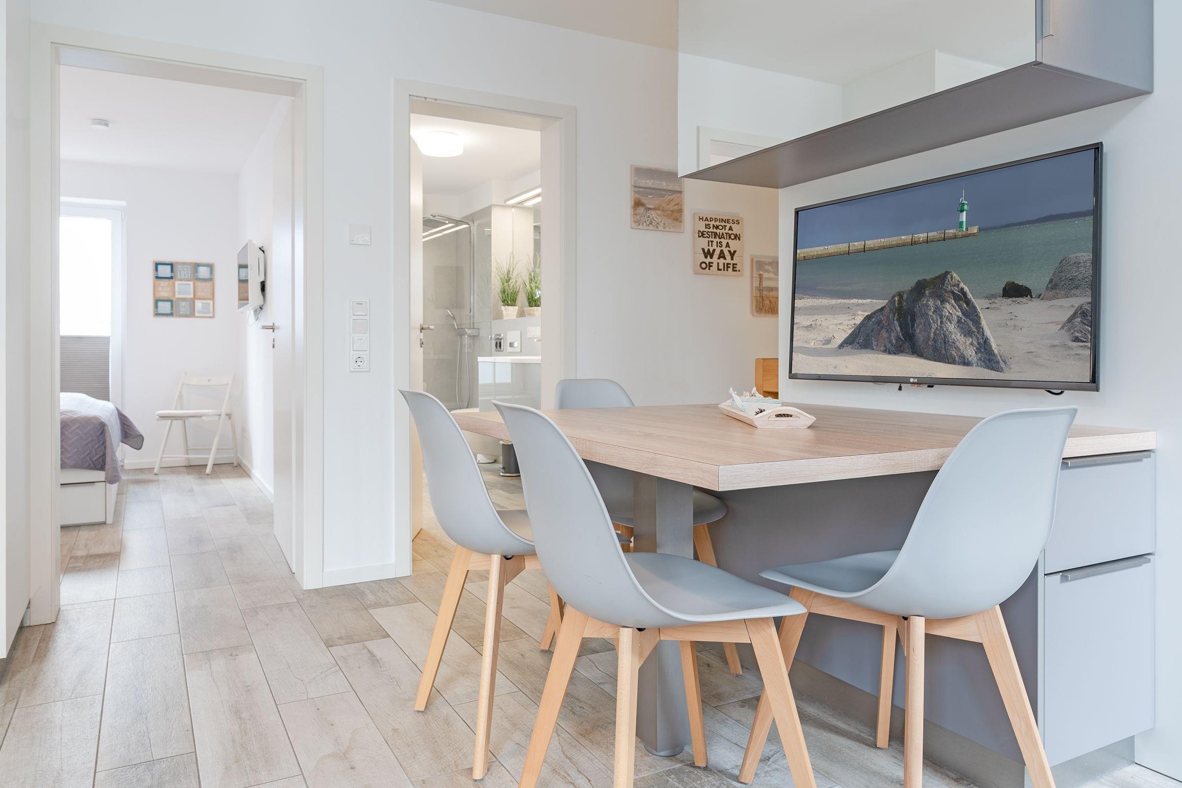 In der Wohnung finden Sie einen großzügigen Wohnraum mit einer Sofaecke, Esstisch und einer Küchenzeile. Der Essbereich und die helle, toll ausgestattete Küche geben Ihnen alle Möglichkeiten, sich im Urlaub kulinarisch zu verwöhnen. Vom Wohnbereich aus erreichen Sie die möblierte Terrasse. Laue Sommerabende werden hier zu einem perfekten Urlaubserlebnis bei einem leckeren Glas Wein und einem selbst gekochten Abendessen. Starten Sie in Ihrem Wohlfühlbad perfekt in den Tag. Dafür sorgt ein tageslichthelles Duschbad mit WC und Föhn. In Ihrem benachbarten Schlafraum mit einem Doppelbett (2x 90x200 cm) lässt es sich traumhaft nächtigen und der große Schrank hat viel Platz für Ihre Urlaubsgarderobe. Auch hier wurde an einen weiteren Flat-Screen-TV gedacht. Ihre Wohlfühltemperatur können Sie über das Einstellen der Fußbodenheizung bestimmen. Verdunkelungsplissee schützen vor den ersten Sonnenstrahlen. Im Untergeschoss erwartet Sie ein Raum mit zwei Einzelbetten und Kommode. Das untere Schlafzimmer ist über eine Treppenanlage mit dem Wohnzimmer verbunden.