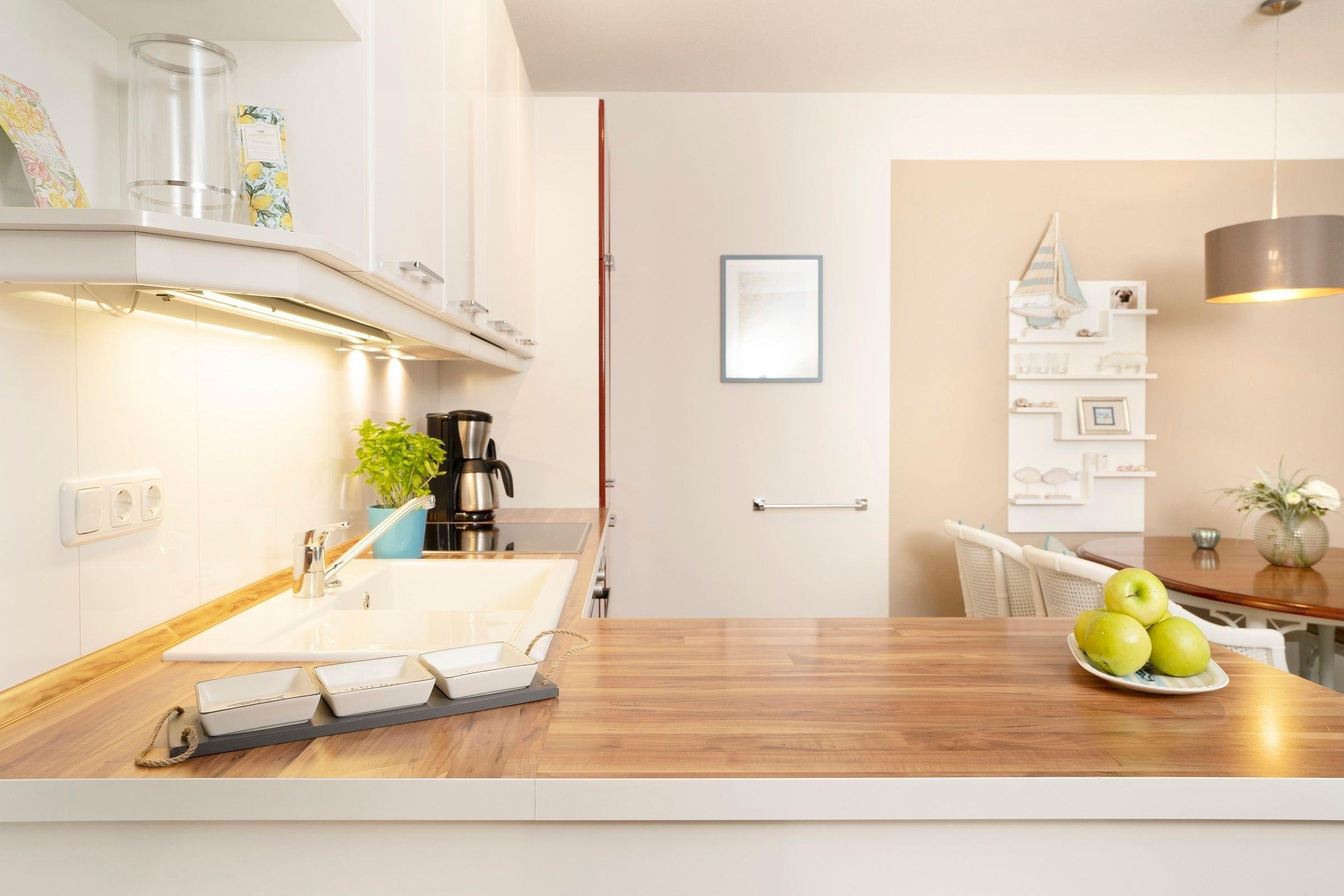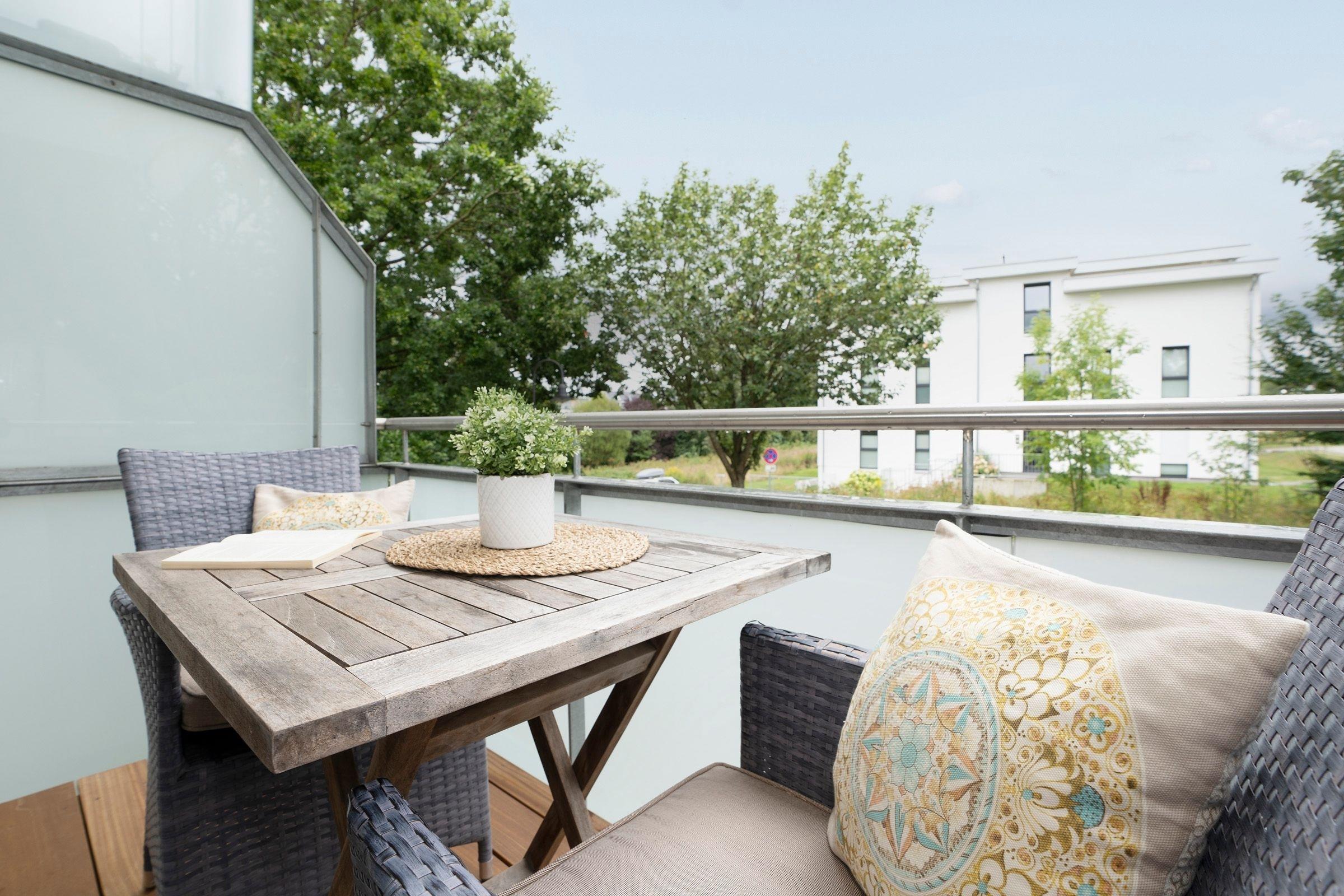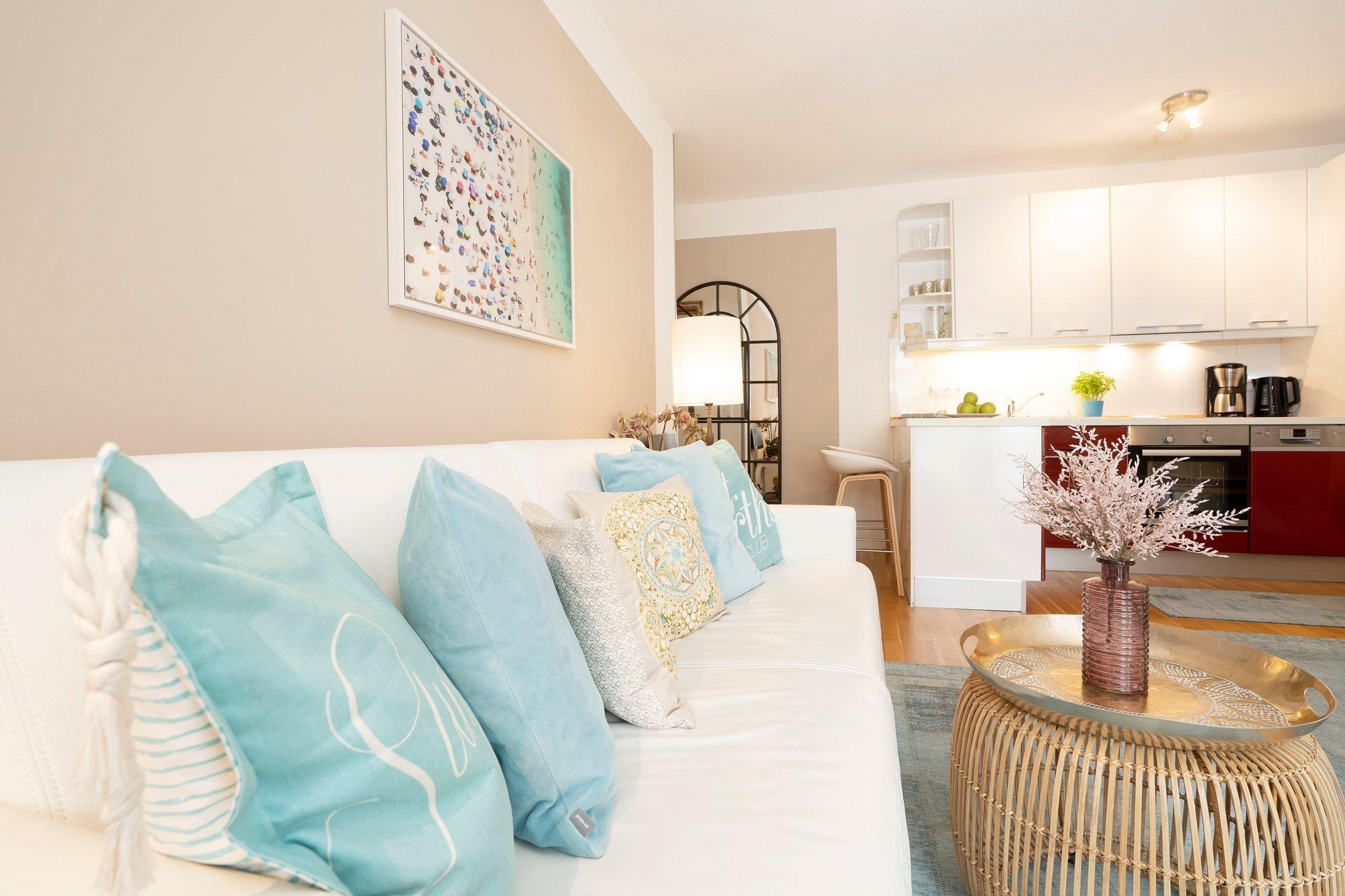 Die Wohnung verfügt über einen sehr schönen und hellen Wohn-Essbereich mit gemütlichem Sofa, das schnell zu einem Schlafsofa umfunktioniert werden kann. Flachbildfernseher (inkl. Netflix), Stereoanlage sowie kostenloses WLAN sind selbstverständlich. Vom Wohnzimmer aus gelangen Sie direkt auf den möblierten und herrlichen Süd-Balkon mit Markise. Die moderne und sehr hochwertige Küche ist mit vielen Komfort ausgestattet. Das Schlafzimmer verfügt über ein Boxspringbett (180x200 cm), einen geräumigen Kleiderschrank, einen Schreibtisch, einen Flachbildfernseher sowie den direkte Zugang zur Süd-Terrasse mit Sonnenliege. Zur Verdunkelung sind elektrische Rollläden angebracht. Das moderne Duschbad hat neben der Fußbodenheizung einen zusätzlichen Handtuchheizkörper. Hier finden Sie auch die zur Ferienwohnung gehörende Waschmaschine.