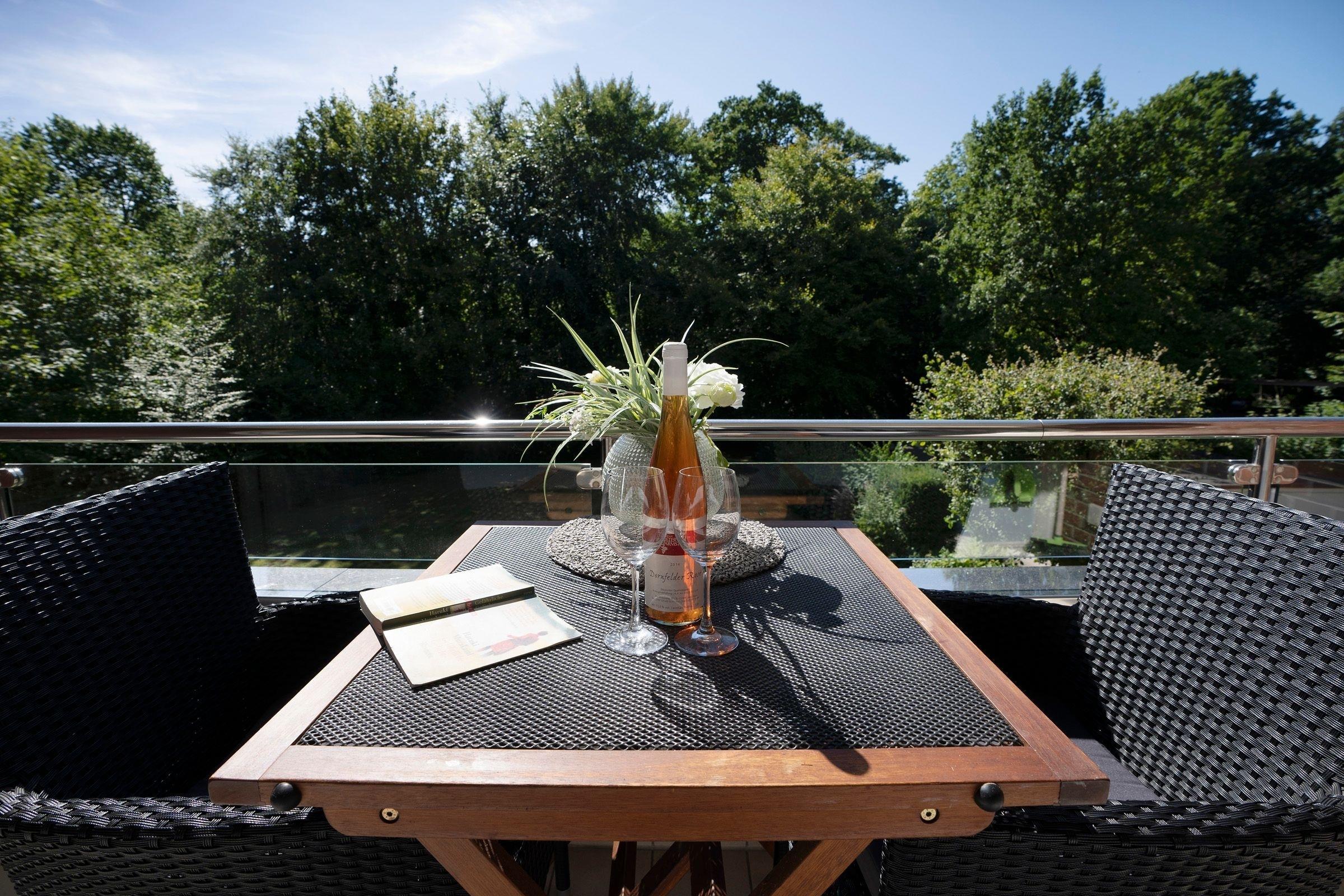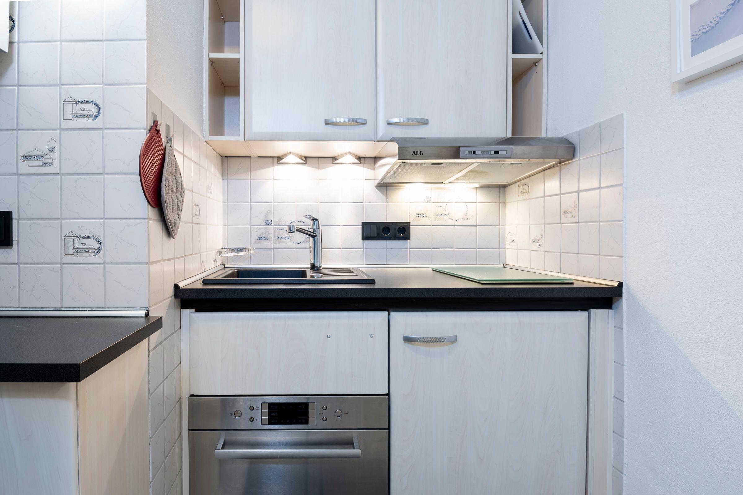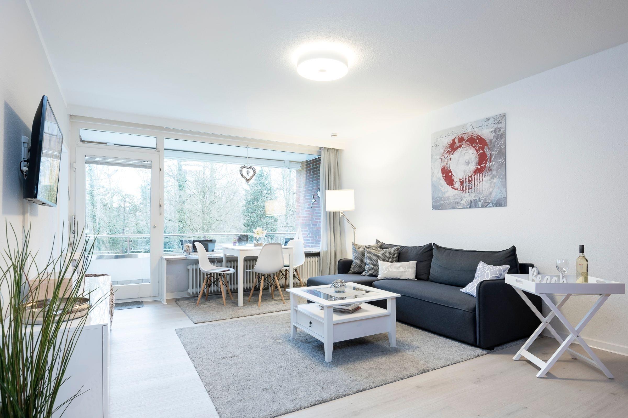 Bequem parken Sie Ihren PKW hinter dem Appartementhaus, jetzt sind es nur noch ein paar Schritte bis zu Ihrem Urlaubsdomizil. Mit dem Fahrstuhl oder über das Treppenhaus gelangen Sie in der Ferienwohnung. Sie öffnen die Wohnungstür und sind gleich in Ihrer modernen Küche. Die separate gut ausgestattete Küche lässt Sie problemlos kleinere Gerichte zuzubereiten. Hier sorgen Alltagshelfer wie Mikrowelle und Spülmaschine für gute Laune, zudem gibt es zusätzlich zur regulären Kaffeemaschine eine Kaffee-Kapselmaschine für frische Kaffeevariationen zum Frühstück. Das Duschbad liegt rechts neben dem Flur. Der Wohn- und Schlafbereich ist mit einem Schrankbett (für 1 Person), Sessel, Sofa und einen Essbereich eingerichtet. Von hier aus haben Sie einen Blick ins Grüne, können Ihr Frühstück auf dem Balkon genießen oder es sich an lauschigen Sommerabenden mit einem Buch gemütlich machen. In Ihrem Schlafzimmer erwartet Sie ein Doppelbett (160x200 cm), dort können Sie ungestört träumen. Verdunklungsplissees dunkeln das Schlafzimmer ausreichend ab.