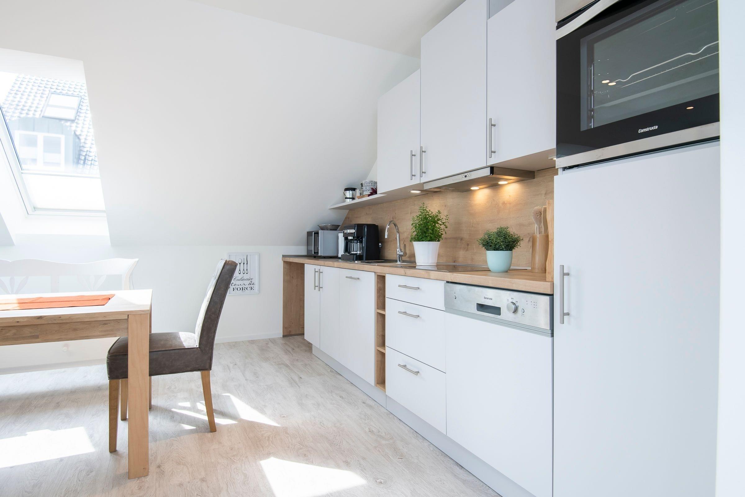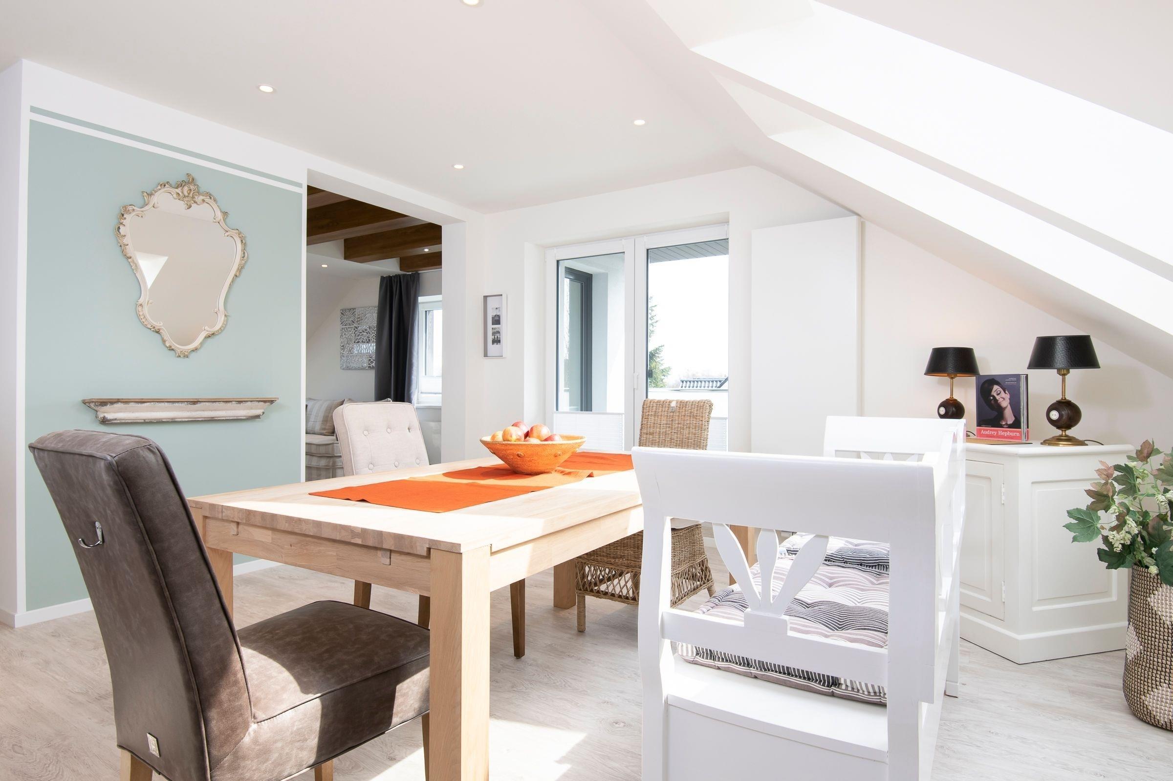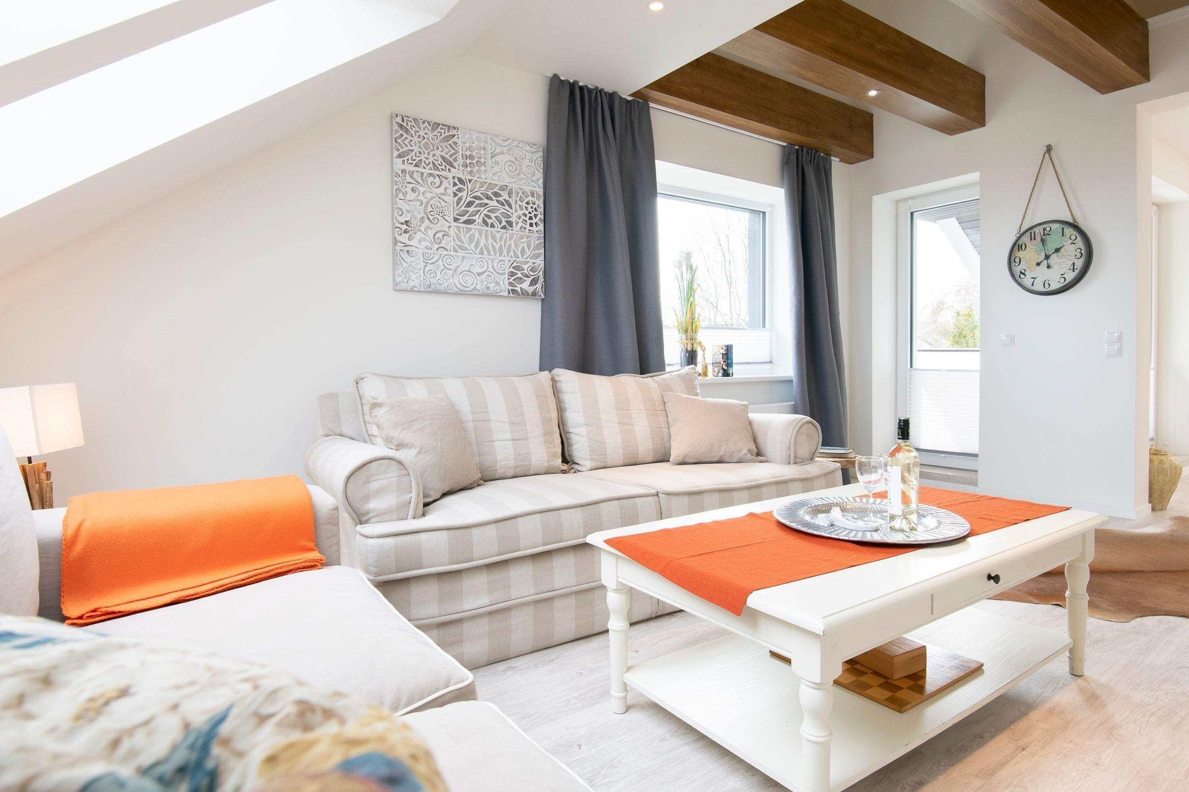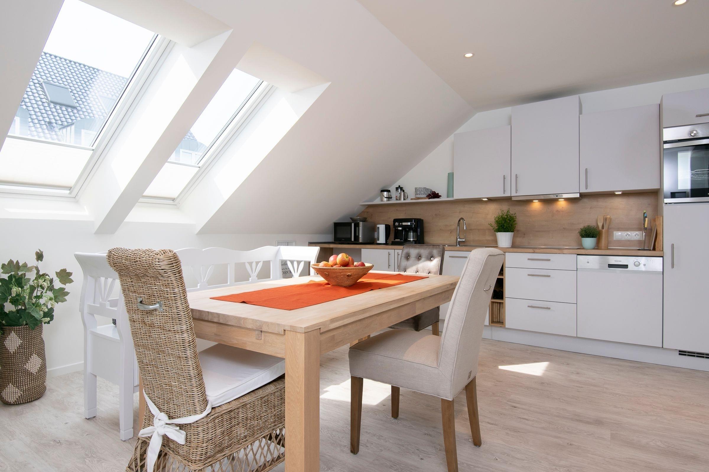 Gemütlich unter Dachschrägen begrüßt Sie das kuschelige Wohnzimmer mit hochwertiger Ausziehcouch (110x180 cm). Im separaten Schlafzimmer genießen Sie erholsame Nächte im komfortablen Boxspringbett (180x200 cm), ein Kleiderschrank nimmt Ihre Urlaubsgarderobe auf. Hell und großzügig schließt sich das stilvolle Designbad mit Annehmlichkeiten wie bodentiefer Wellnessdusche, Schminkspiegel und Fußbodenheizung dem überzeugenden Ambiente der Wohnung an. Die offene Küche ist toll ausgestattet, sodass Ihrem selbst kreierten Urlaubsdinner nichts im Wege steht. Hier helfen Annehmlichkeiten wie Cerankochfeld, Spülmaschine und Backofen in praktischer Arbeitshöhe. Die hochwertige Kaffeemaschine von De'Longhi sorgt für den täglichen Kaffeegenuss. Der großzügige Essbereich ist ideal für gesellige Frühstücksrunden oder ein heiteres Dinner mit Freunden. Ein direkter Zugang führt zum überdachten, hochwertig möblierten Balkon. Genießen Sie hier eine wunderbare Ruhe, mit Aussicht ins Grüne und auch ein Hauch von Ostsee schimmert in der Ferne. Ideal zum Durchatmen, Erholung pur!