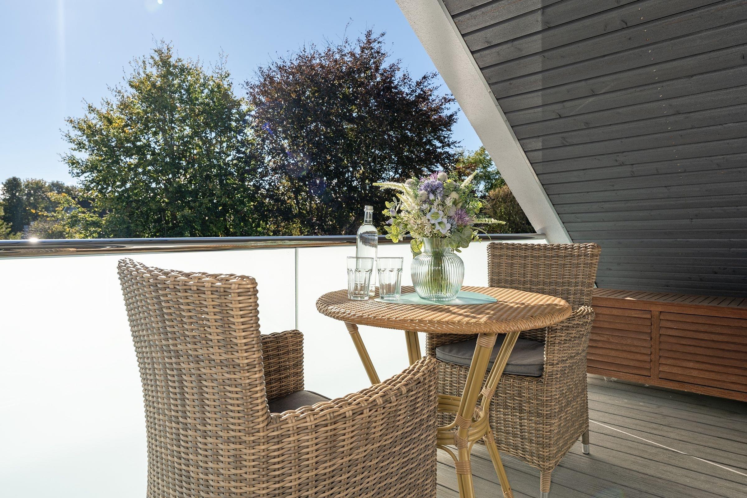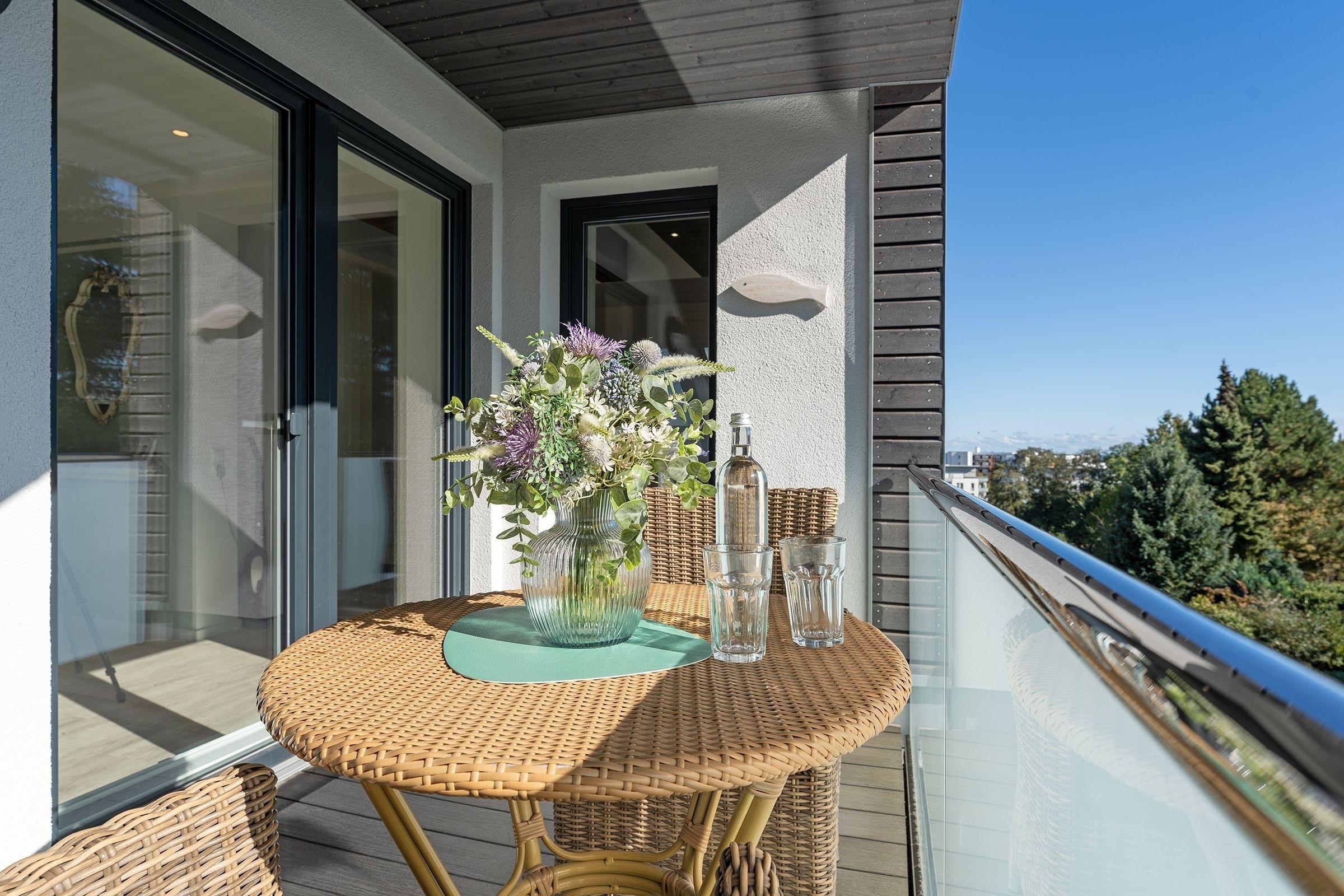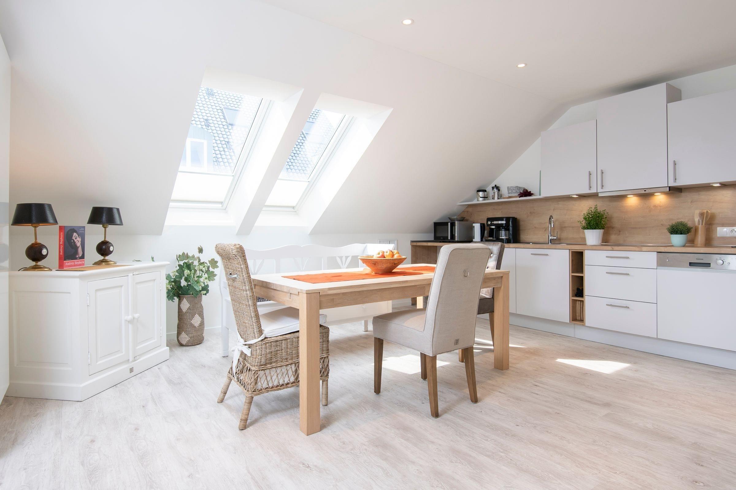 Gemütlich unter Dachschrägen begrüßt Sie das kuschelige Wohnzimmer mit hochwertiger Ausziehcouch (110x180 cm). Im separaten Schlafzimmer genießen Sie erholsame Nächte im komfortablen Boxspringbett (180x200 cm), ein Kleiderschrank nimmt Ihre Urlaubsgarderobe auf. Hell und großzügig schließt sich das stilvolle Designbad mit Annehmlichkeiten wie bodentiefer Wellnessdusche, Schminkspiegel und Fußbodenheizung dem überzeugenden Ambiente der Wohnung an. Die offene Küche ist toll ausgestattet, sodass Ihrem selbst kreierten Urlaubsdinner nichts im Wege steht. Hier helfen Annehmlichkeiten wie Cerankochfeld, Spülmaschine und Backofen in praktischer Arbeitshöhe. Die hochwertige Kaffeemaschine von De'Longhi sorgt für den täglichen Kaffeegenuss. Der großzügige Essbereich ist ideal für gesellige Frühstücksrunden oder ein heiteres Dinner mit Freunden. Ein direkter Zugang führt zum überdachten, hochwertig möblierten Balkon. Genießen Sie hier eine wunderbare Ruhe, mit Aussicht ins Grüne und auch ein Hauch von Ostsee schimmert in der Ferne. Ideal zum Durchatmen, Erholung pur!
