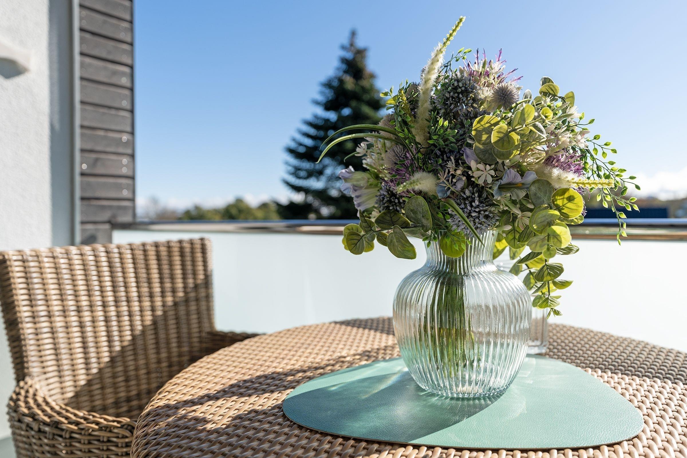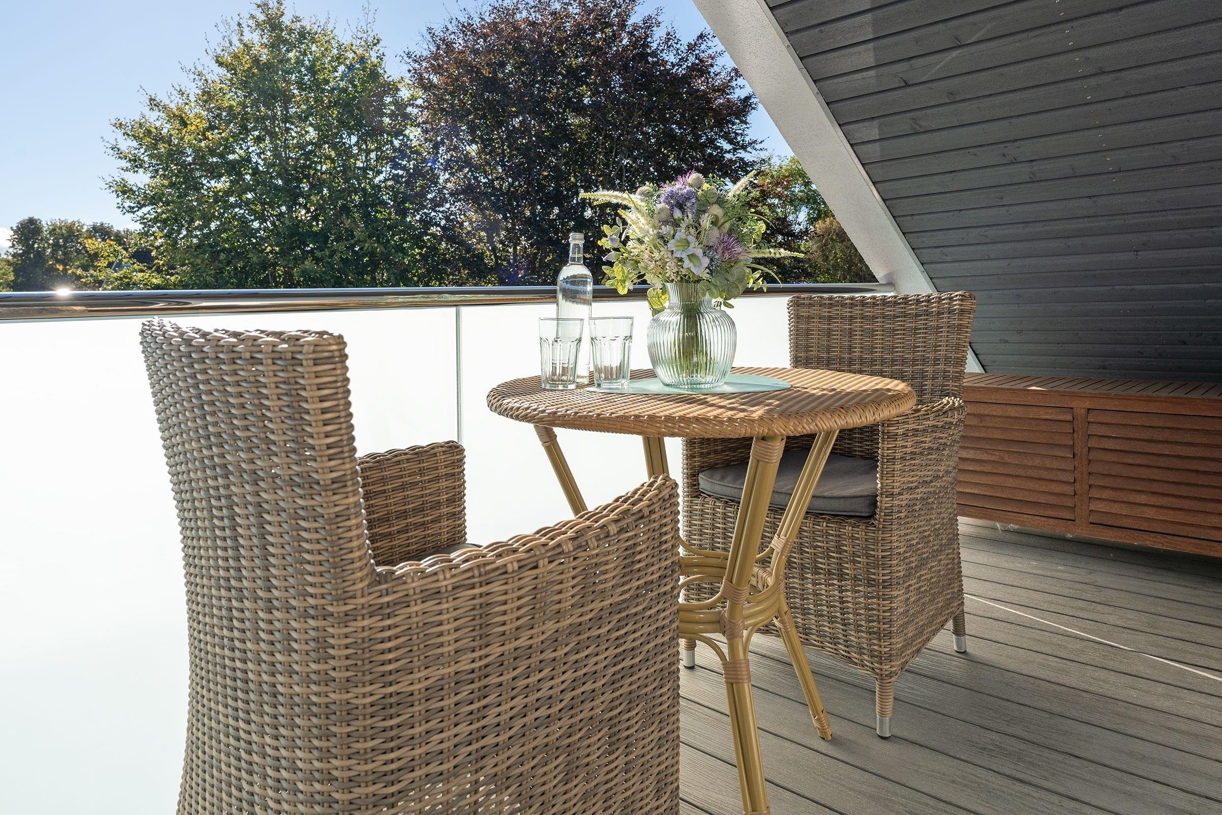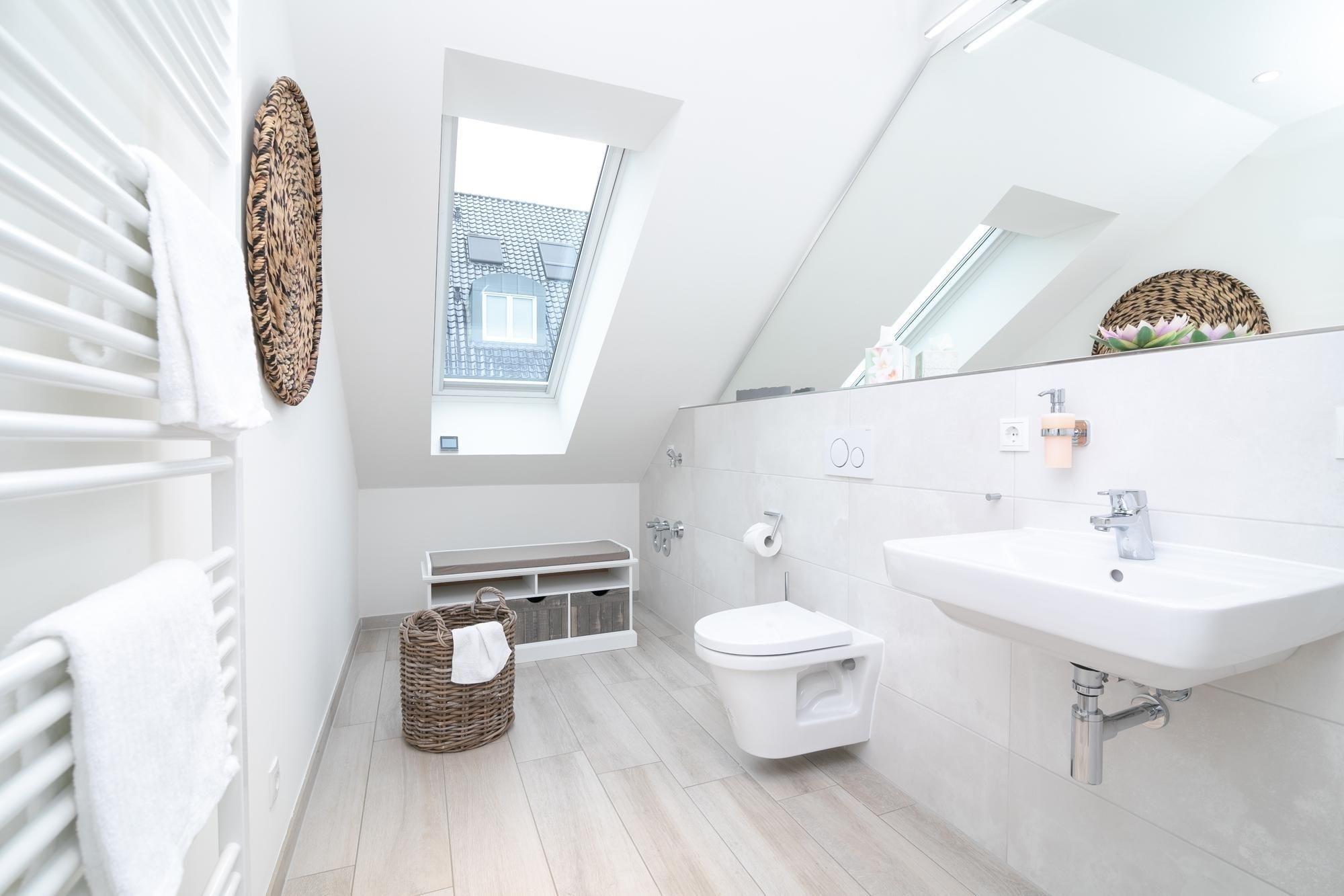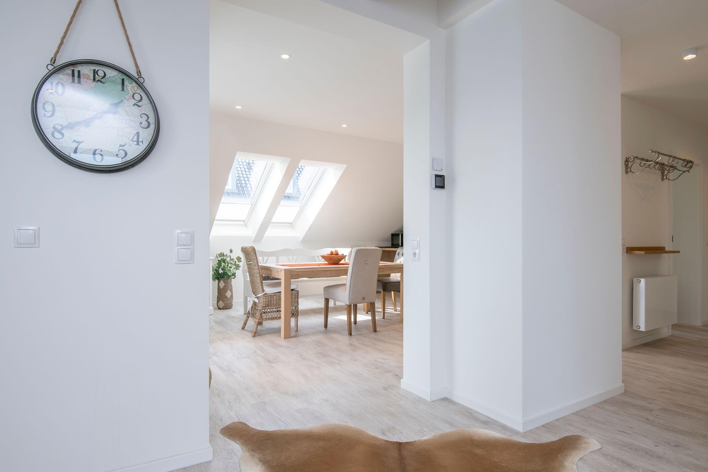 Gemütlich unter Dachschrägen begrüßt Sie das kuschelige Wohnzimmer mit hochwertiger Ausziehcouch (110x180 cm). Im separaten Schlafzimmer genießen Sie erholsame Nächte im komfortablen Boxspringbett (180x200 cm), ein Kleiderschrank nimmt Ihre Urlaubsgarderobe auf. Hell und großzügig schließt sich das stilvolle Designbad mit Annehmlichkeiten wie bodentiefer Wellnessdusche, Schminkspiegel und Fußbodenheizung dem überzeugenden Ambiente der Wohnung an. Die offene Küche ist toll ausgestattet, sodass Ihrem selbst kreierten Urlaubsdinner nichts im Wege steht. Hier helfen Annehmlichkeiten wie Cerankochfeld, Spülmaschine und Backofen in praktischer Arbeitshöhe. Die hochwertige Kaffeemaschine von De'Longhi sorgt für den täglichen Kaffeegenuss. Der großzügige Essbereich ist ideal für gesellige Frühstücksrunden oder ein heiteres Dinner mit Freunden. Ein direkter Zugang führt zum überdachten, hochwertig möblierten Balkon. Genießen Sie hier eine wunderbare Ruhe, mit Aussicht ins Grüne und auch ein Hauch von Ostsee schimmert in der Ferne. Ideal zum Durchatmen, Erholung pur!