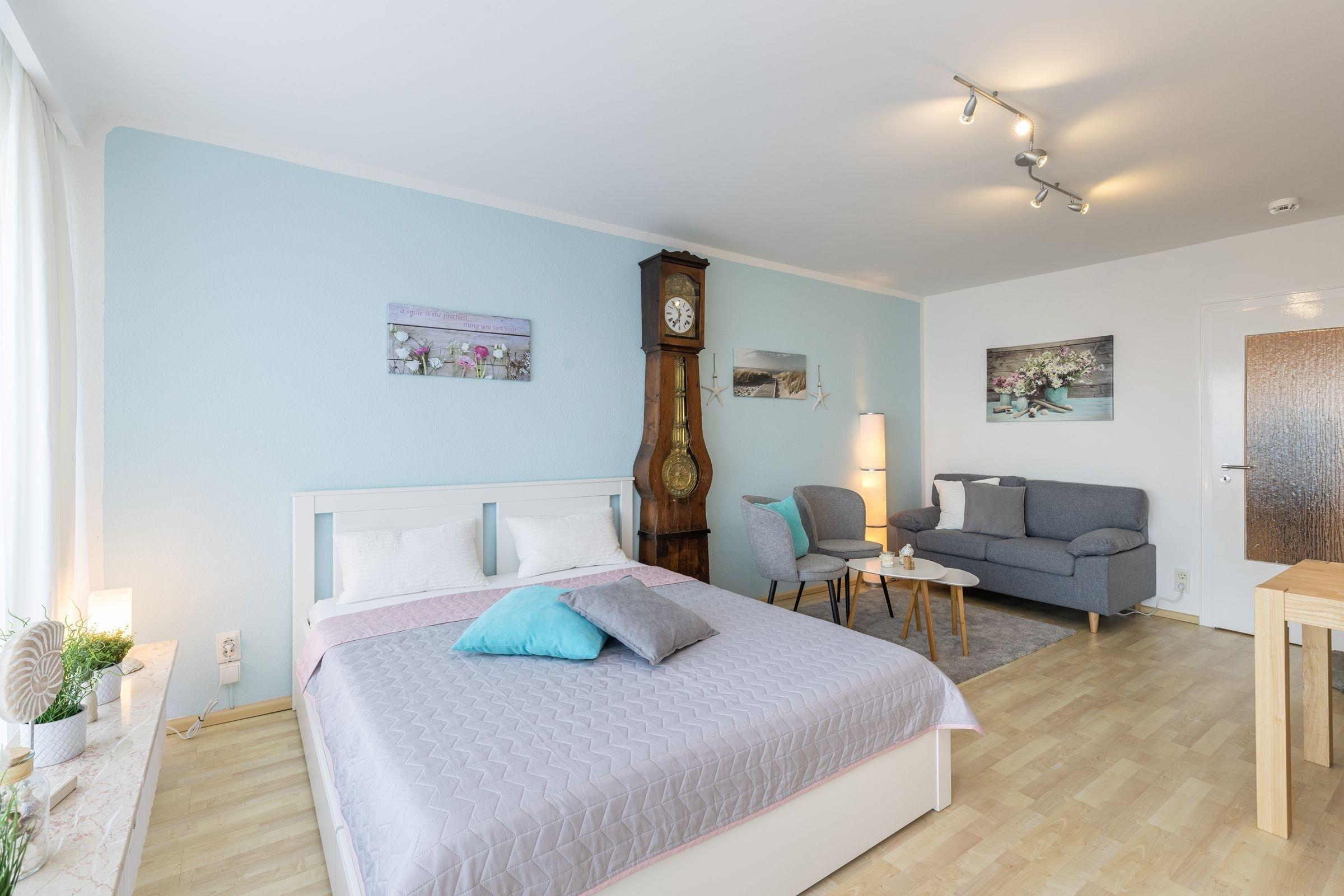 Die mit viel Liebe zum Detail eingerichtete 1-Zimmer-Ferienwohnung (ca. 37 qm) mit Top-Lage in erster Strandreihe bietet Platz für 2 Erwachsene. Der große, beheizte Außenpool lädt mit 18 Metern Länge von Mitte Mai bis Mitte September zum Schwimmen ein.